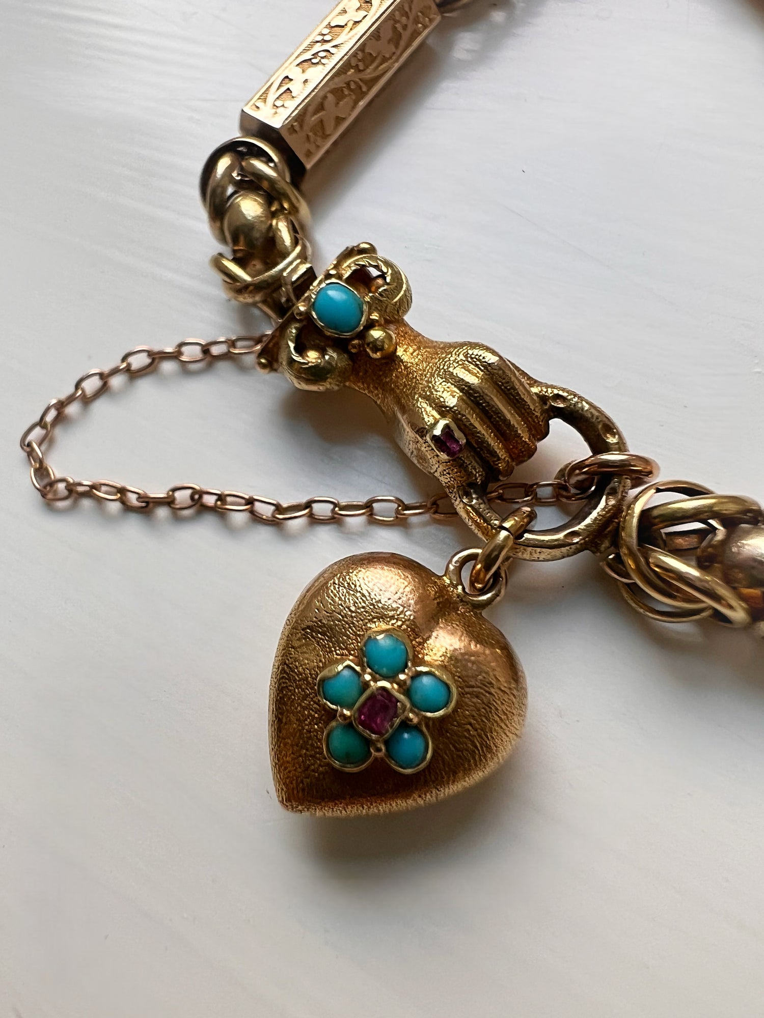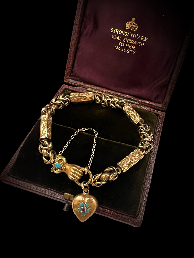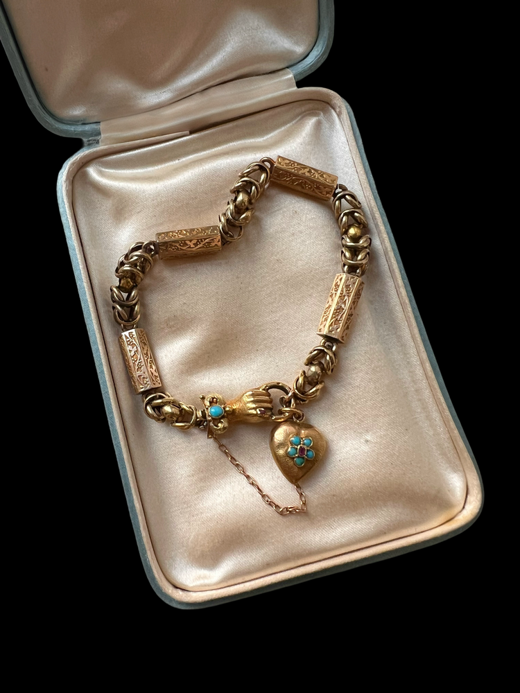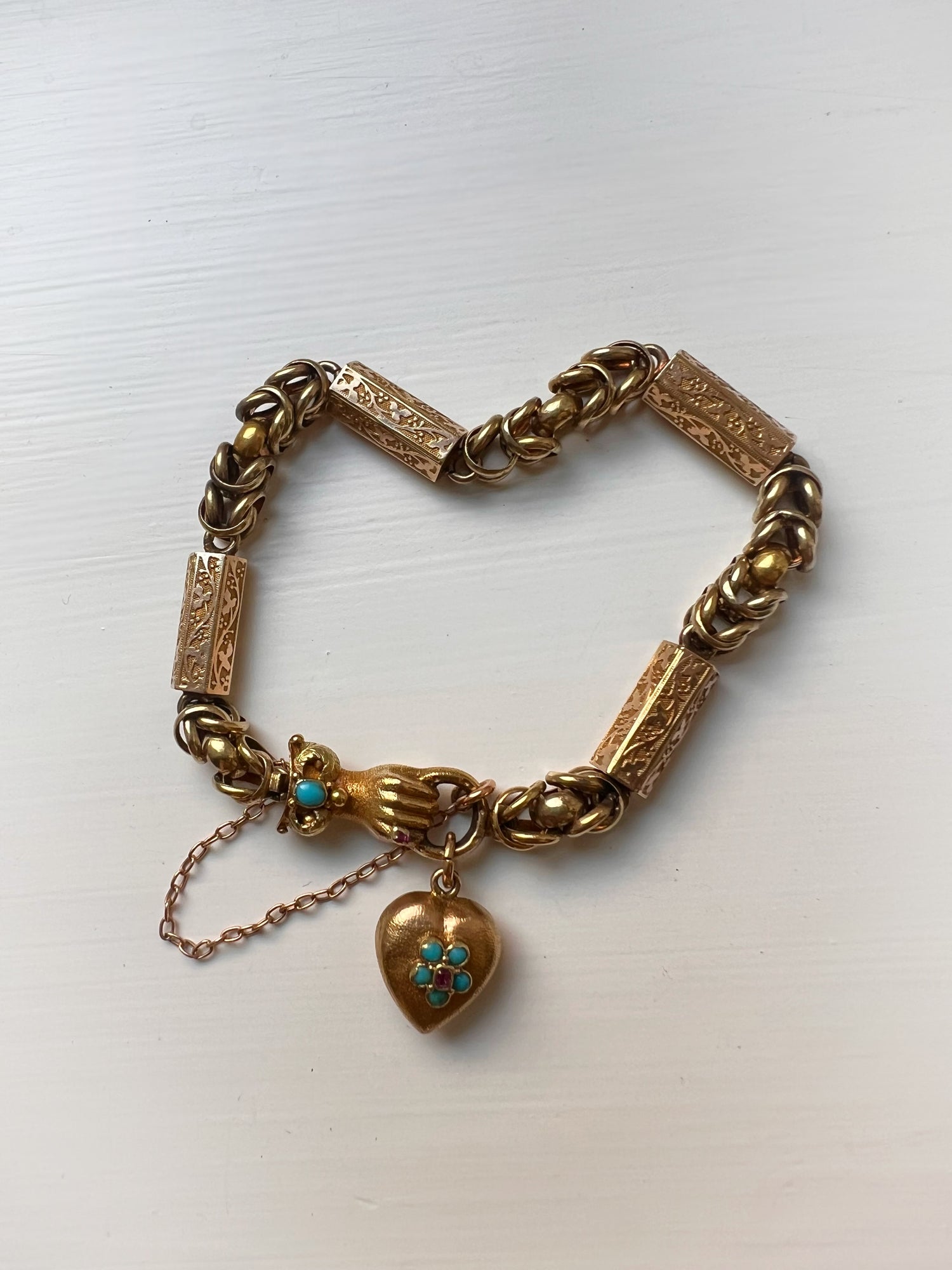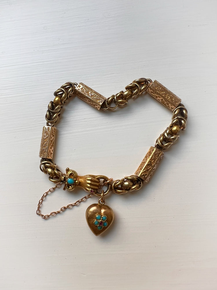 GEORGIAN 15CT GOLD BRACELET WITH A GEM SET HAND, SNAKE & HEART CLASP