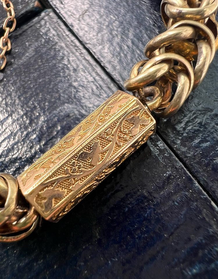 The chain link is an intricate 3D link alternating with floral chased hexagonal barrel links!