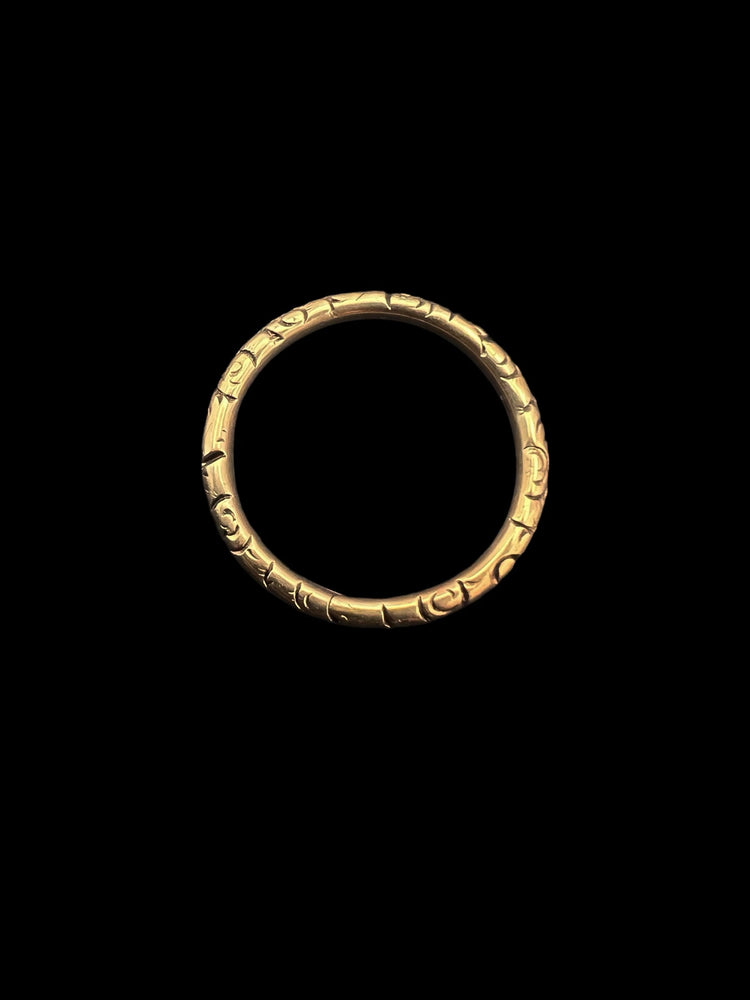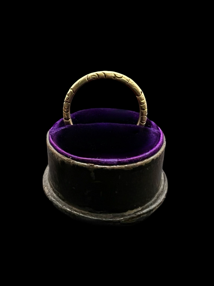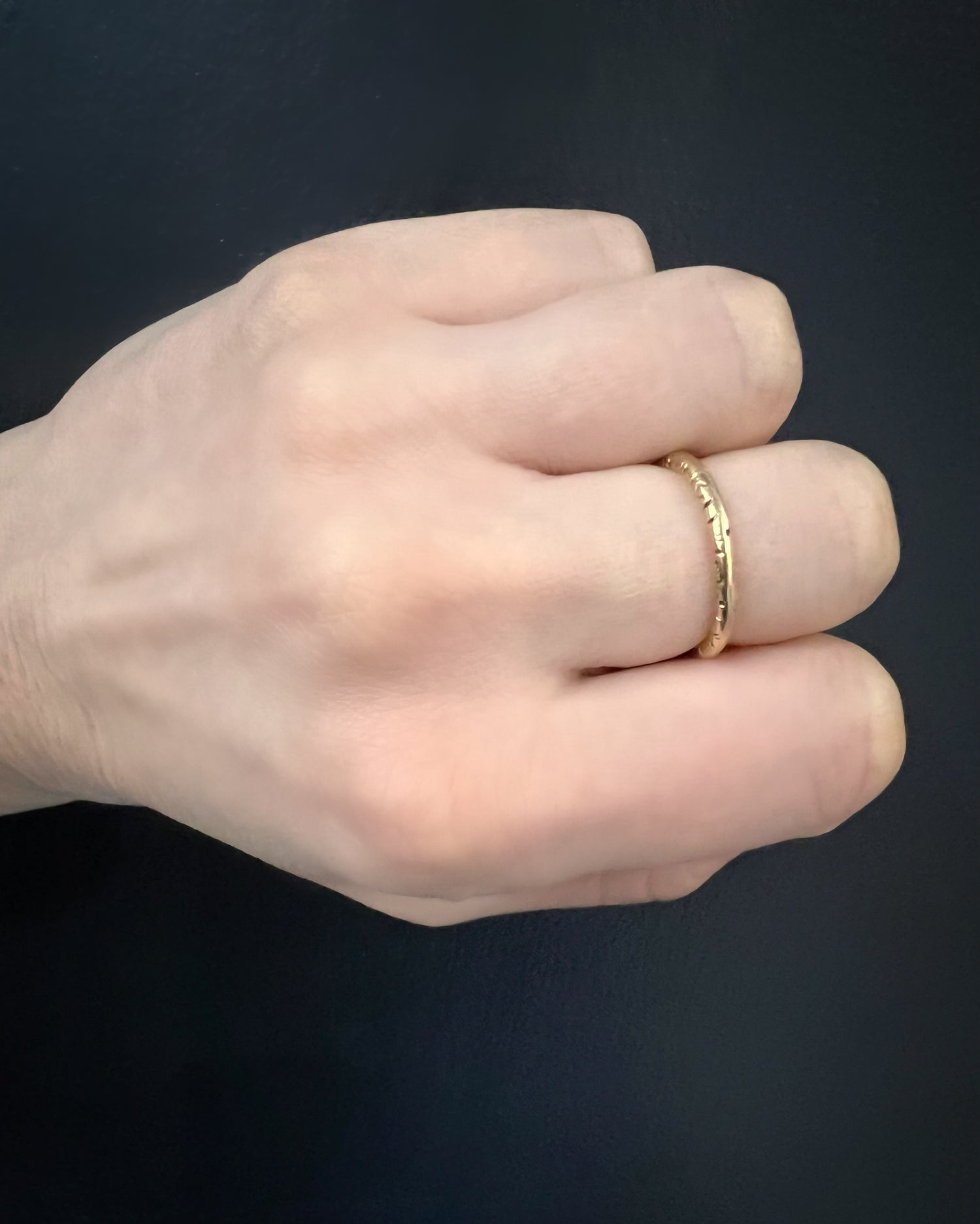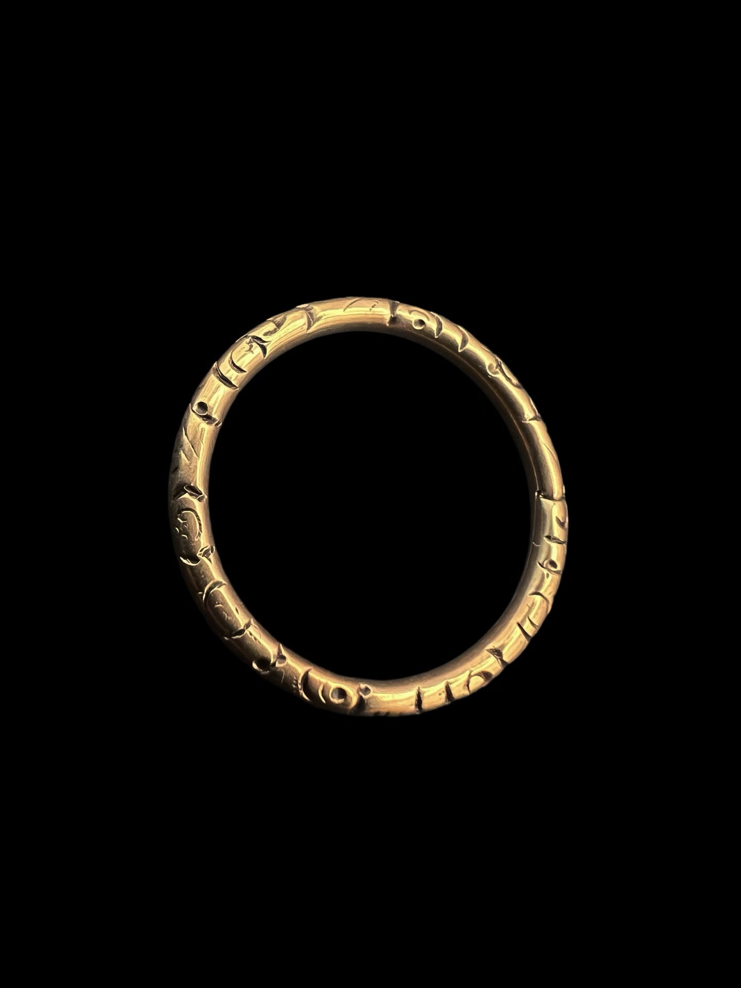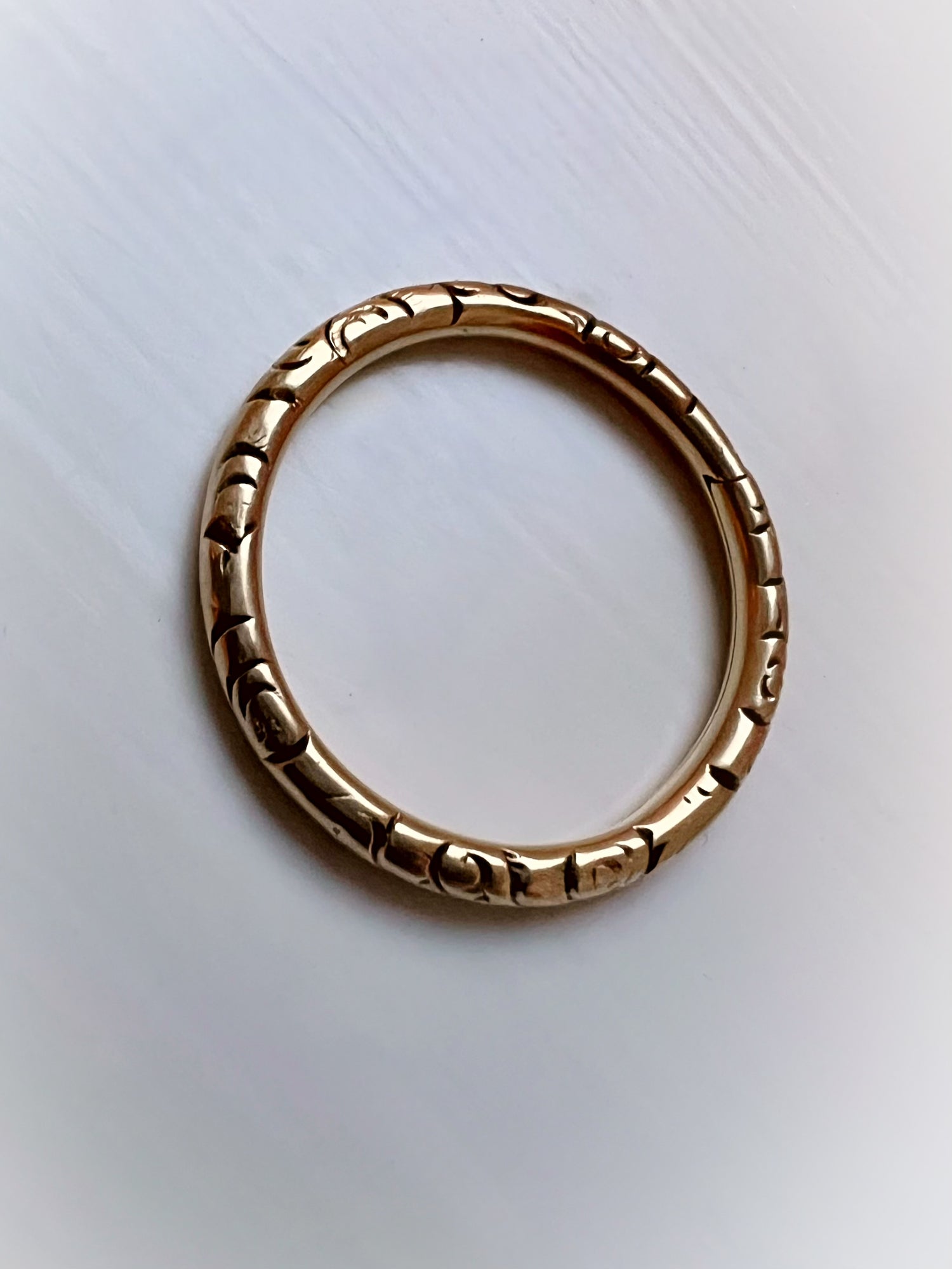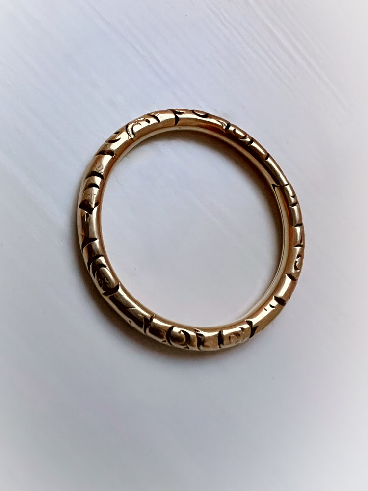 This slimmer than usual split ring has beautiful chasing that has been gently worn over time!
