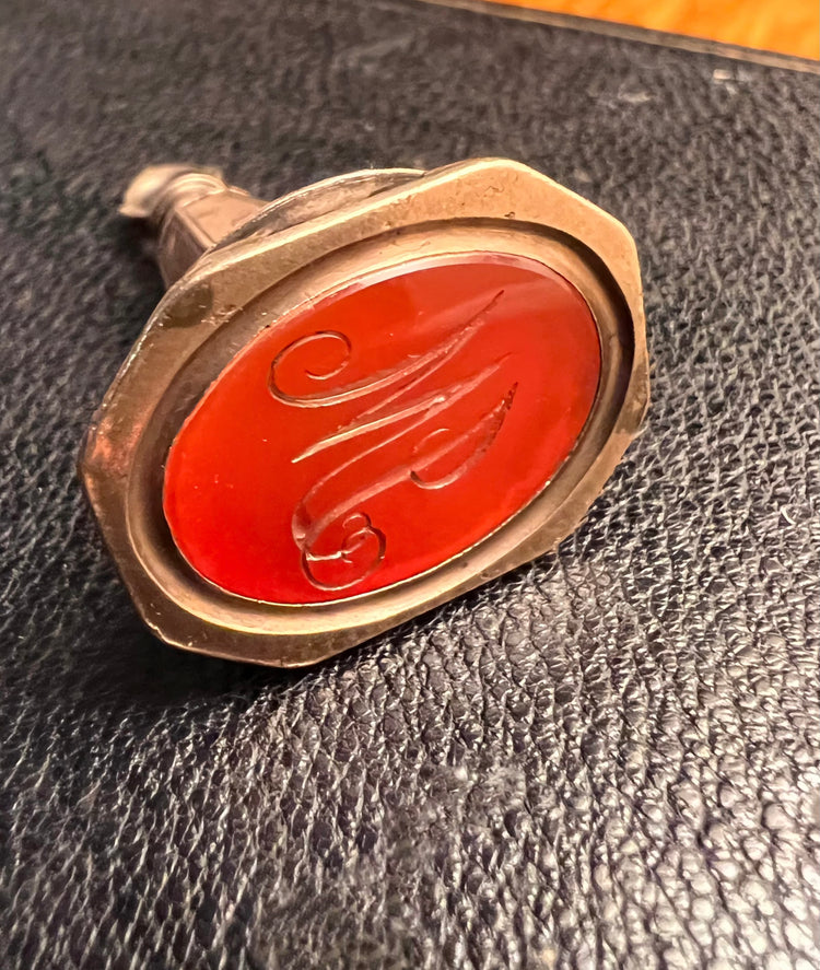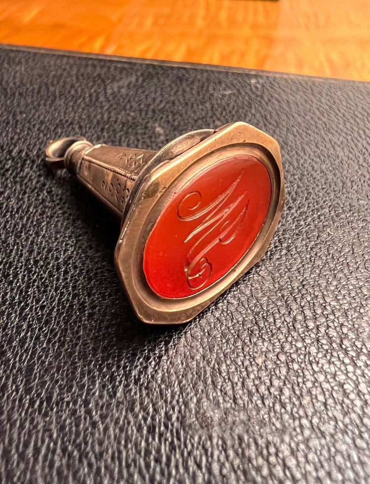 MATERIALS & FEATURES: 9ct gold / Carnelian, twisting fob