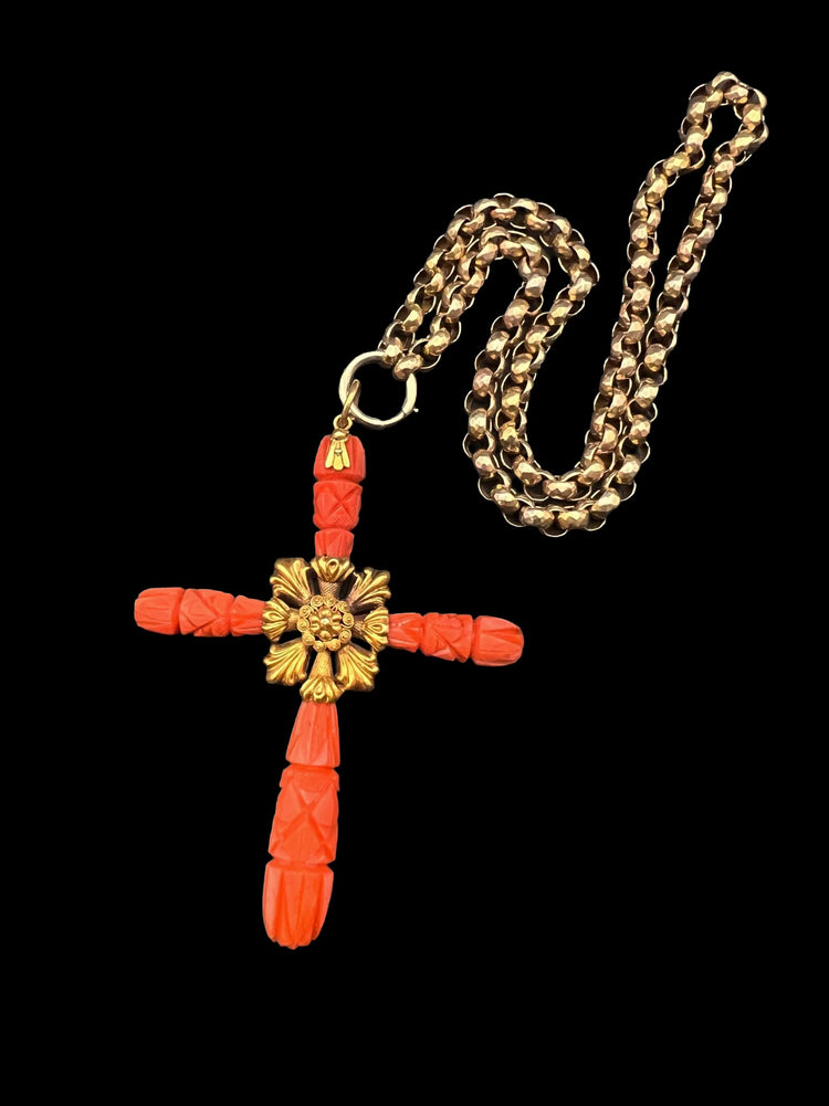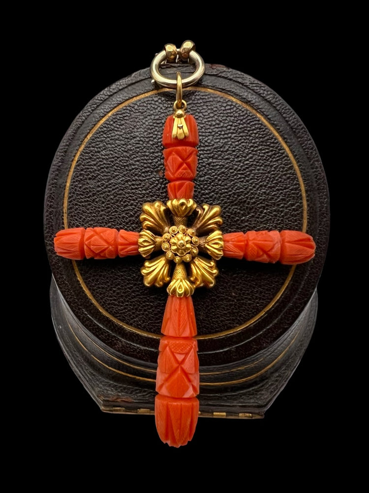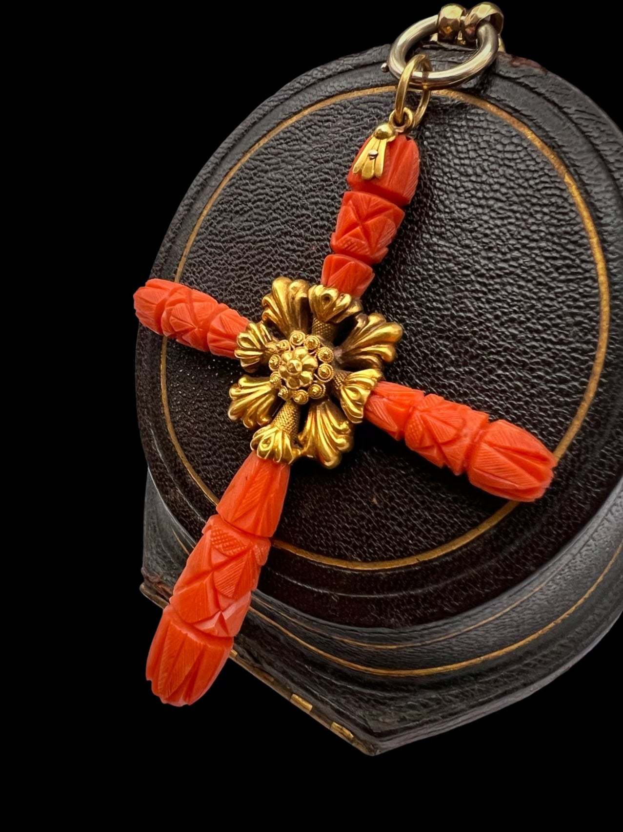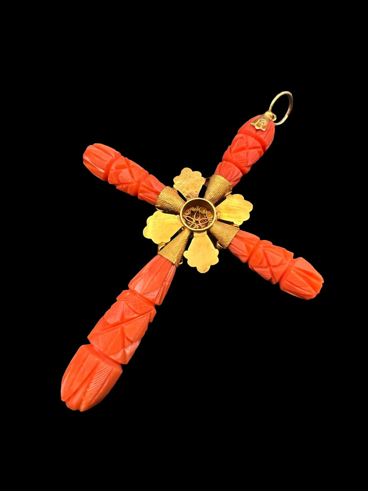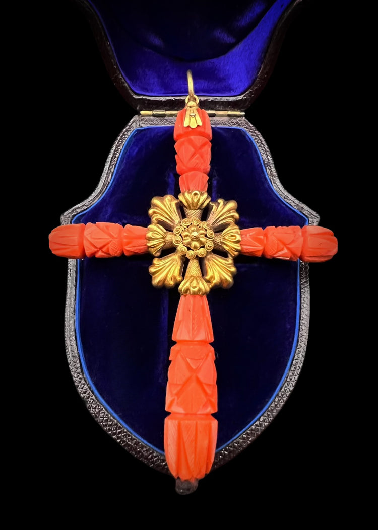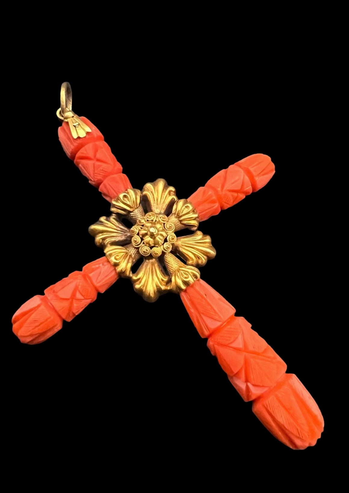 Circa 1830; the cross is made of beautifully carved bright orange tapered corals which all join at the 15ct gold central foliate boss.