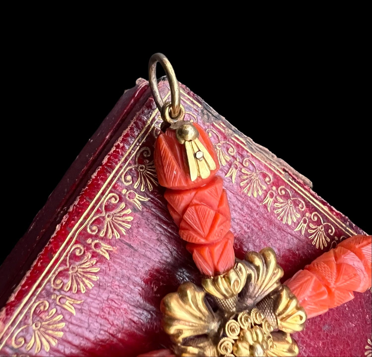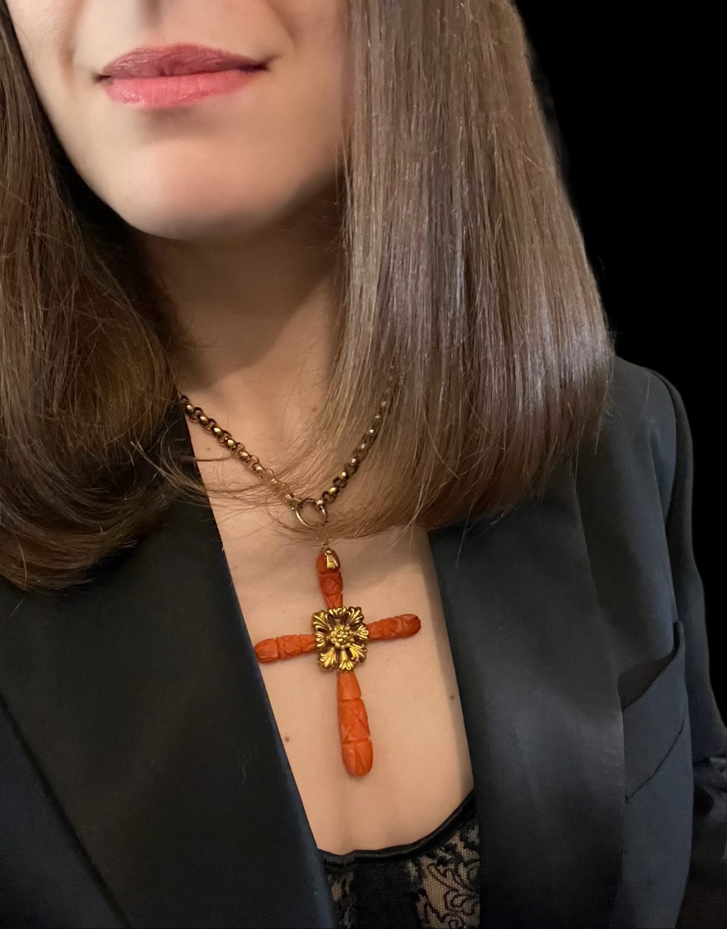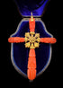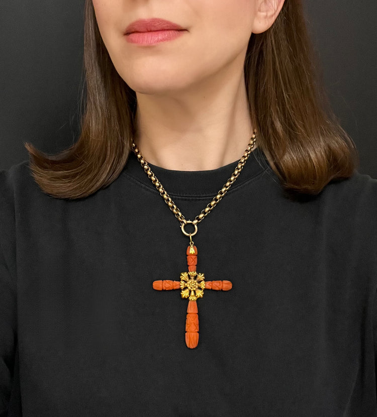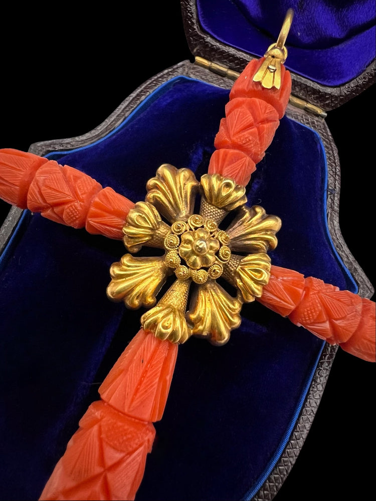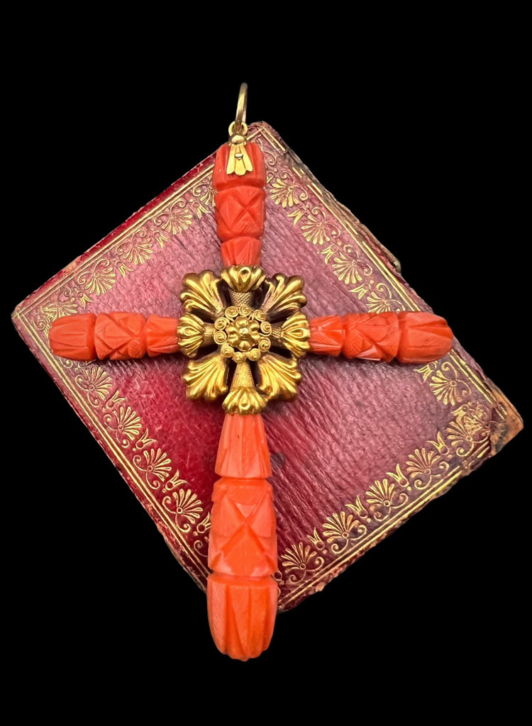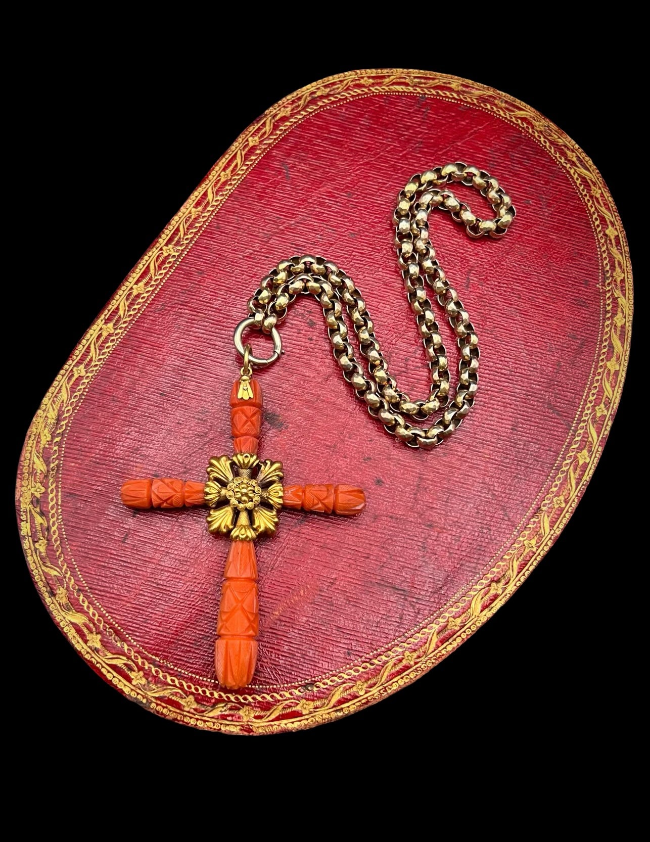 Circa 1830; the cross is made of beautifully carved bright orange tapered corals which all join at the 15ct gold central foliate boss.