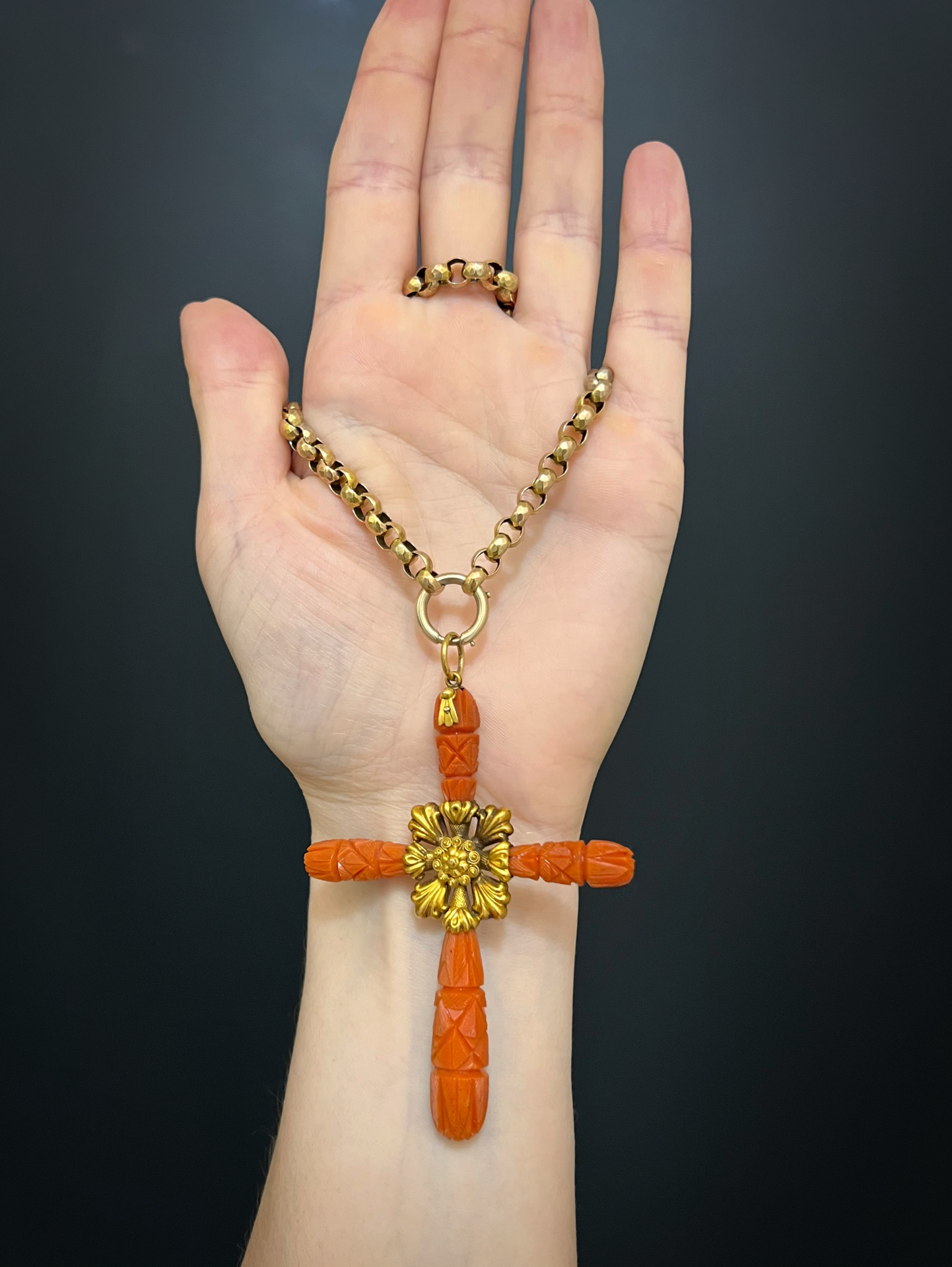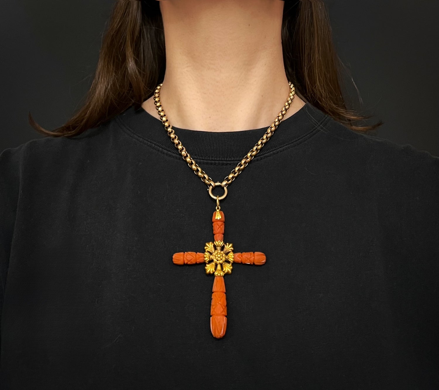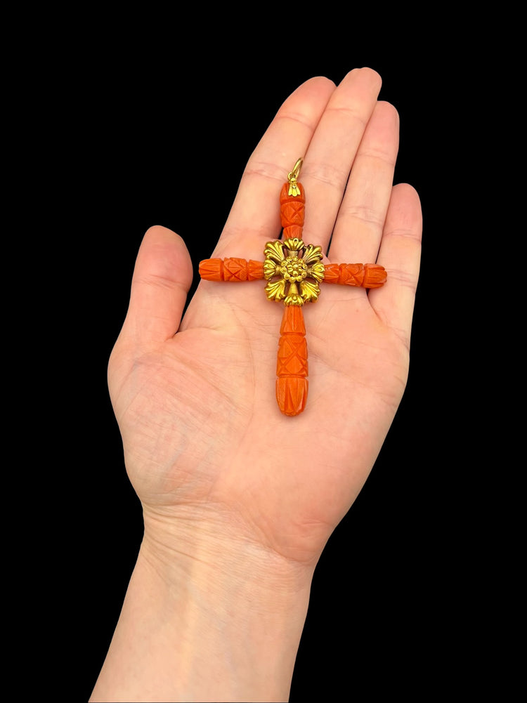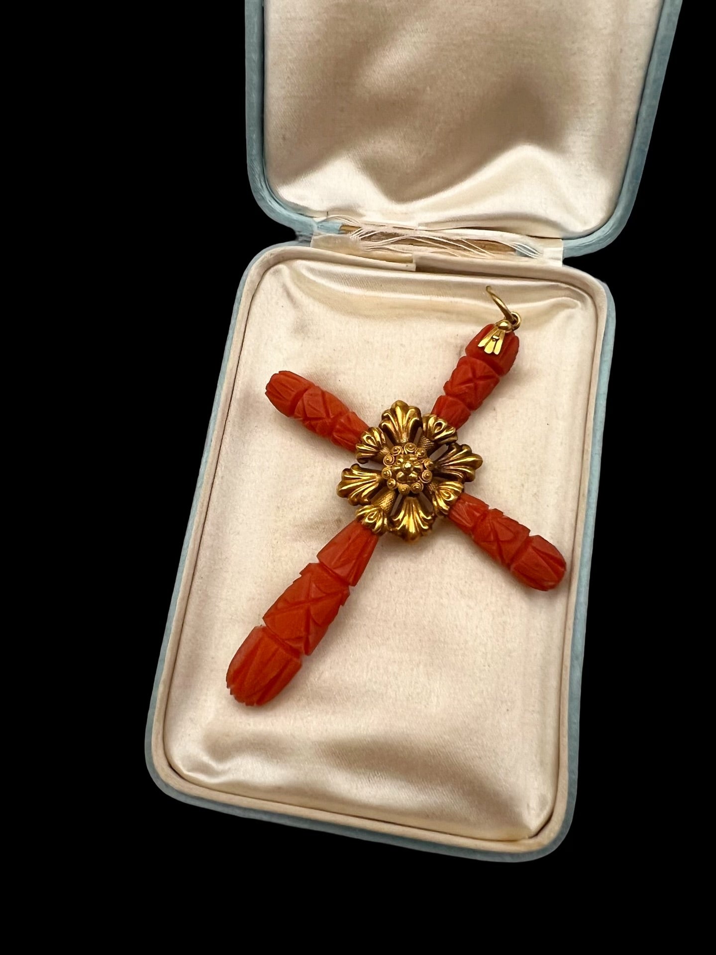 GEORGIAN CARVED CORAL & GOLD LARGE CROSS PENDANT
