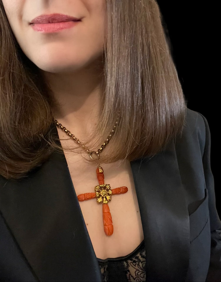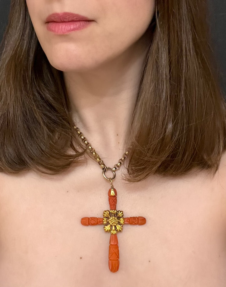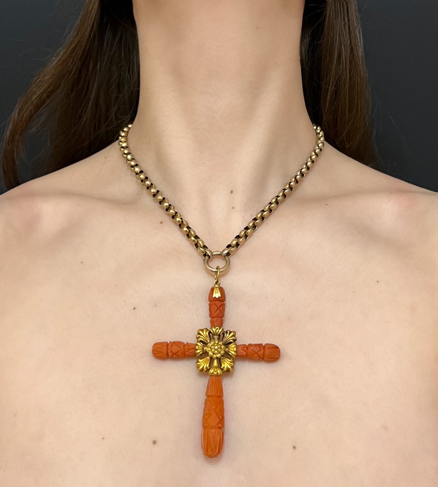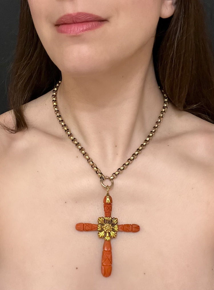 GEORGIAN CARVED CORAL & GOLD LARGE CROSS PENDANT
