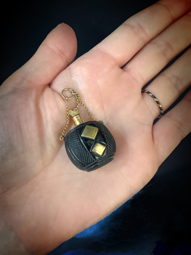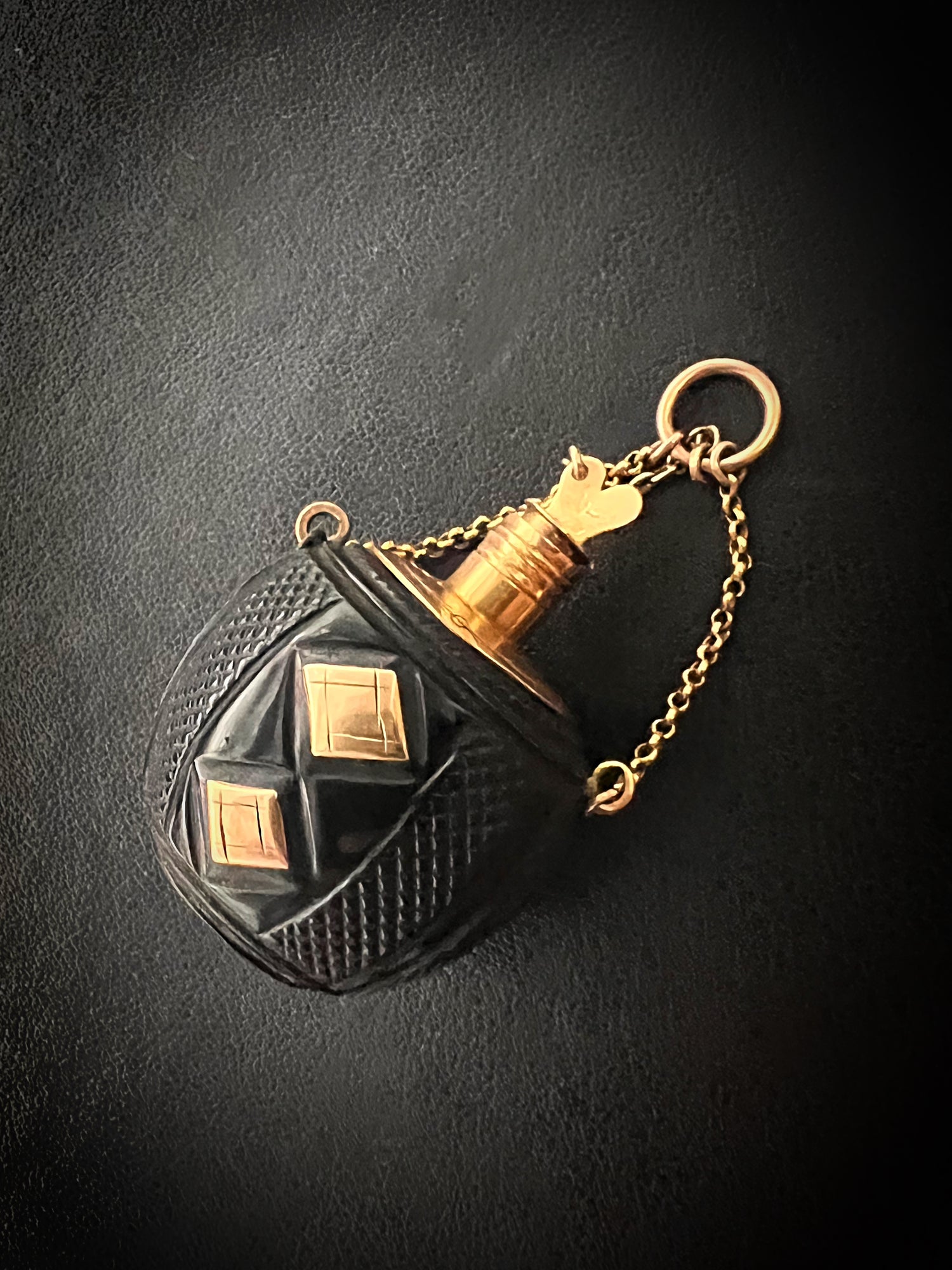 This is a stunning scent bottle with fine cross hatch carving and gold diamond shape inlays.
