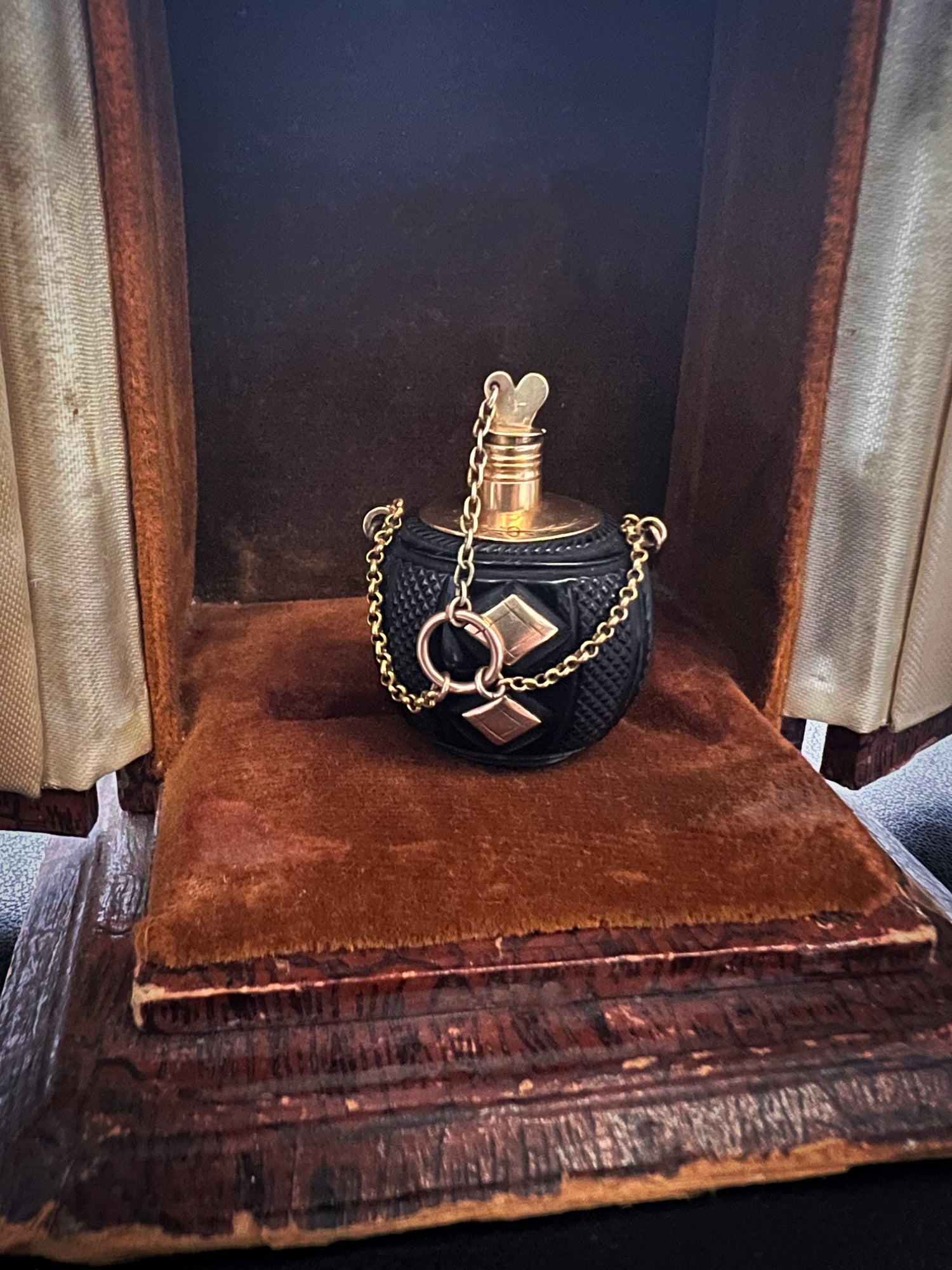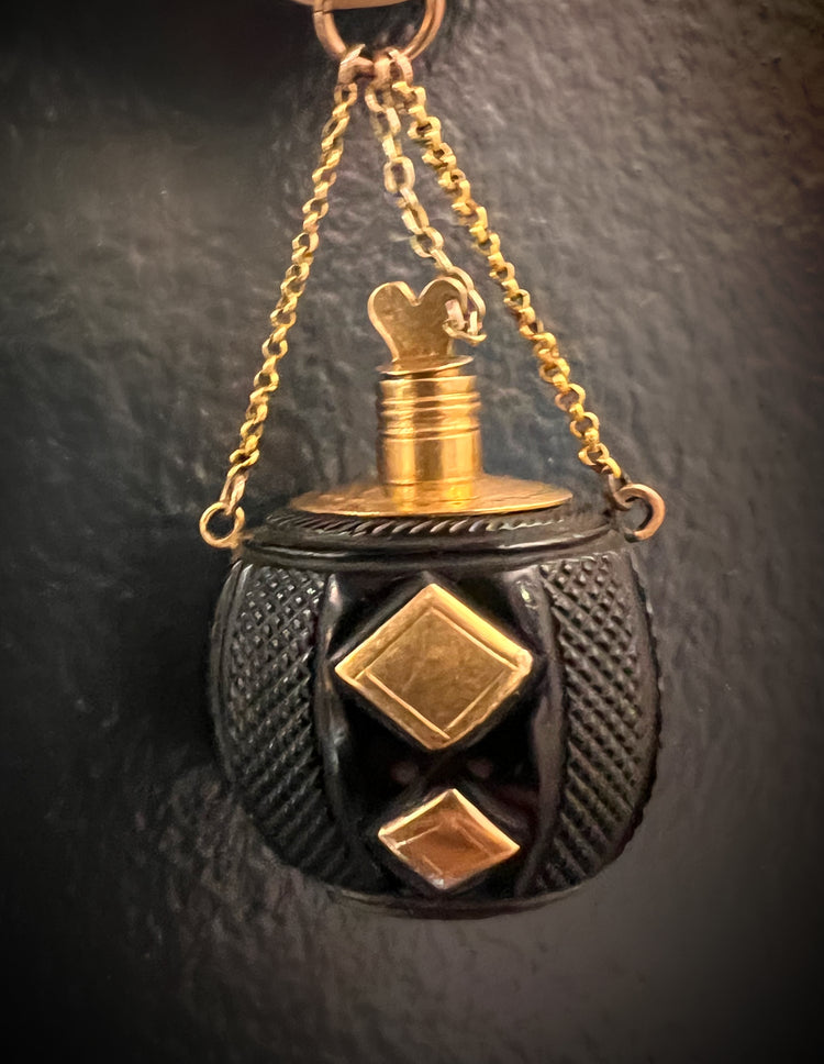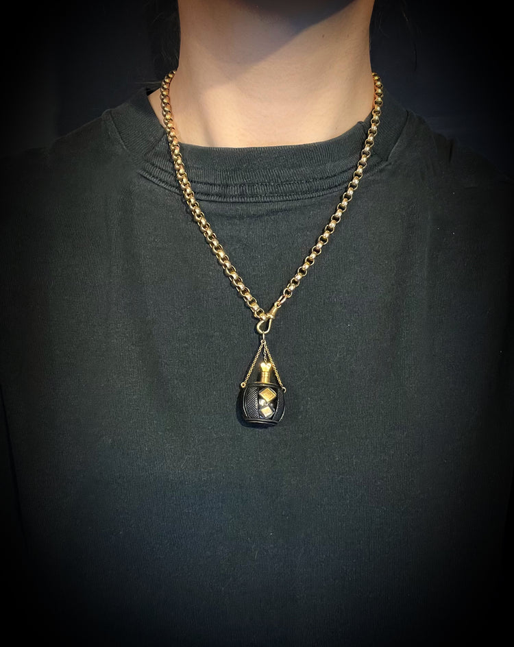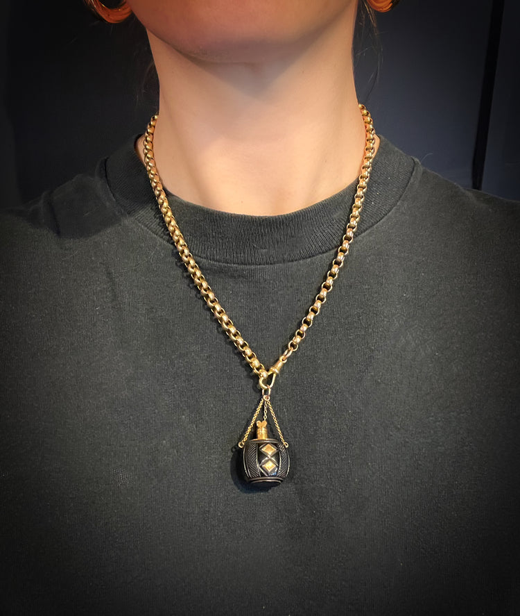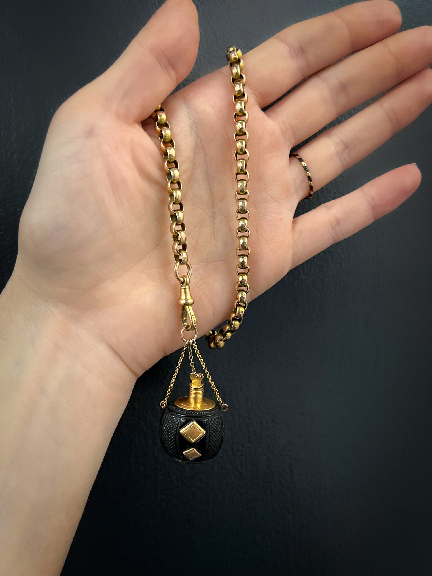 The bottle hangs from a high carat Georgian fine belcher chain.