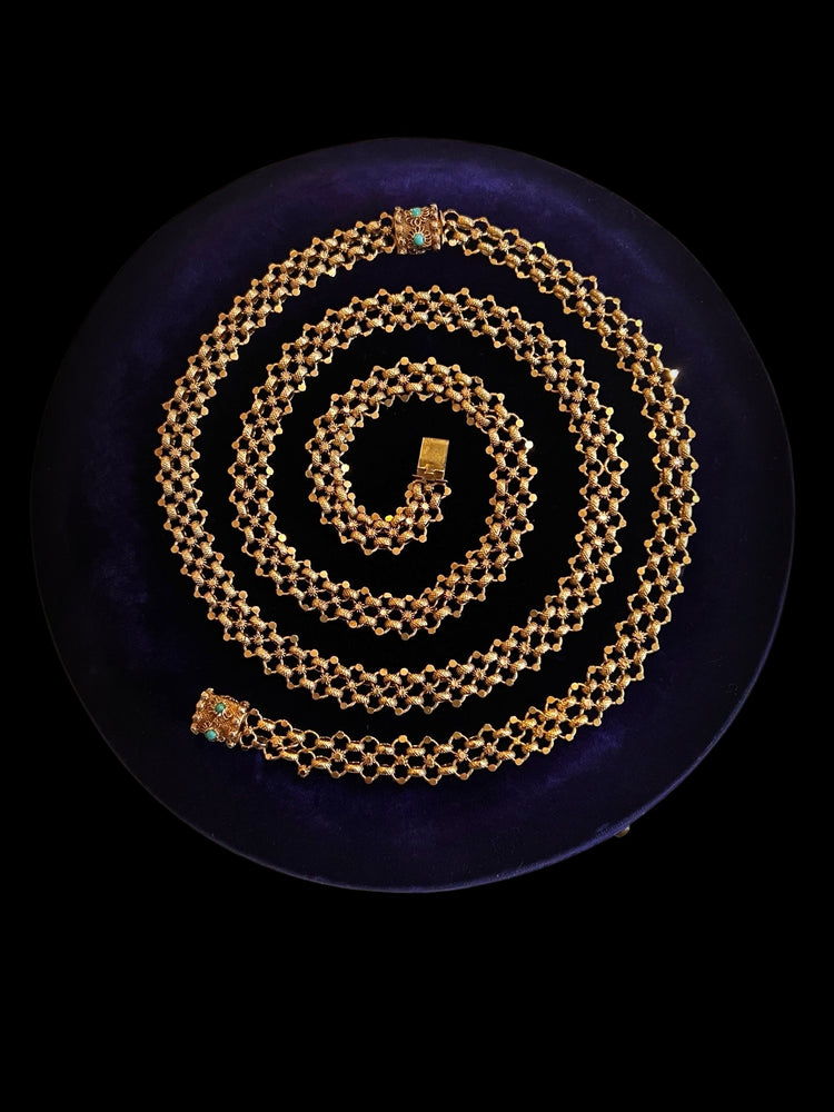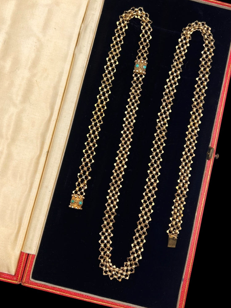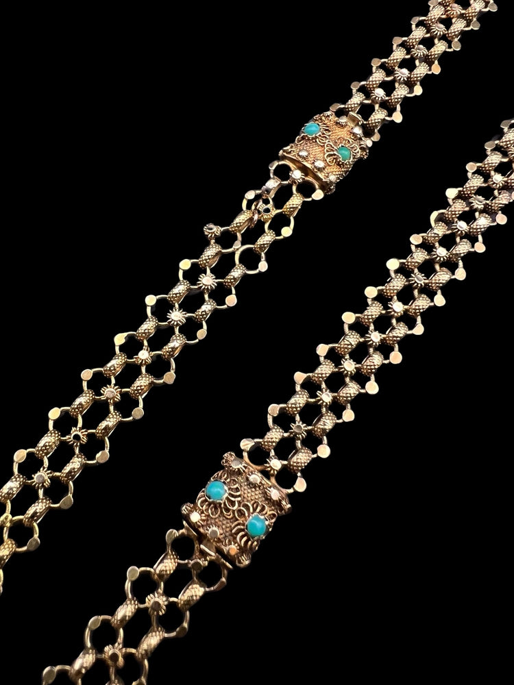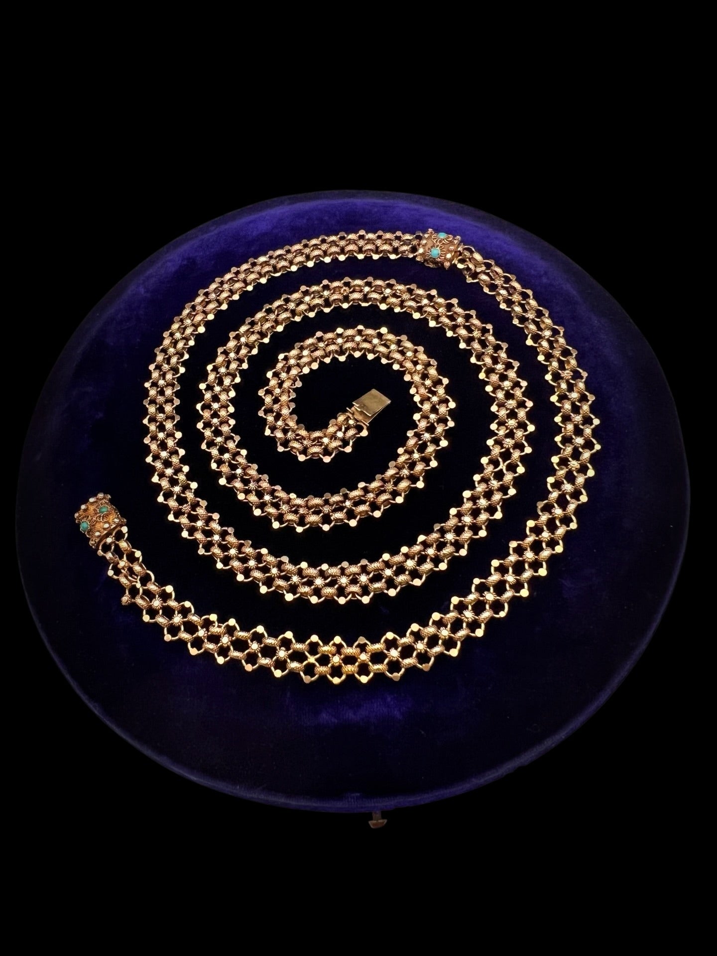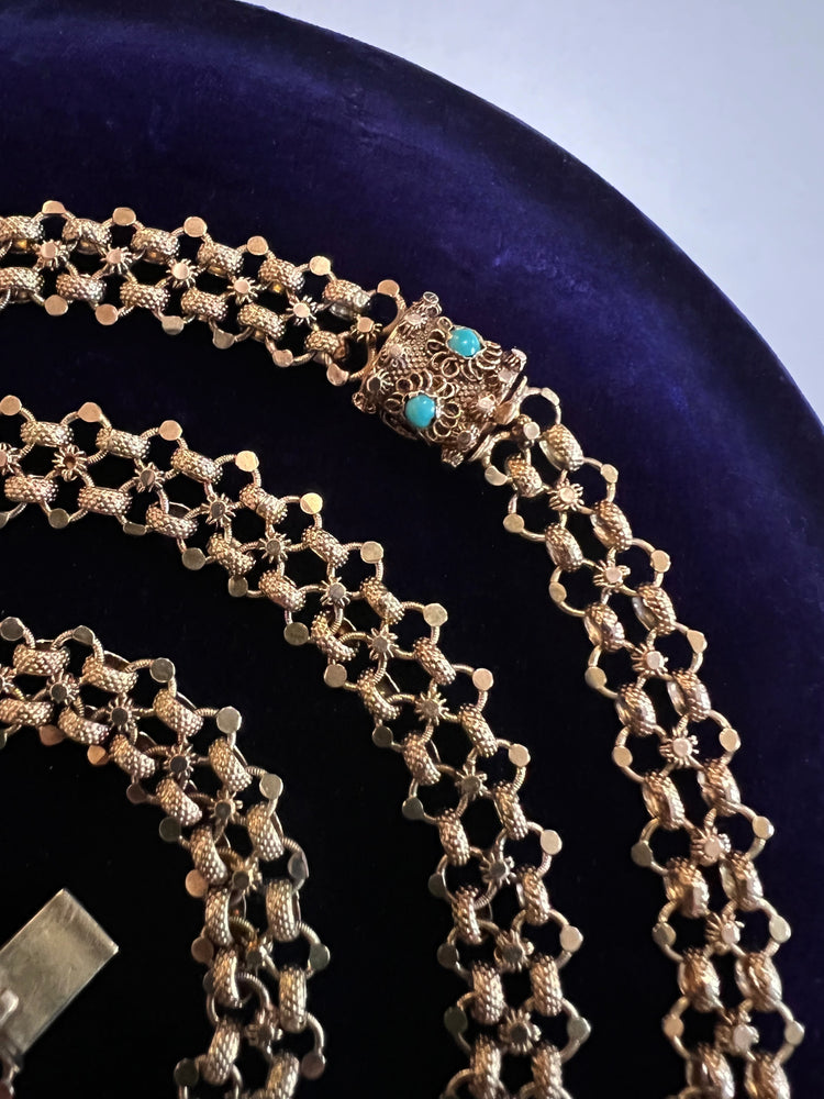 An absolutely stunning late Georgian fancy double belcher chain with double filigree and turquoise clasp.