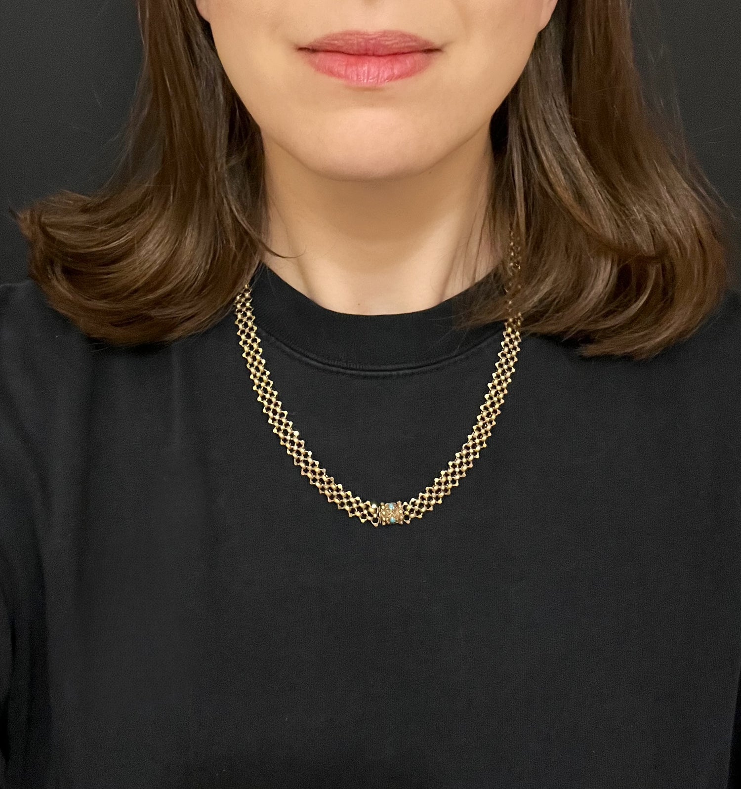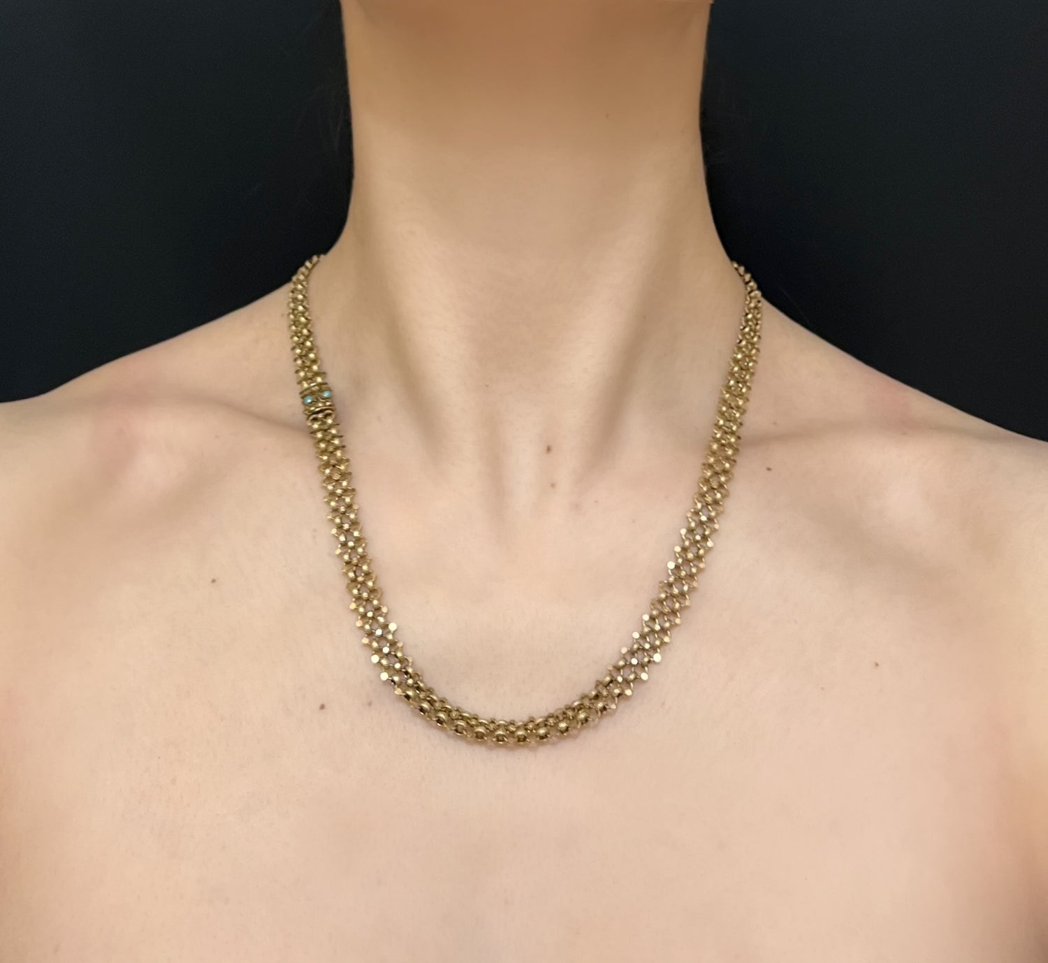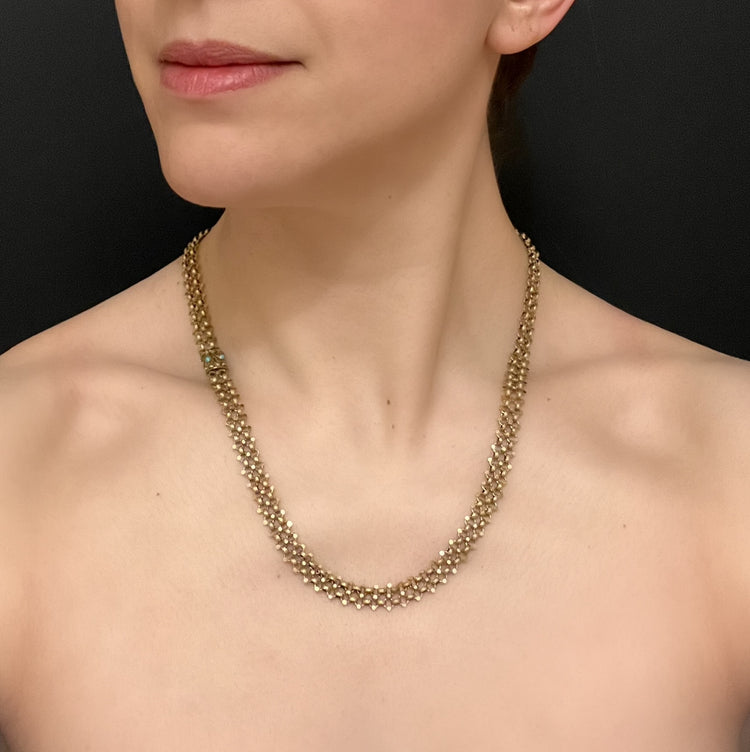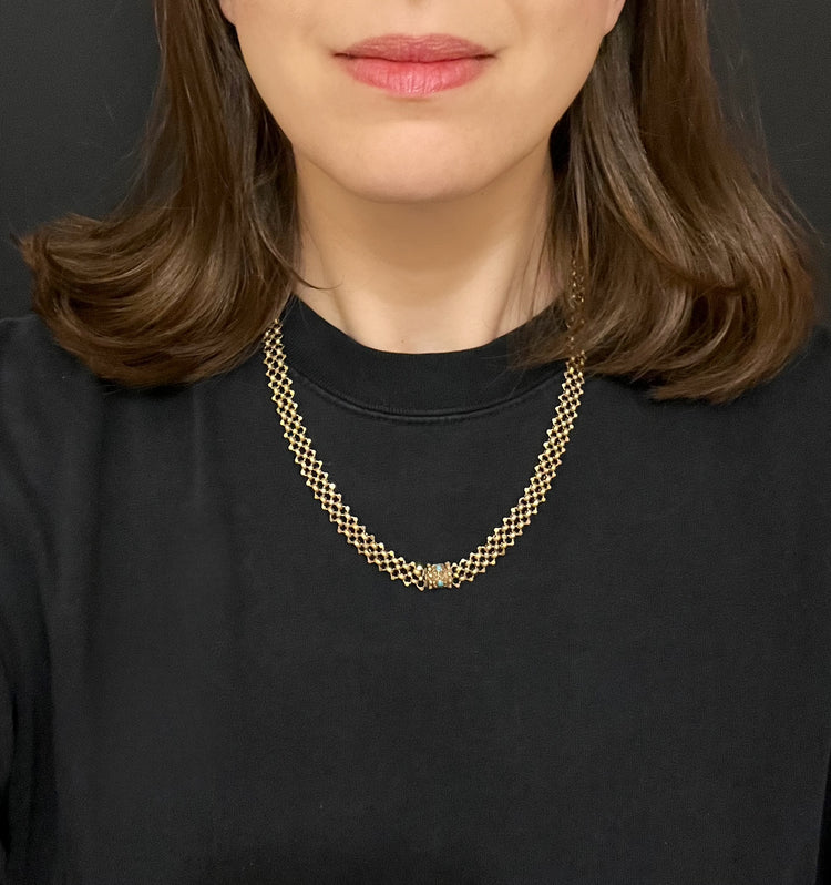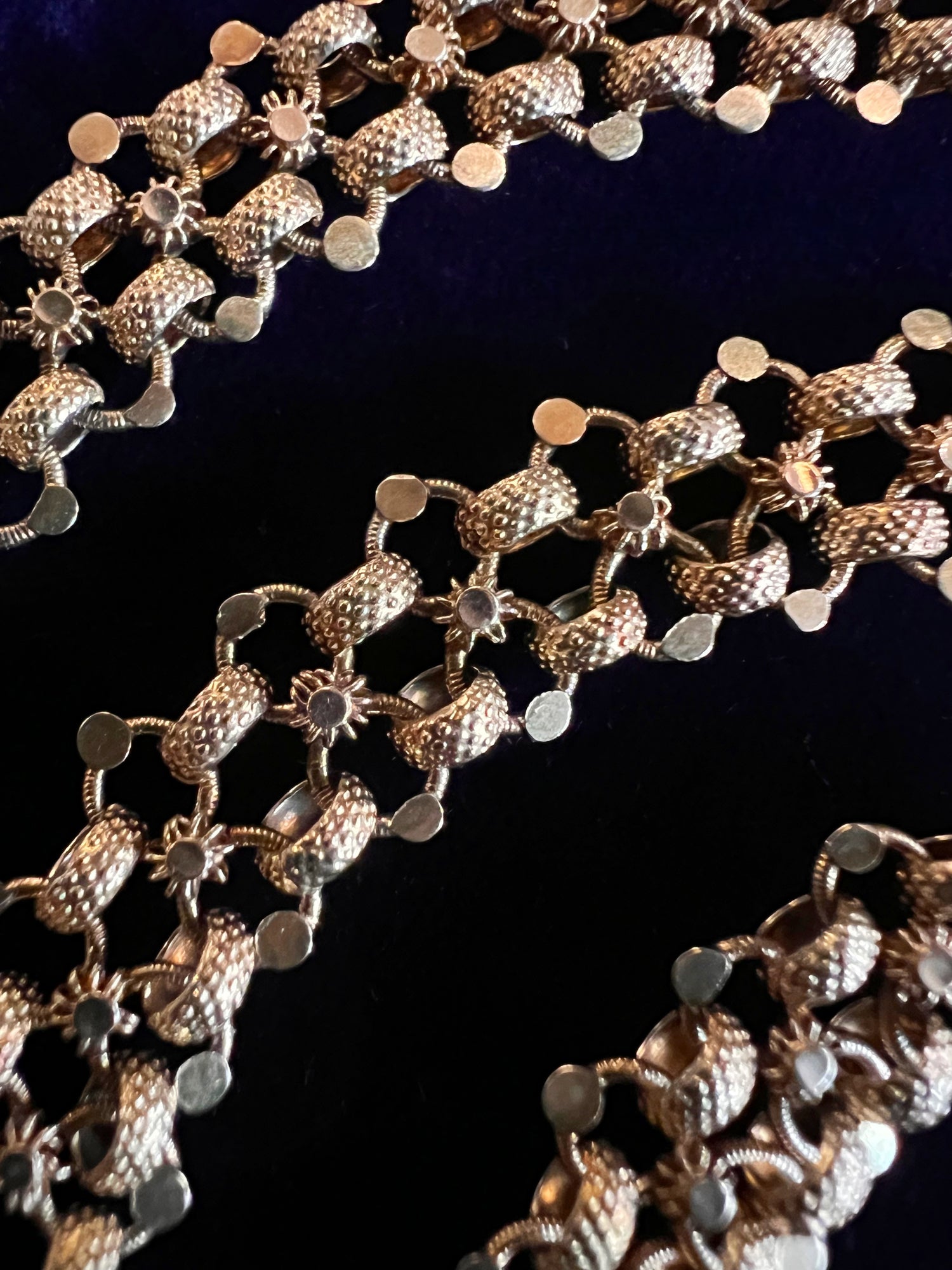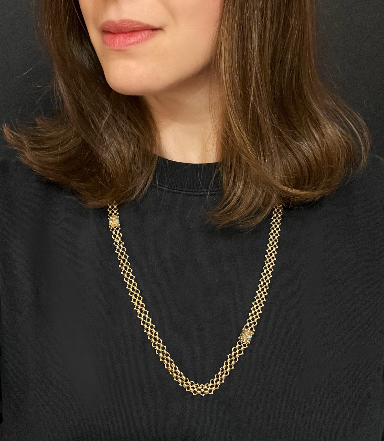 The fine belcher links have a crosshatch pattern and are joined by tiny star links.