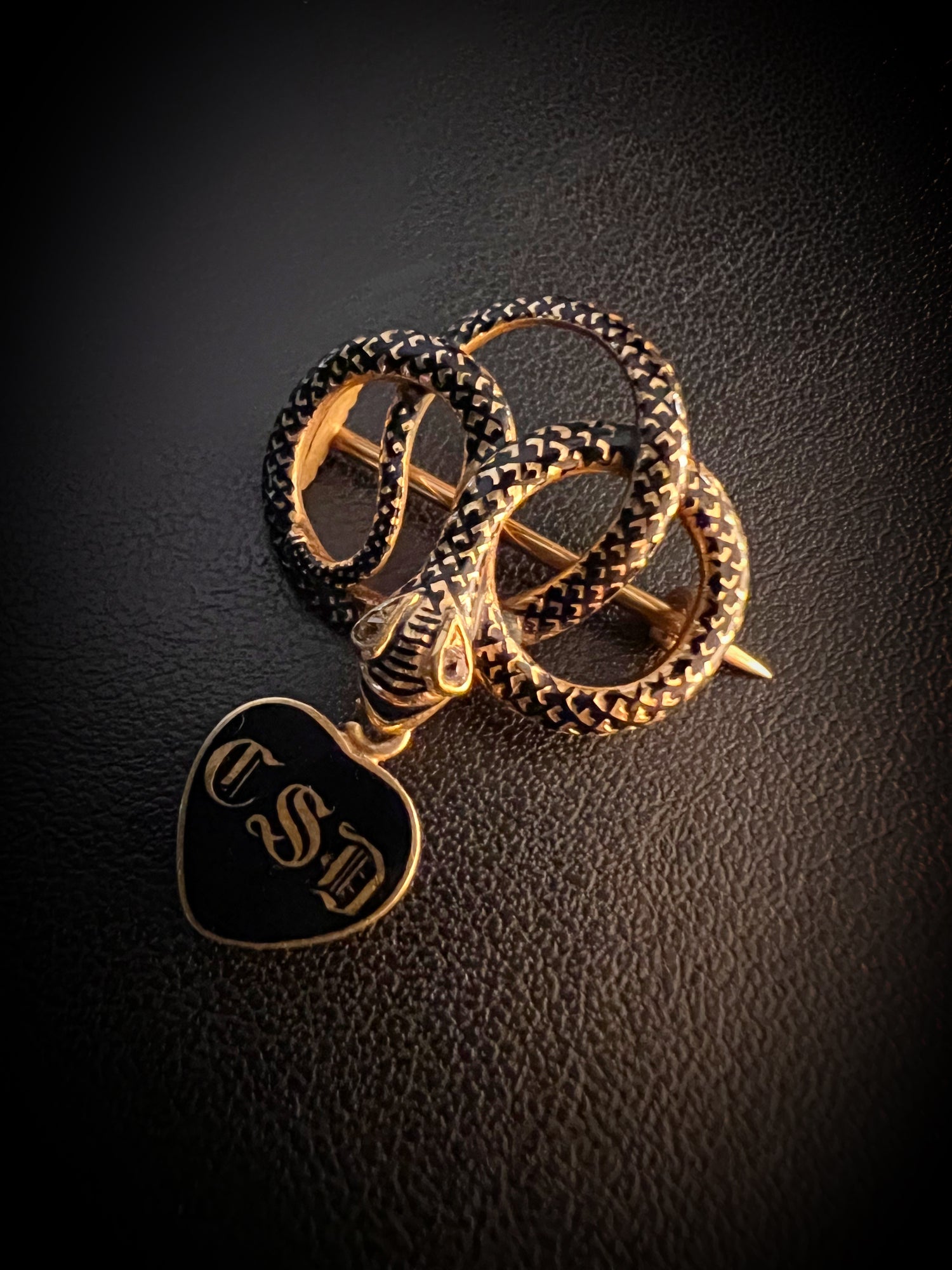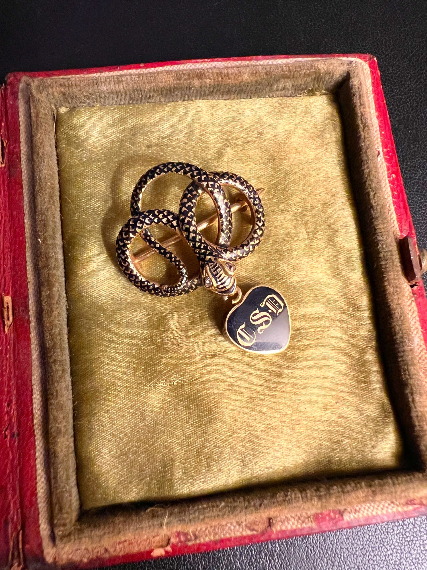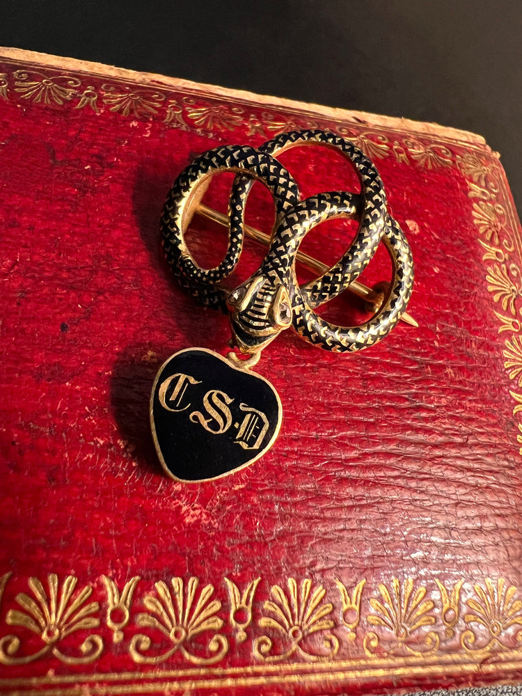 A Georgian mourning snake brooch with wonderful black crosshatch enamel.