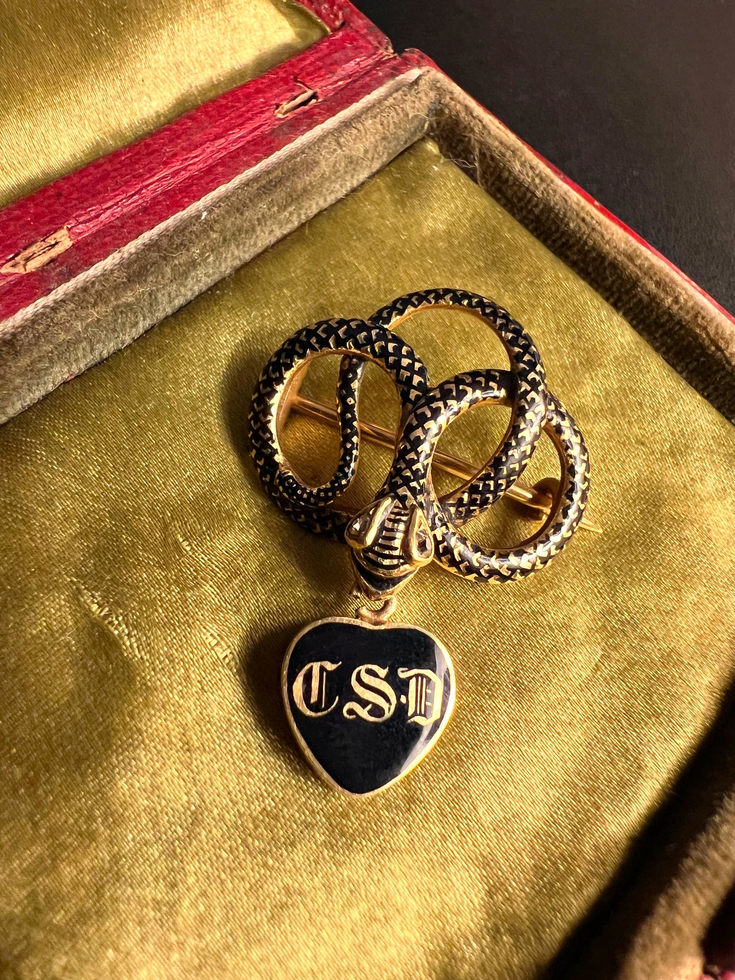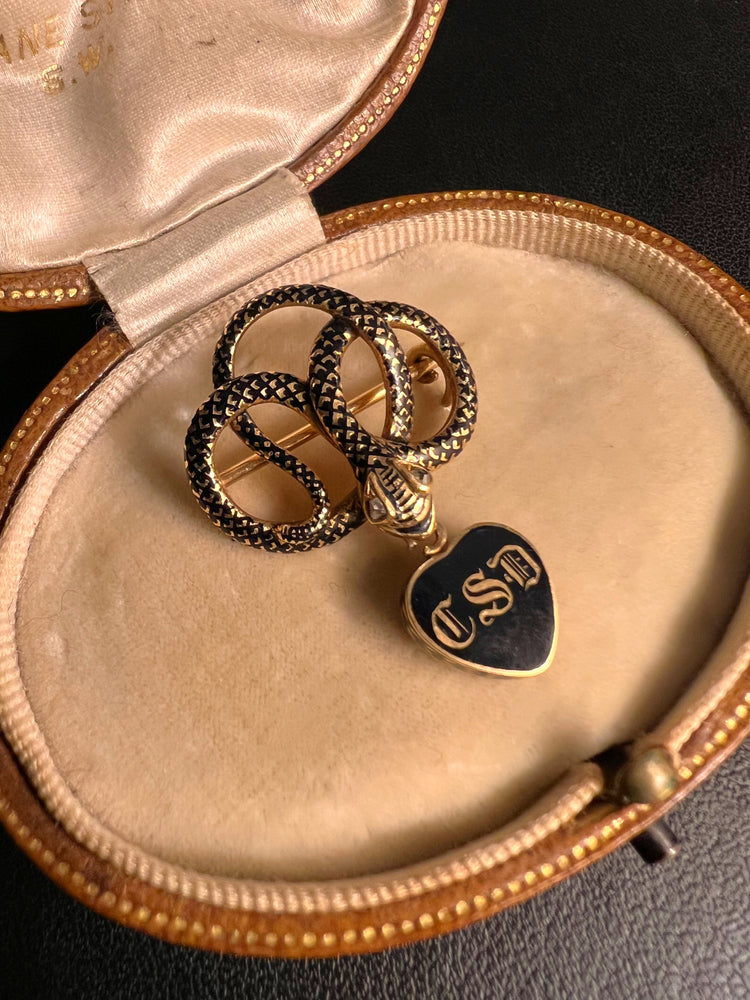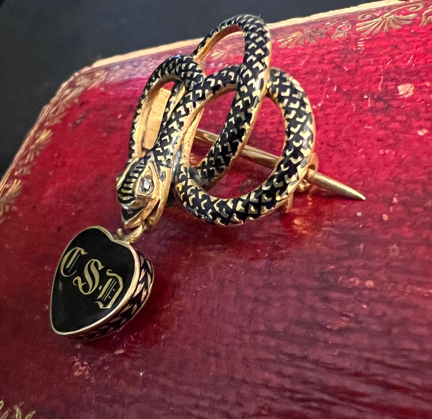 A Georgian mourning snake brooch with wonderful black crosshatch enamel.