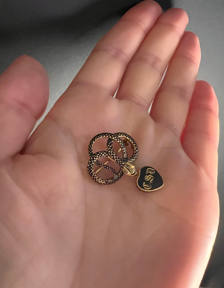 A black heart hangs form the snakes mouth inscribed with the initials ‘CSD’