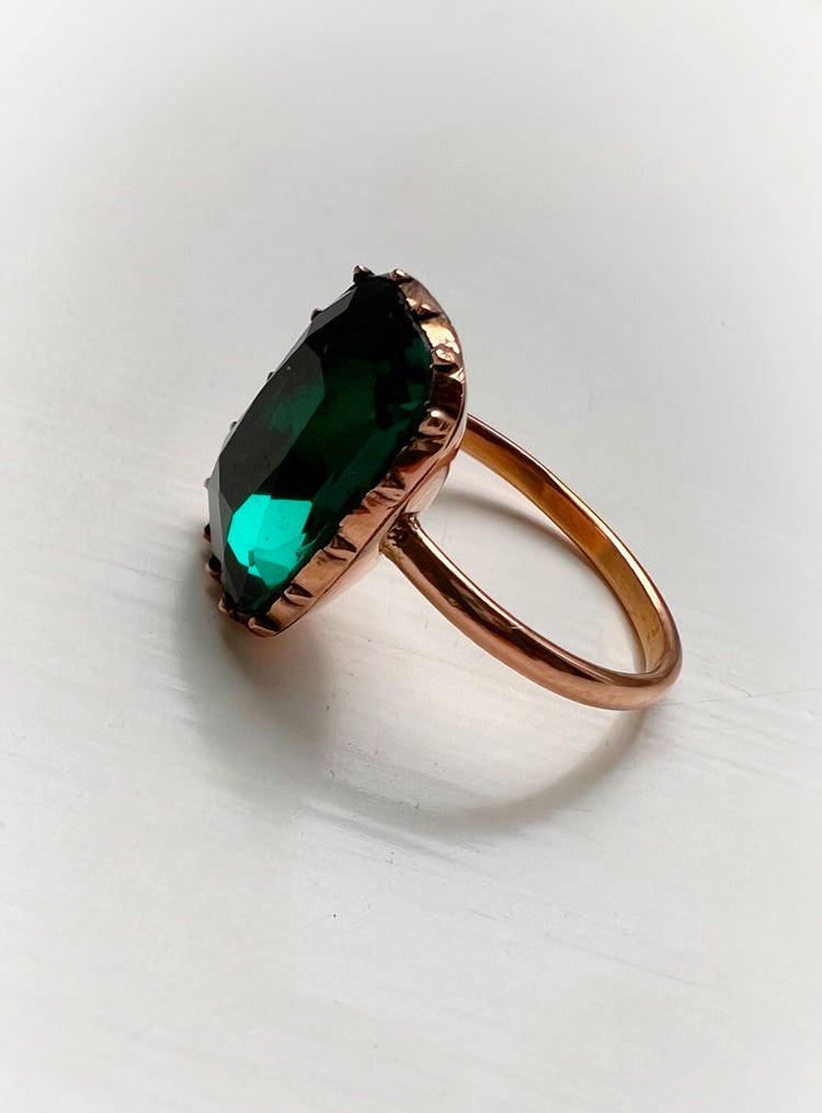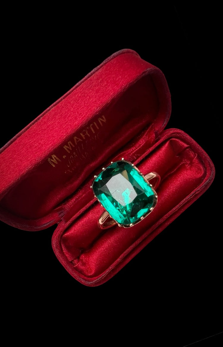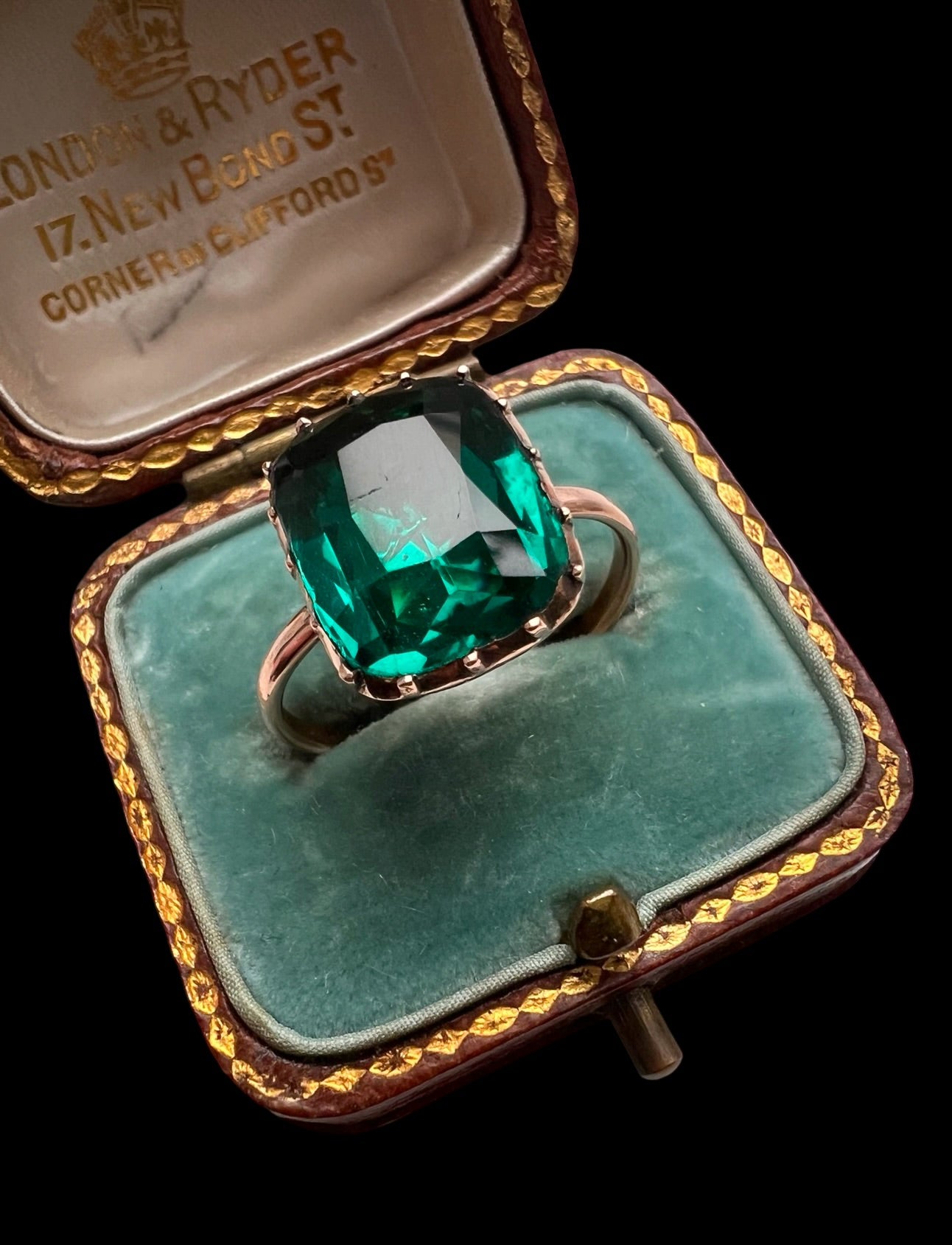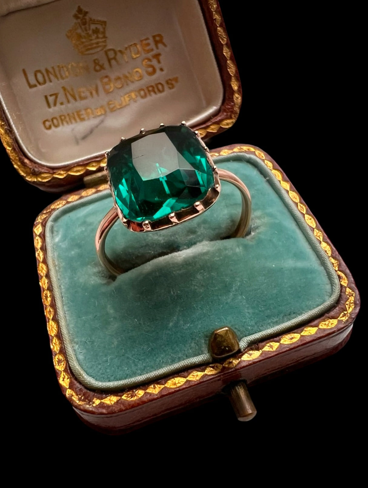 The chunky cushion cut green paste stone is in great condition, and a wonderful deep emerald green.
