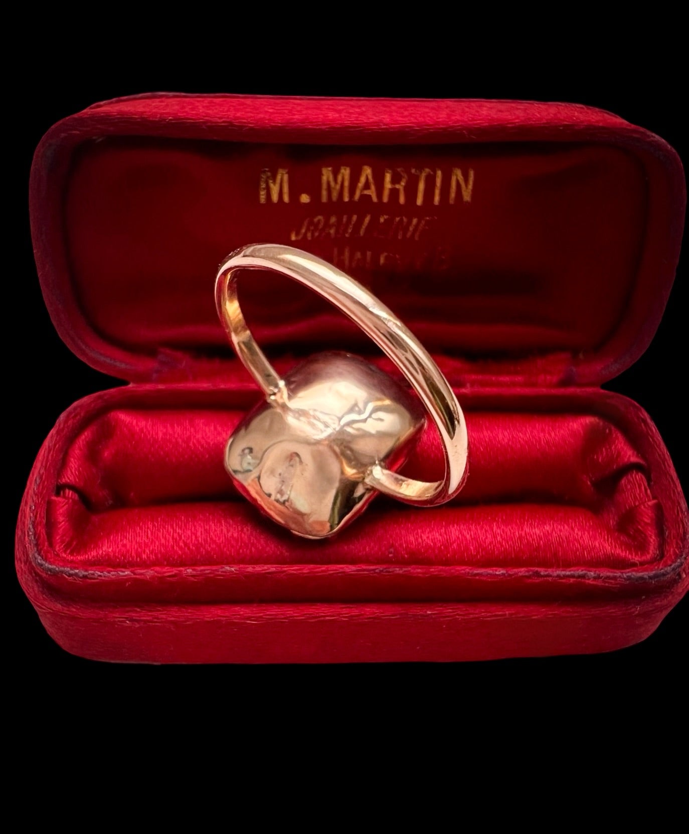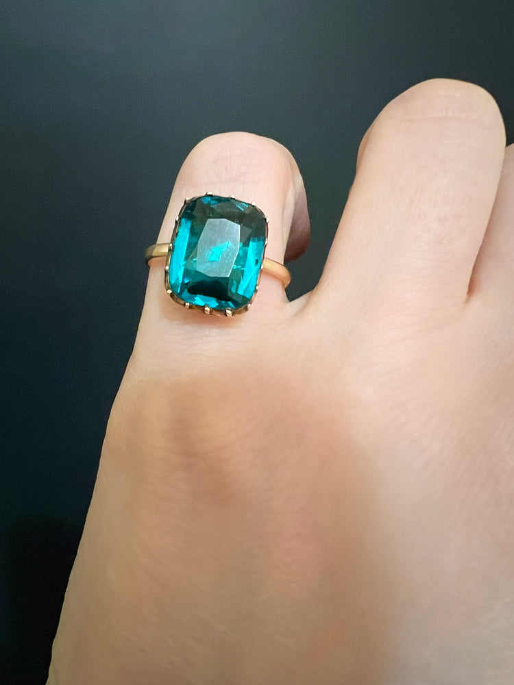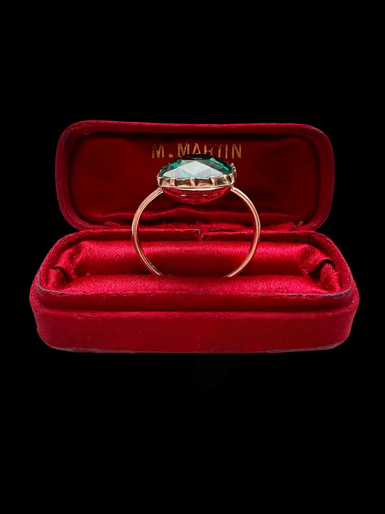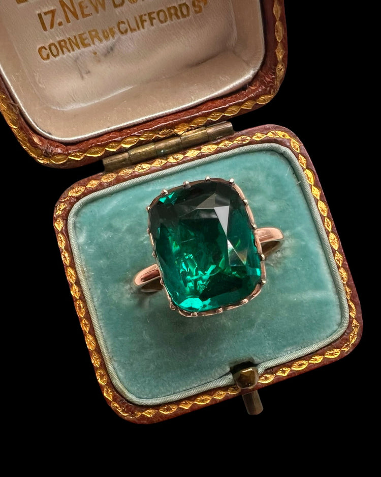 The stone is in a closed back cut down gold setting with a foil back, which is typical of this era of jewellery.