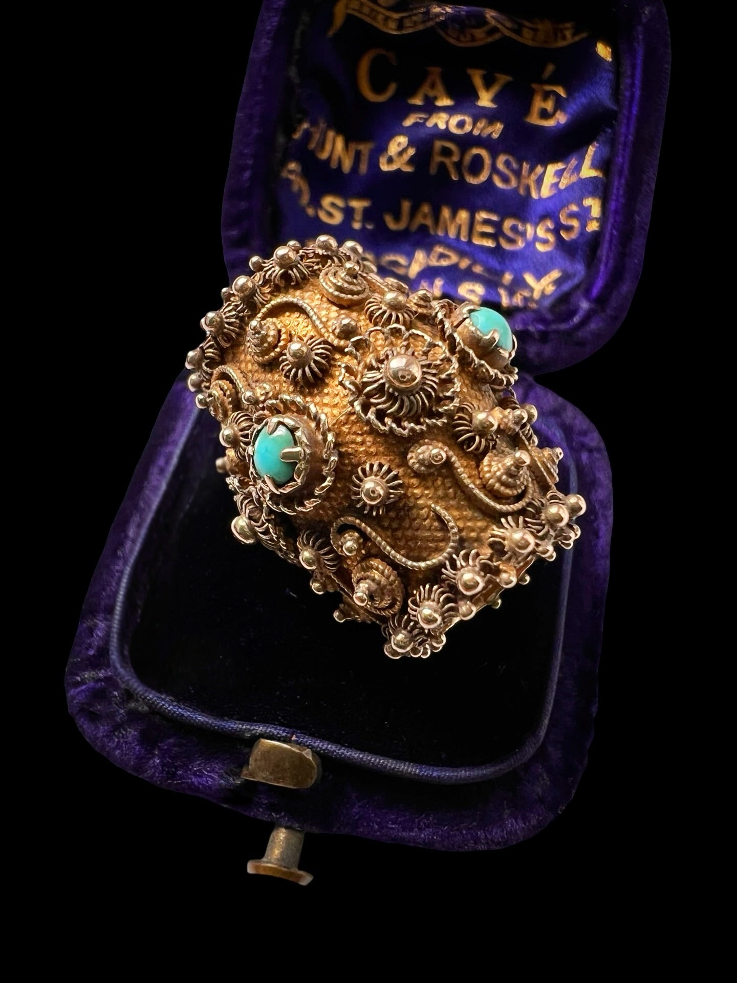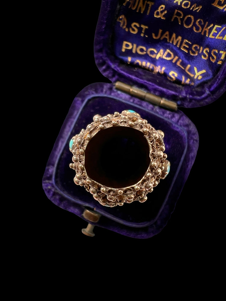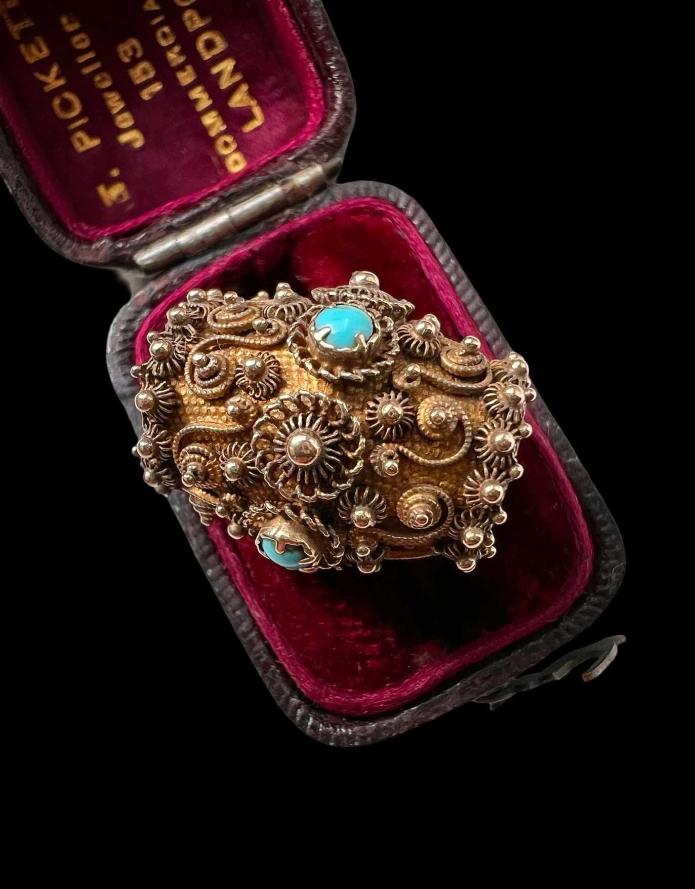 The sliders stippled surface is covered with  wonderful detailed wire work and is set with four cabochon Turquoise stones.