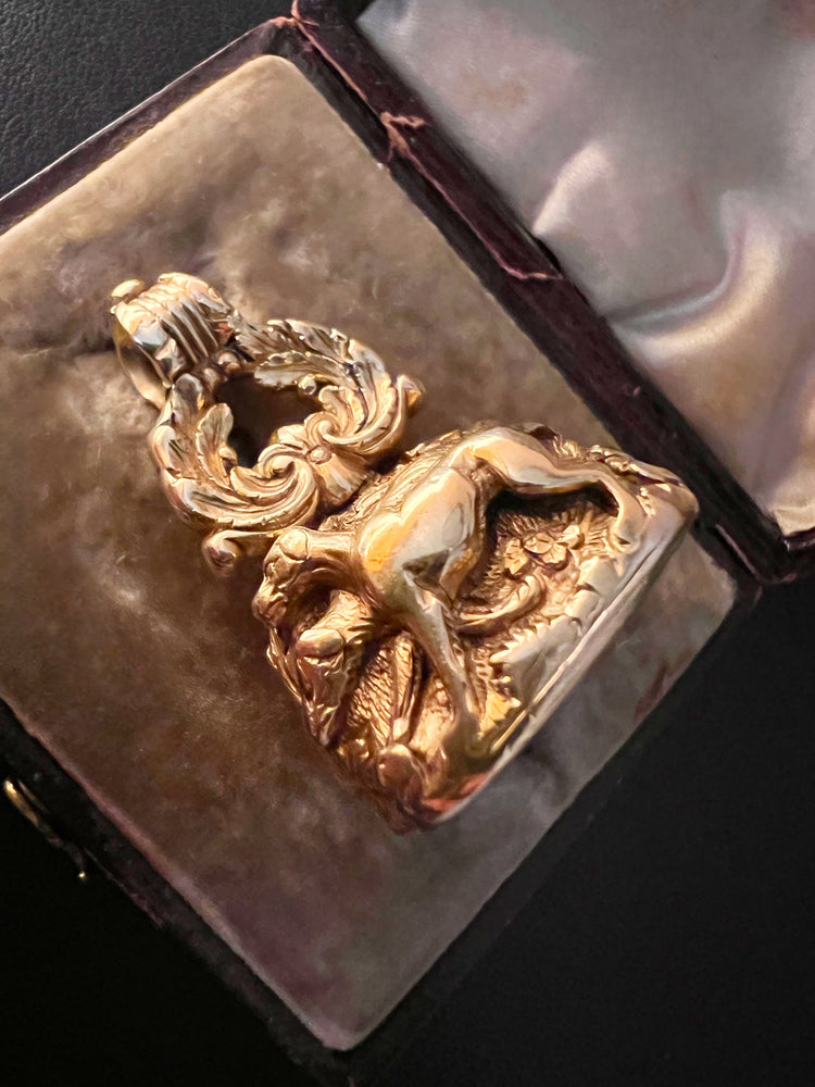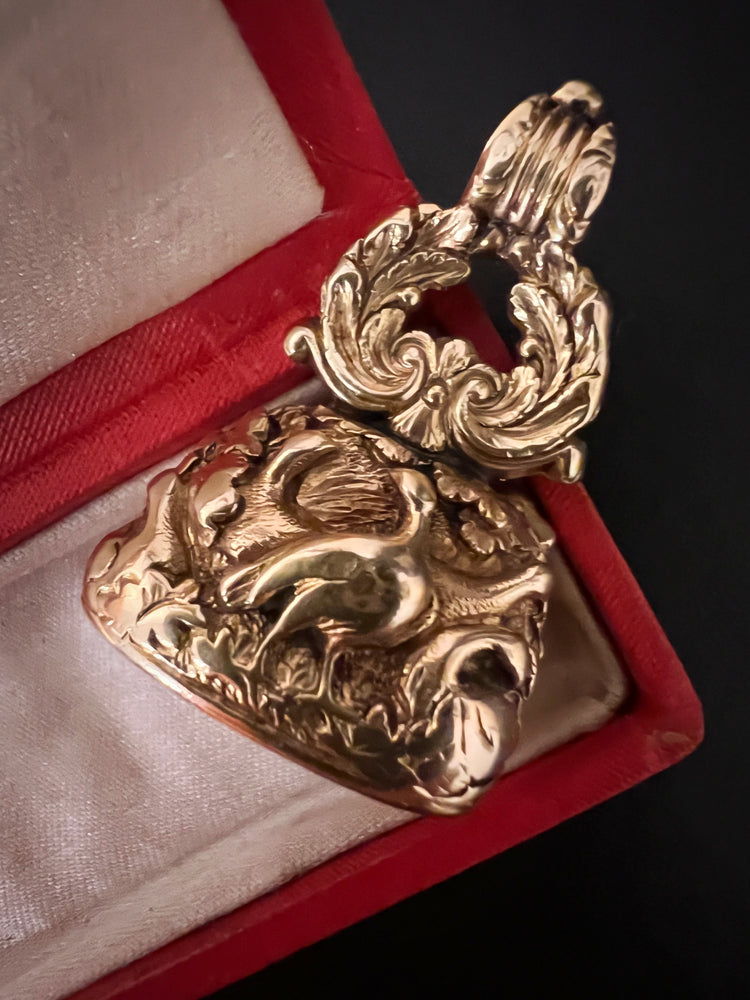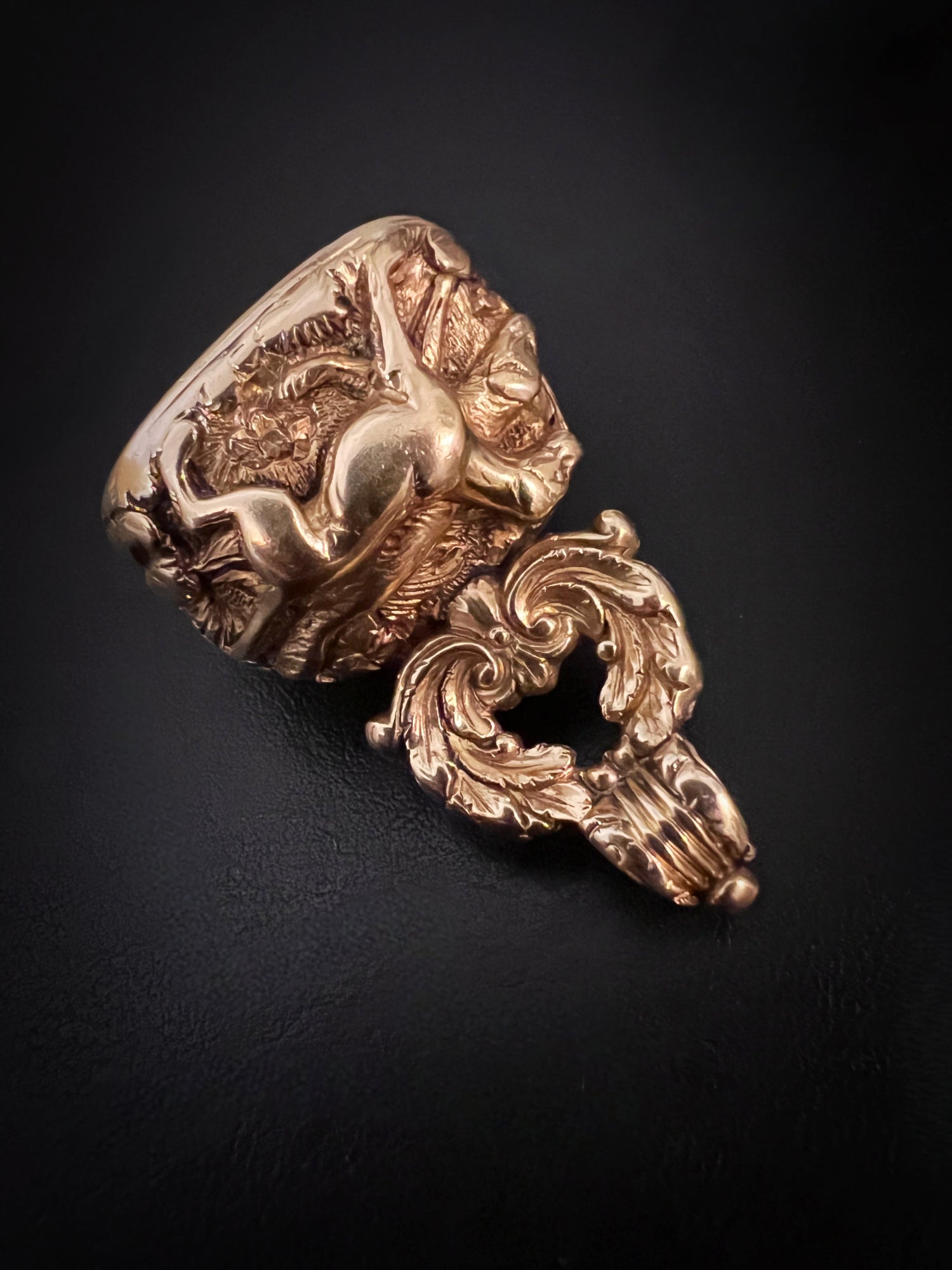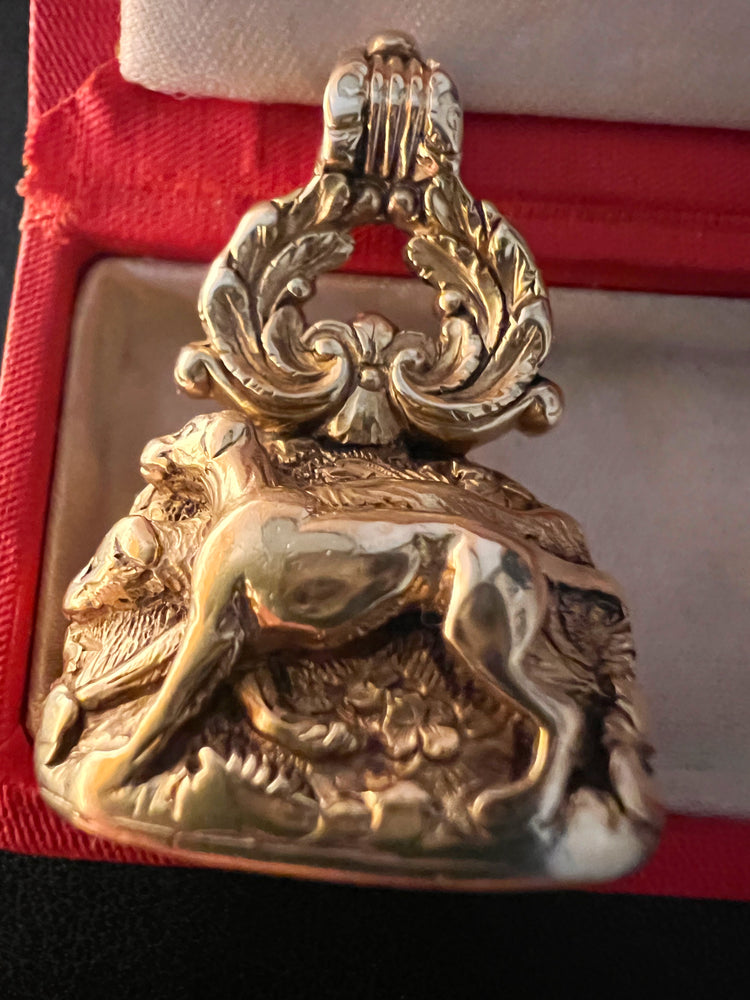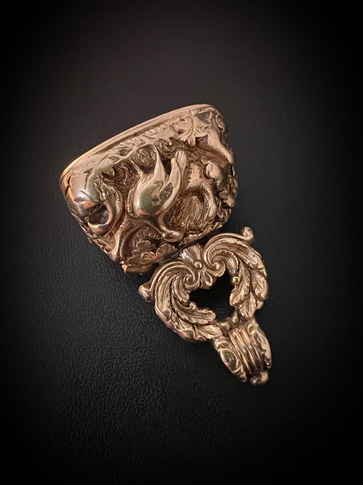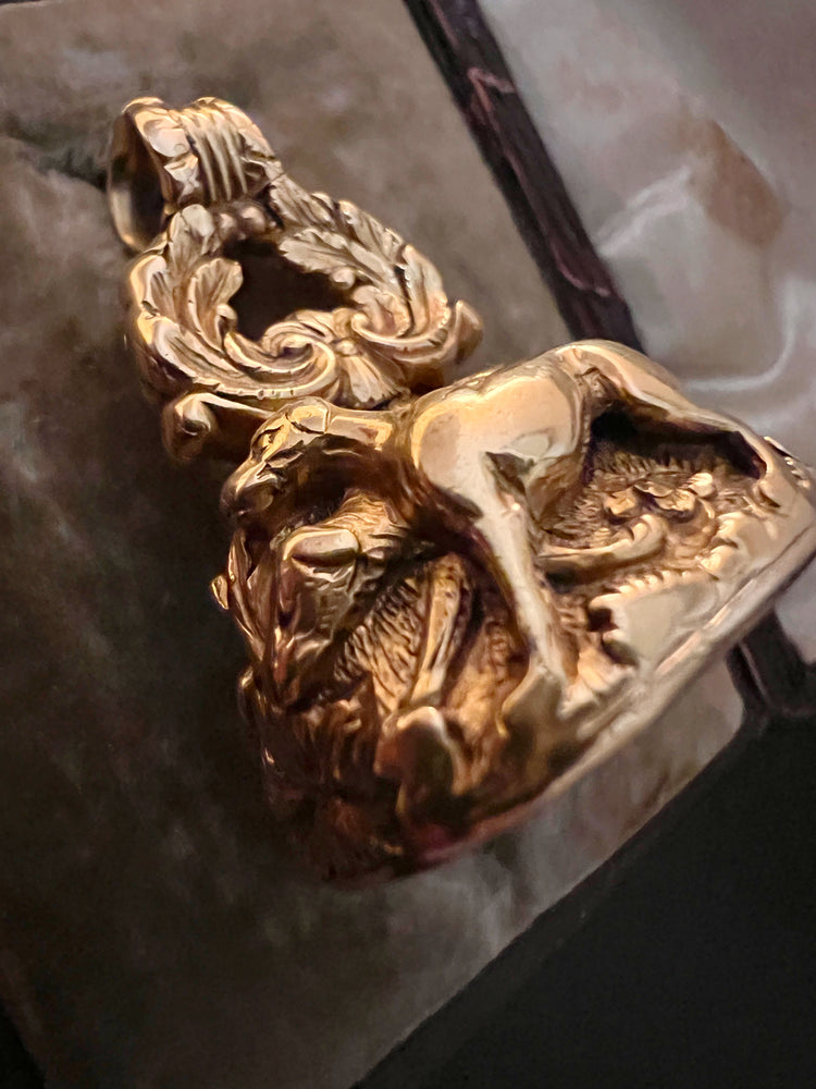 The chunky fob is made of 15ct carat gold with beautiful chasing over the entire piece.