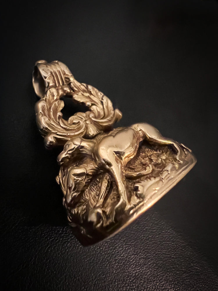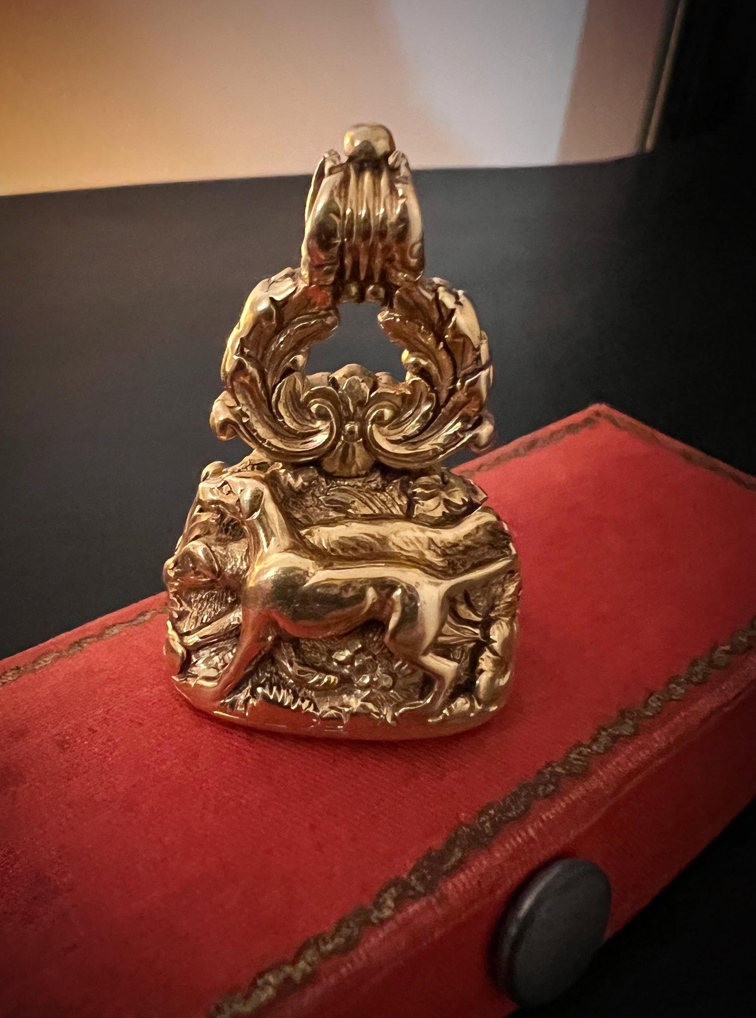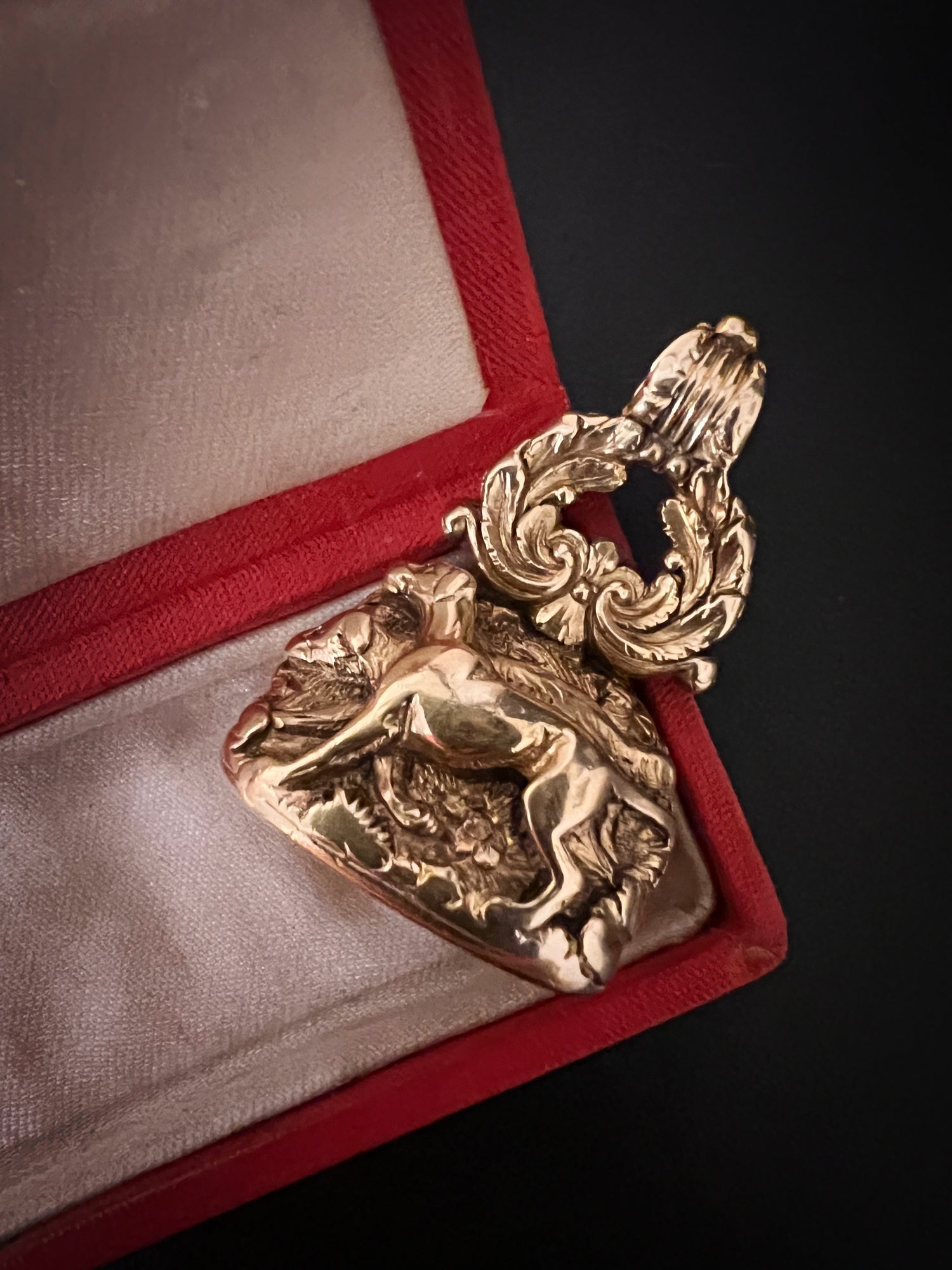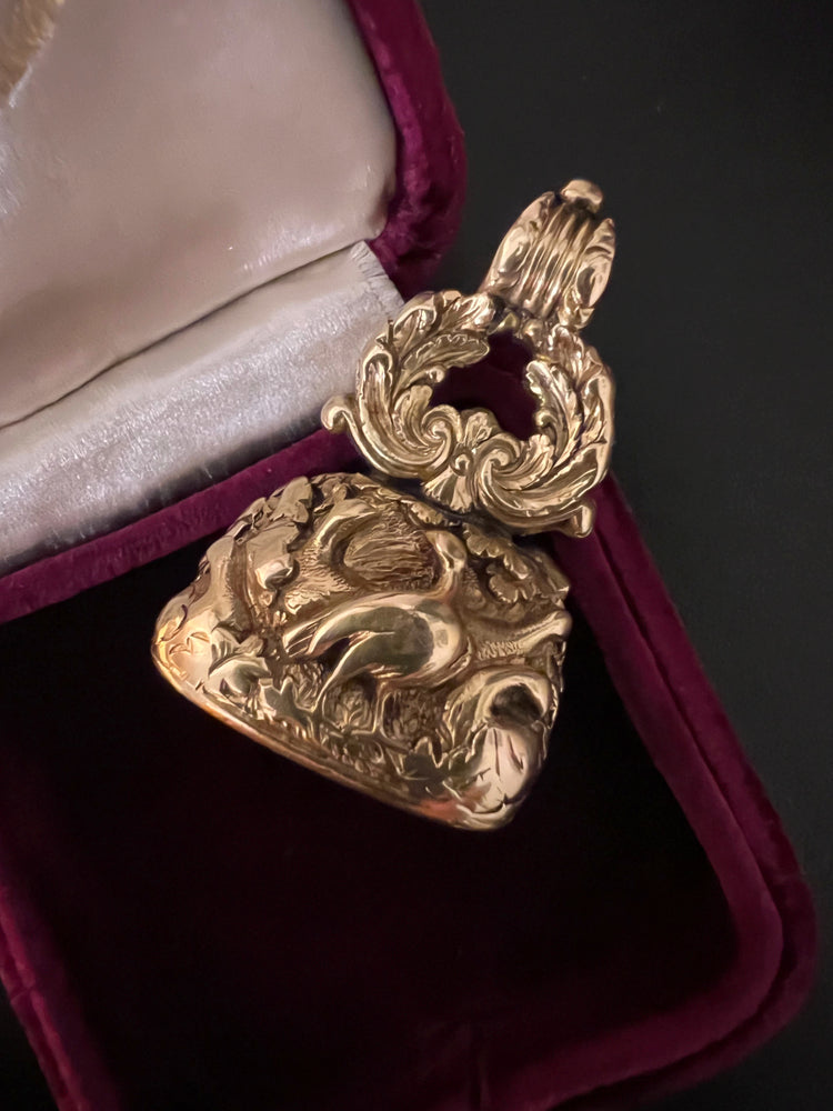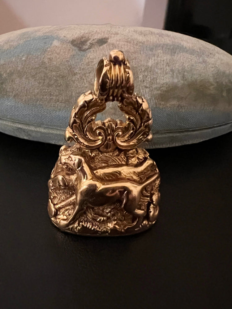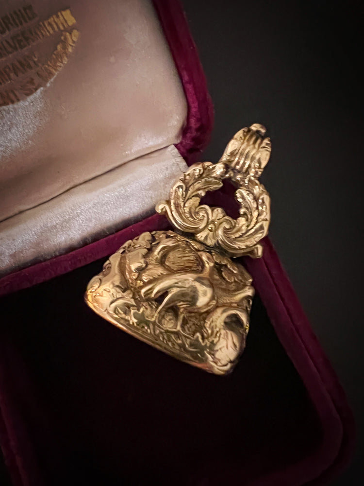The chunky fob is made of 15ct carat gold with beautiful chasing over the entire piece.