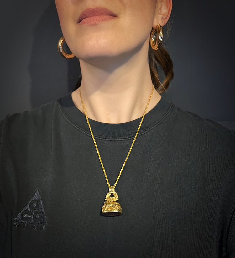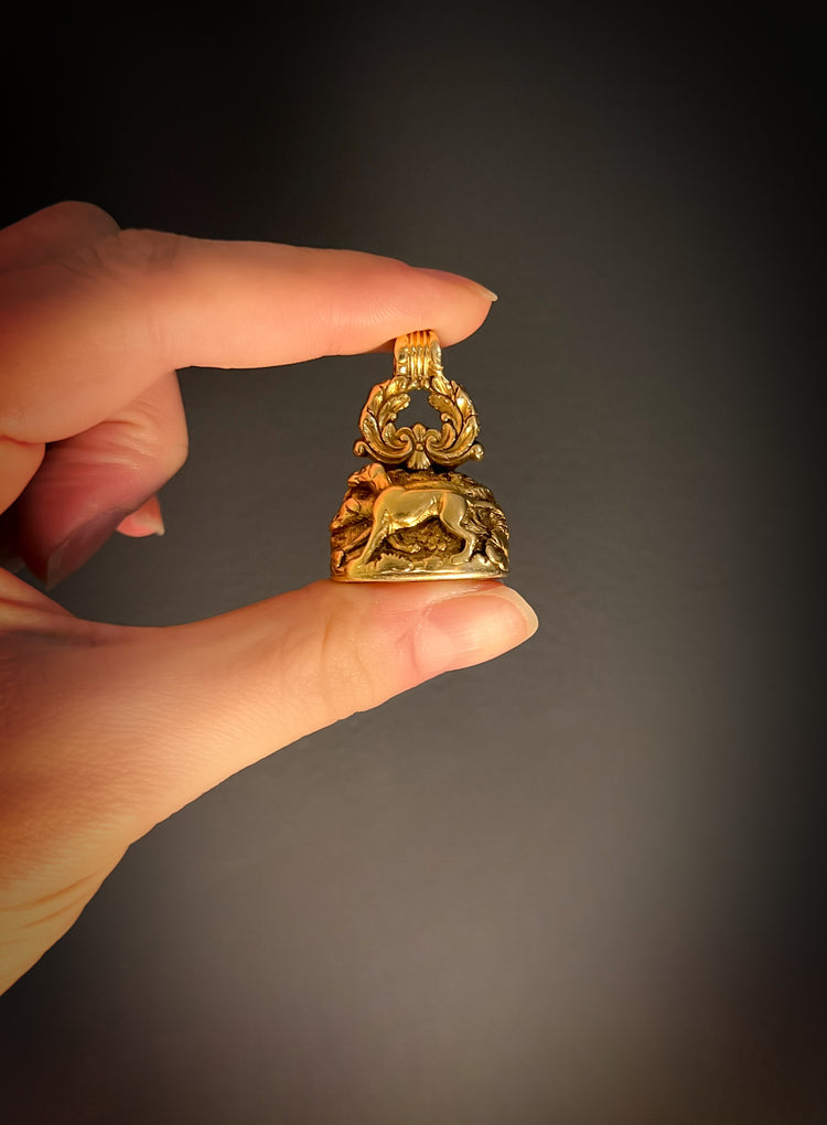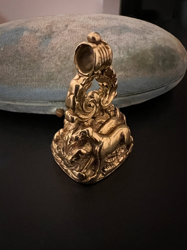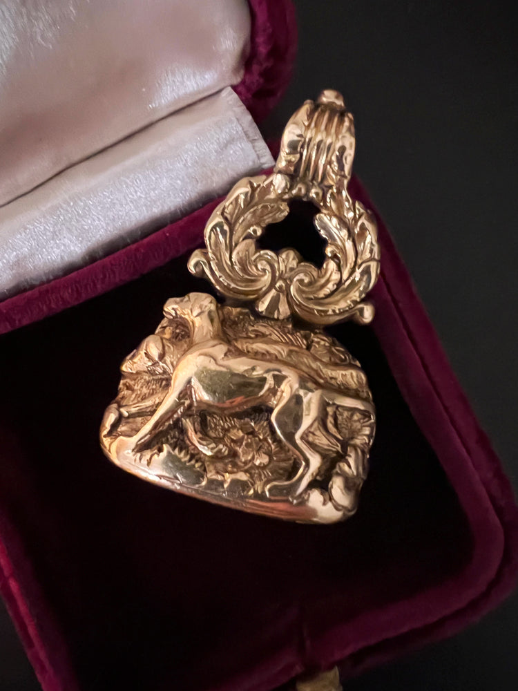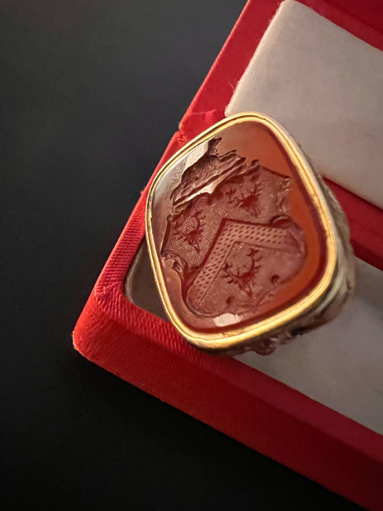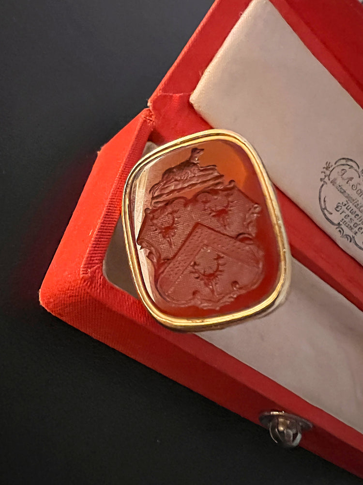 The intaglio is Carnelian, with a Coat of arms shield with 3 stag heads and above, a gorgeous sitting dog which is the sign for fidelity.