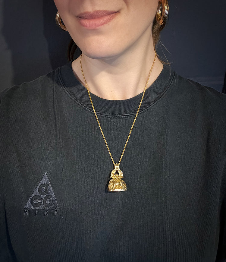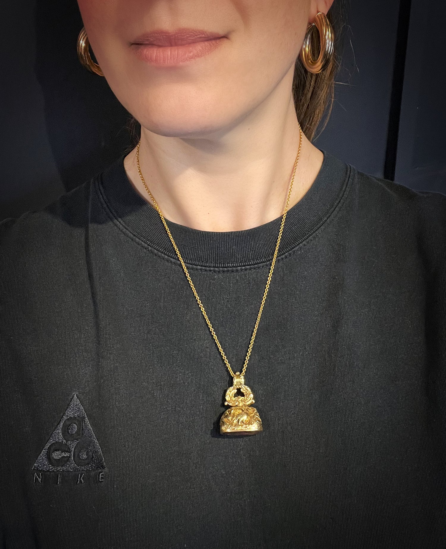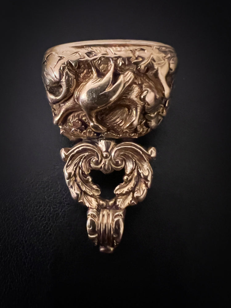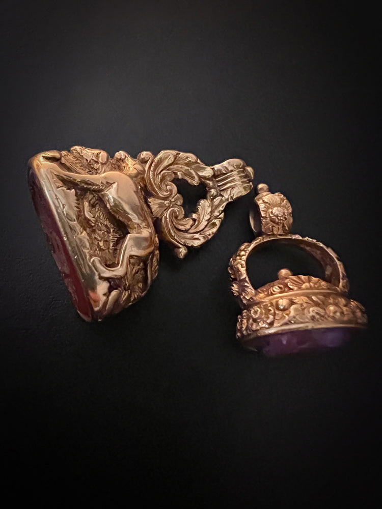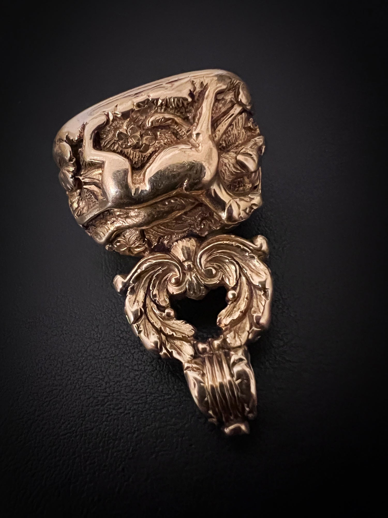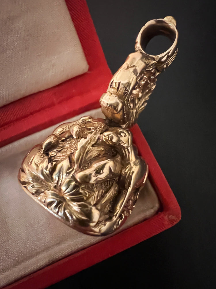 The stem of the fob is created by a wreath of flora and forna, that leads up to a chunky reeded bail.