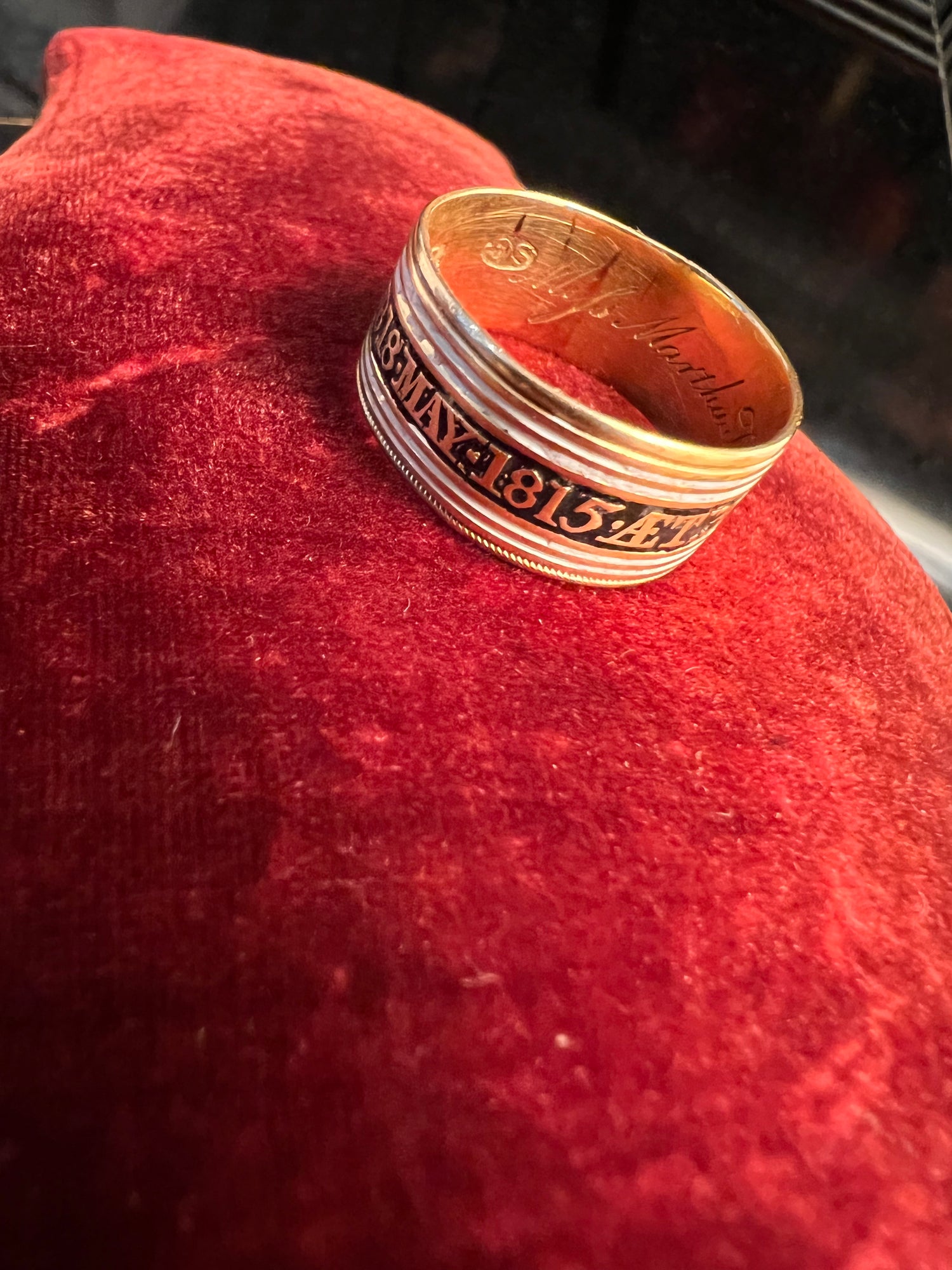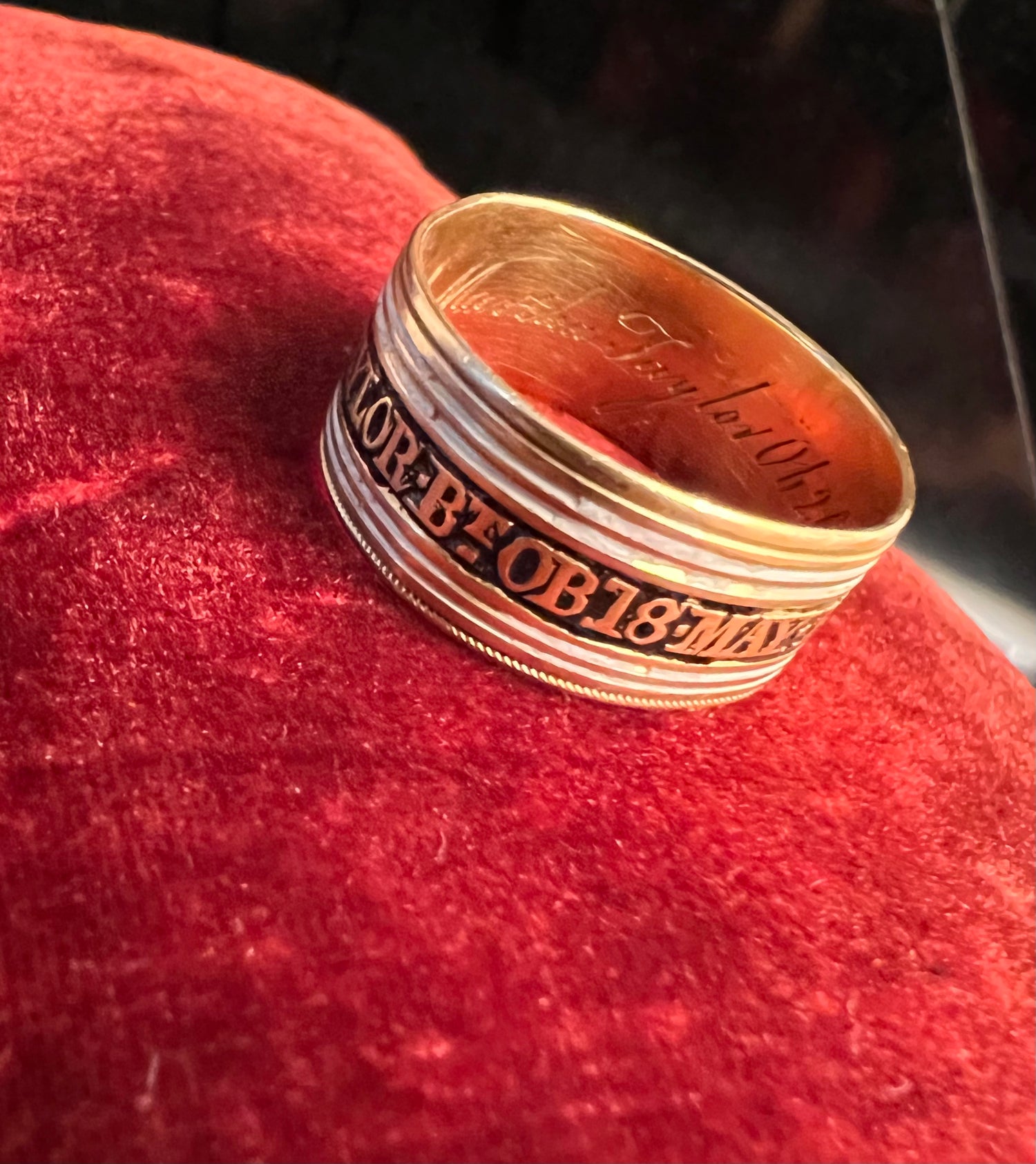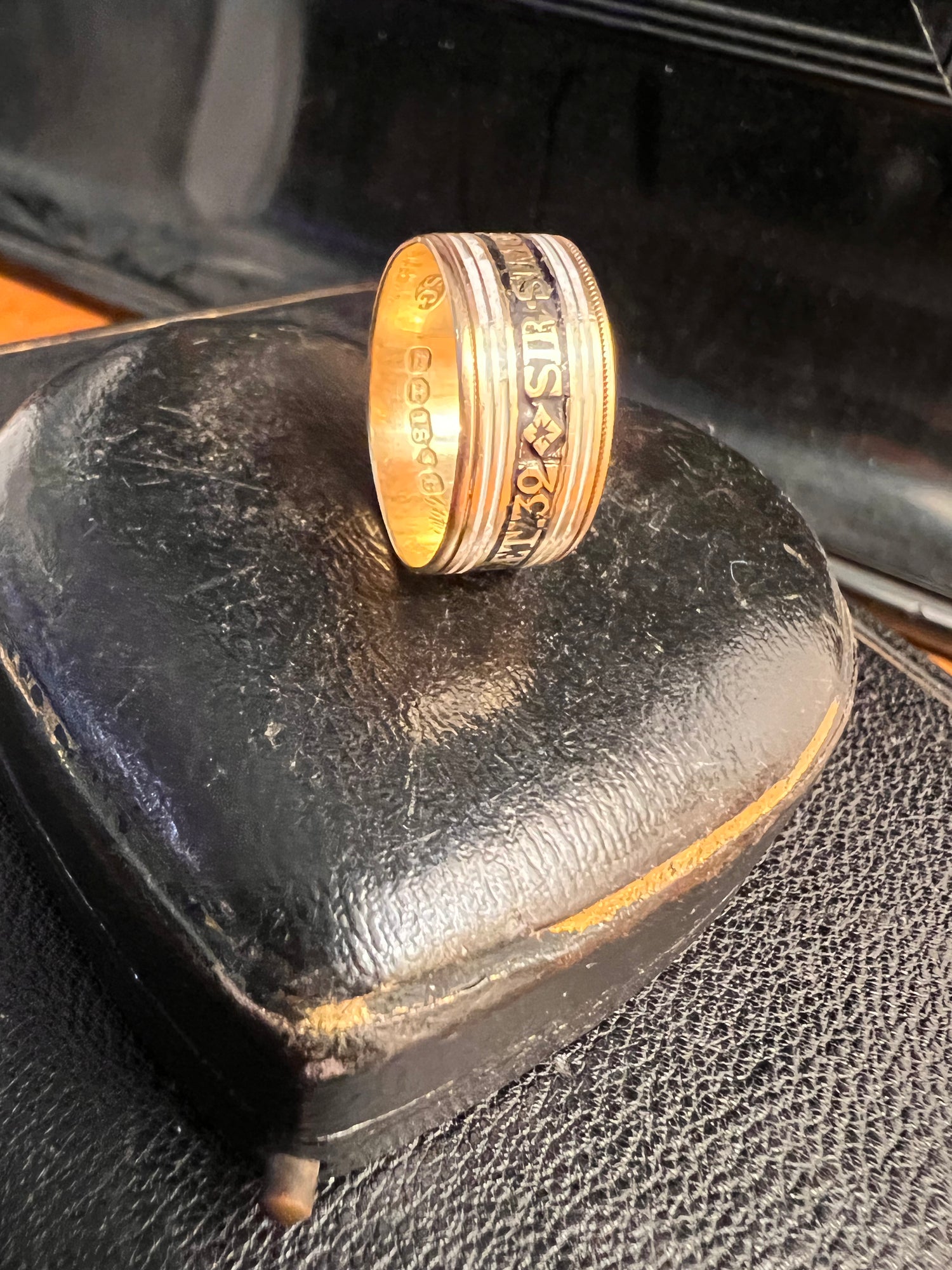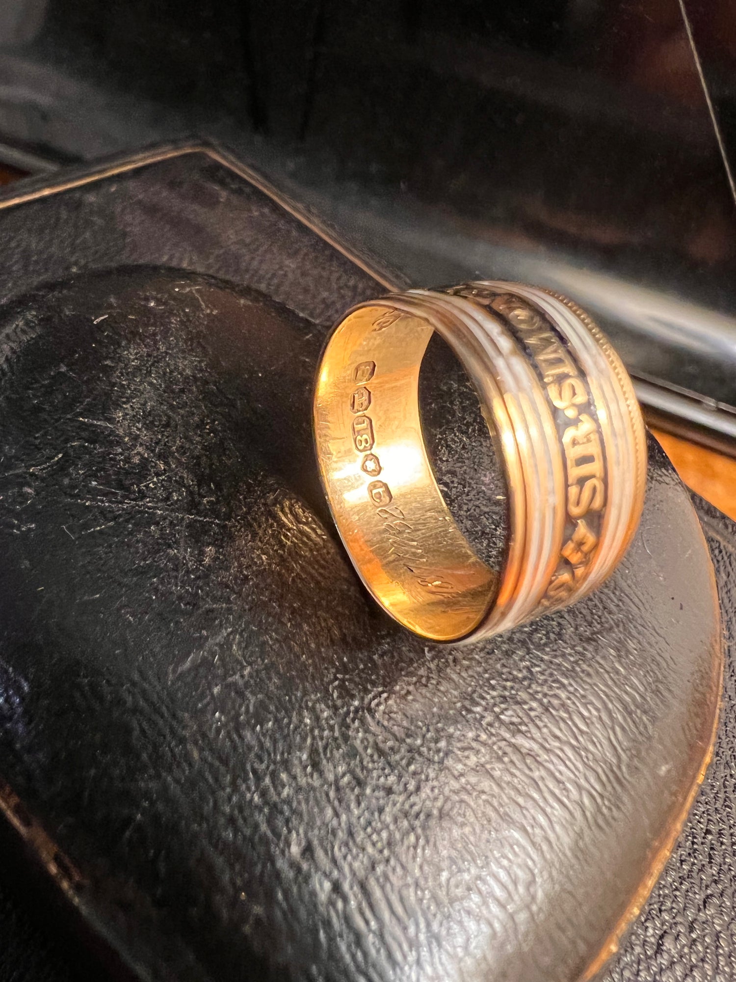 MATERIALS & FEATURES: Mourning ring 18ct gold / Black & white enamel