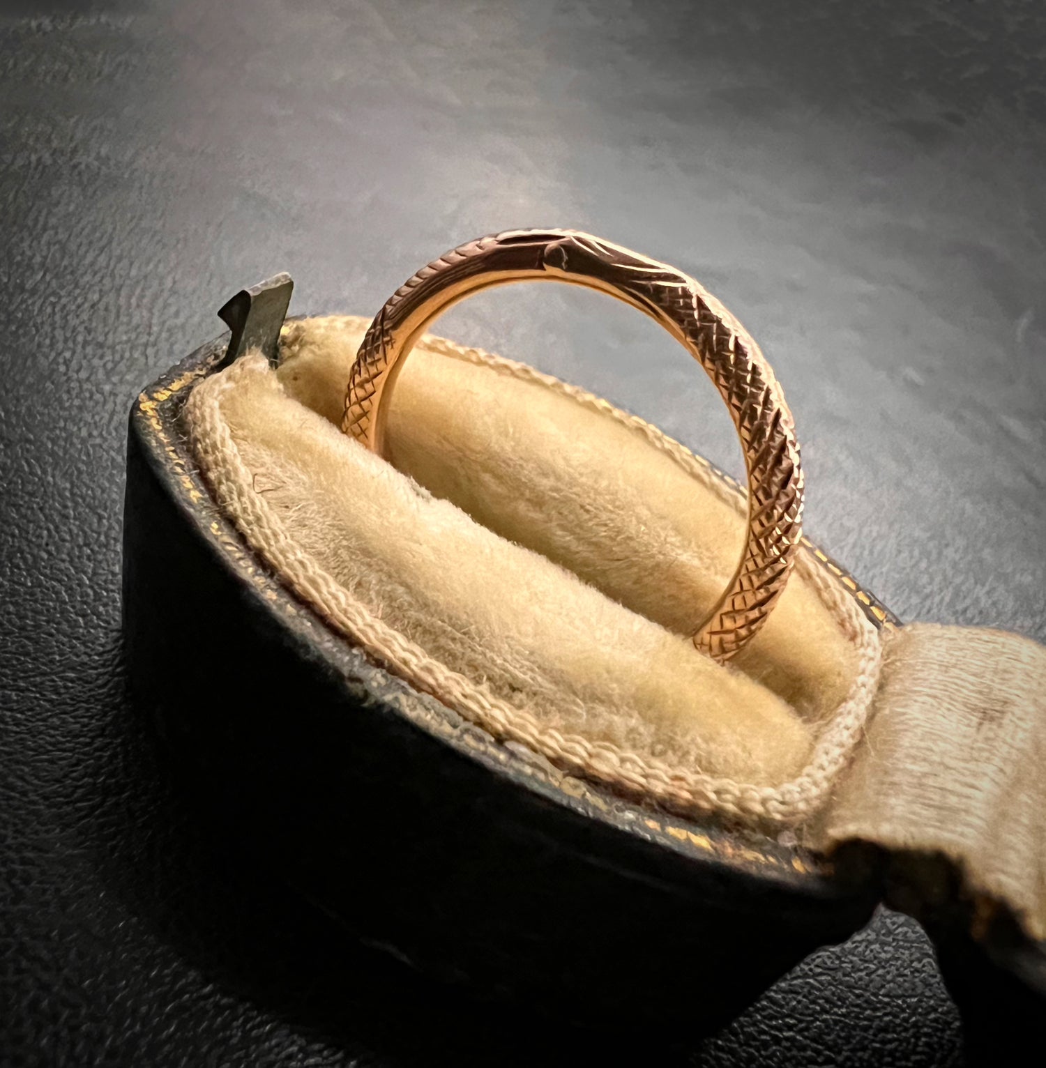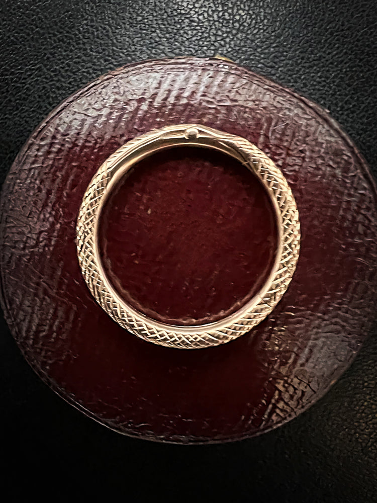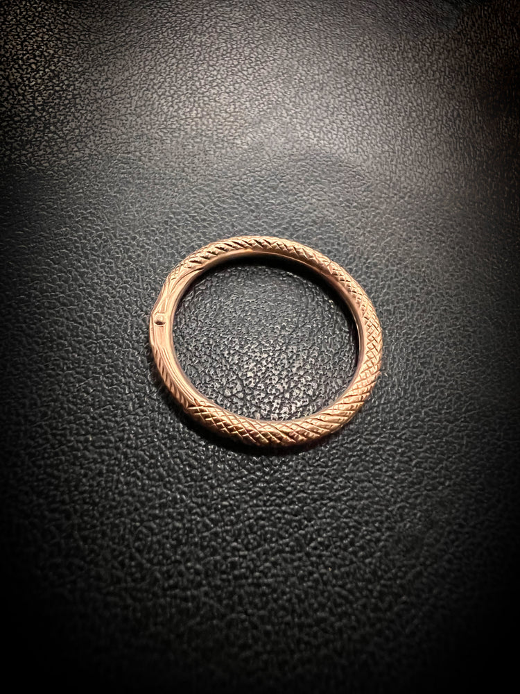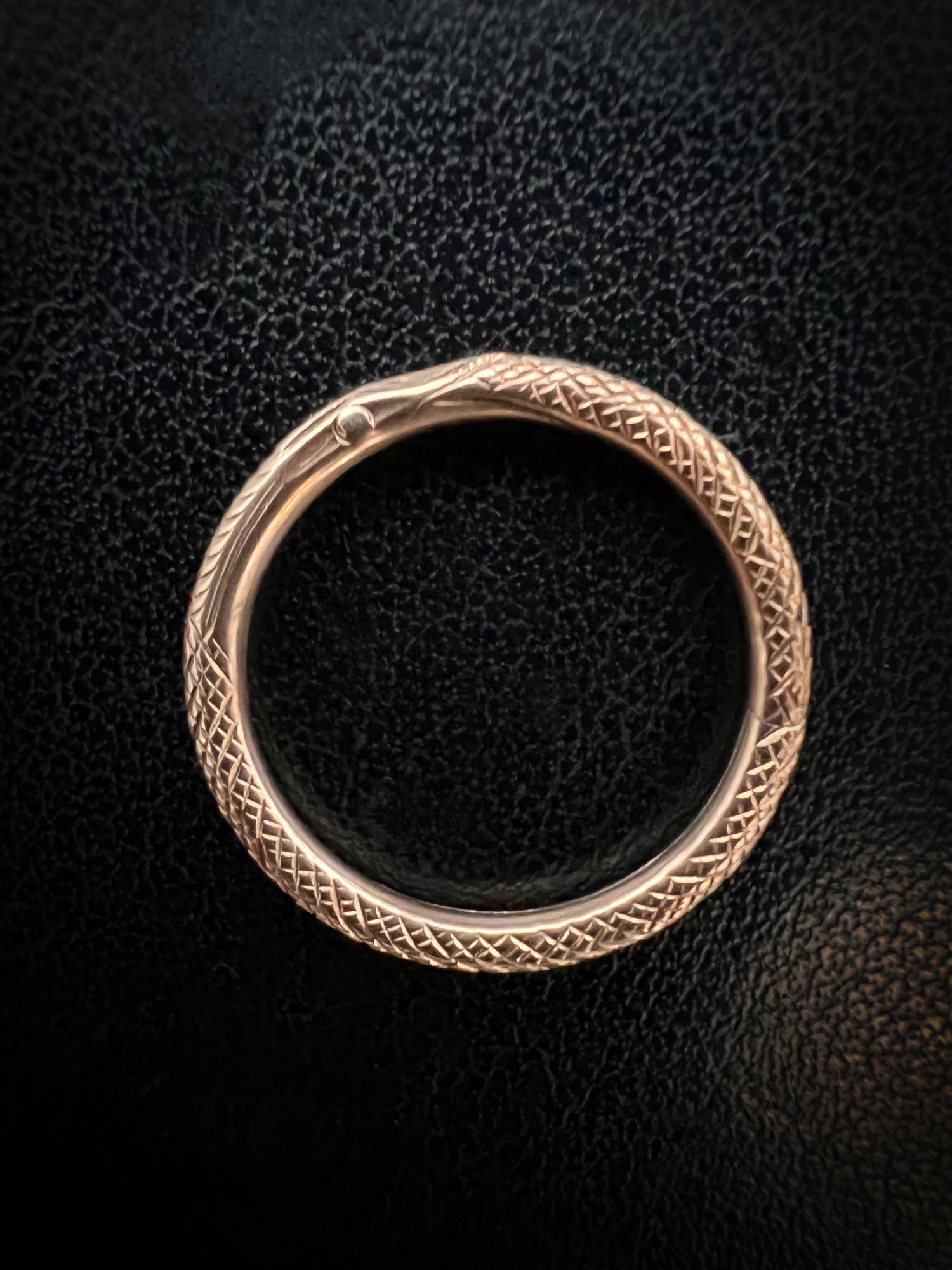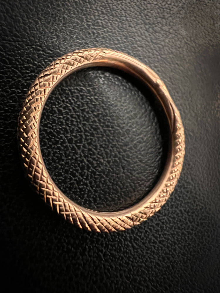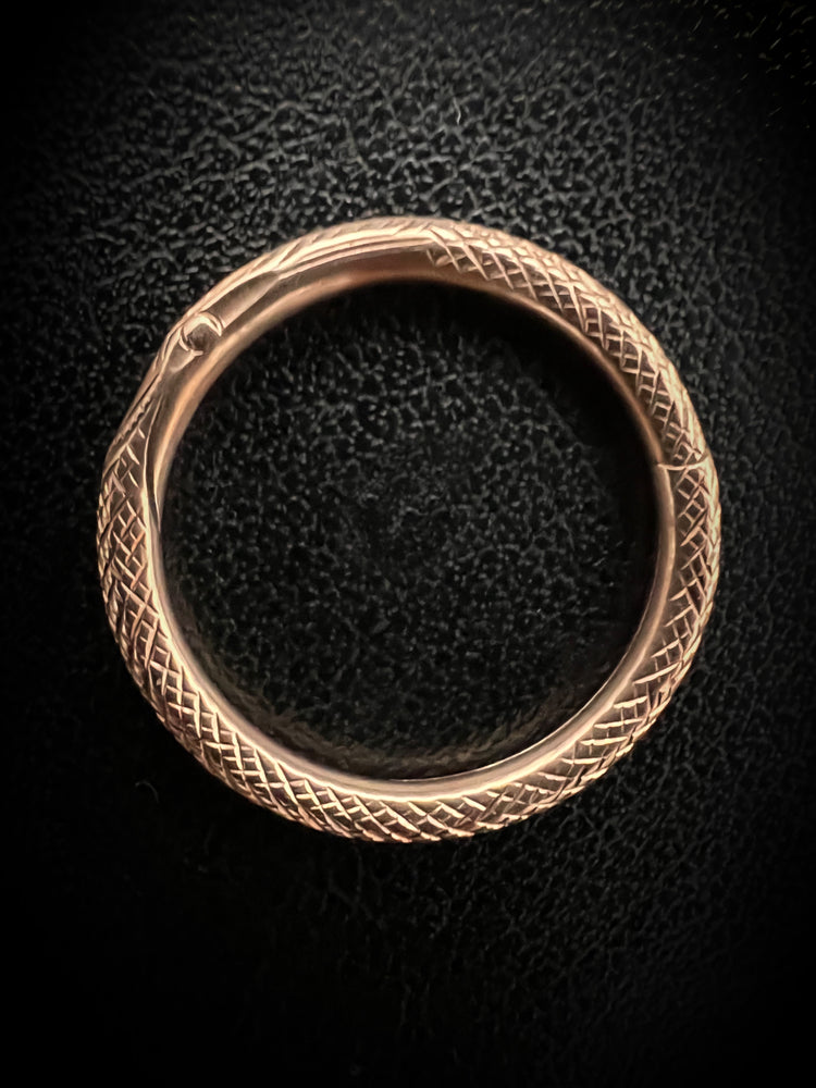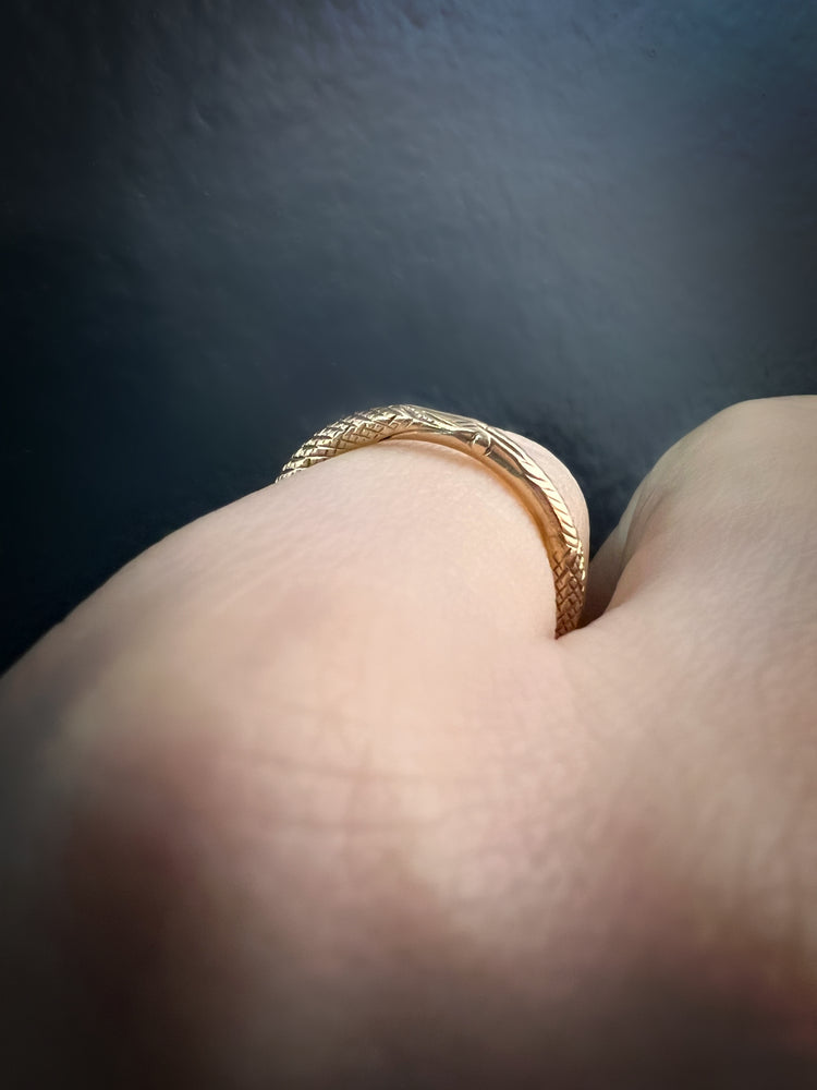 The ring has defined cross hatching along the snakes body, and a finely carved head and eyes.