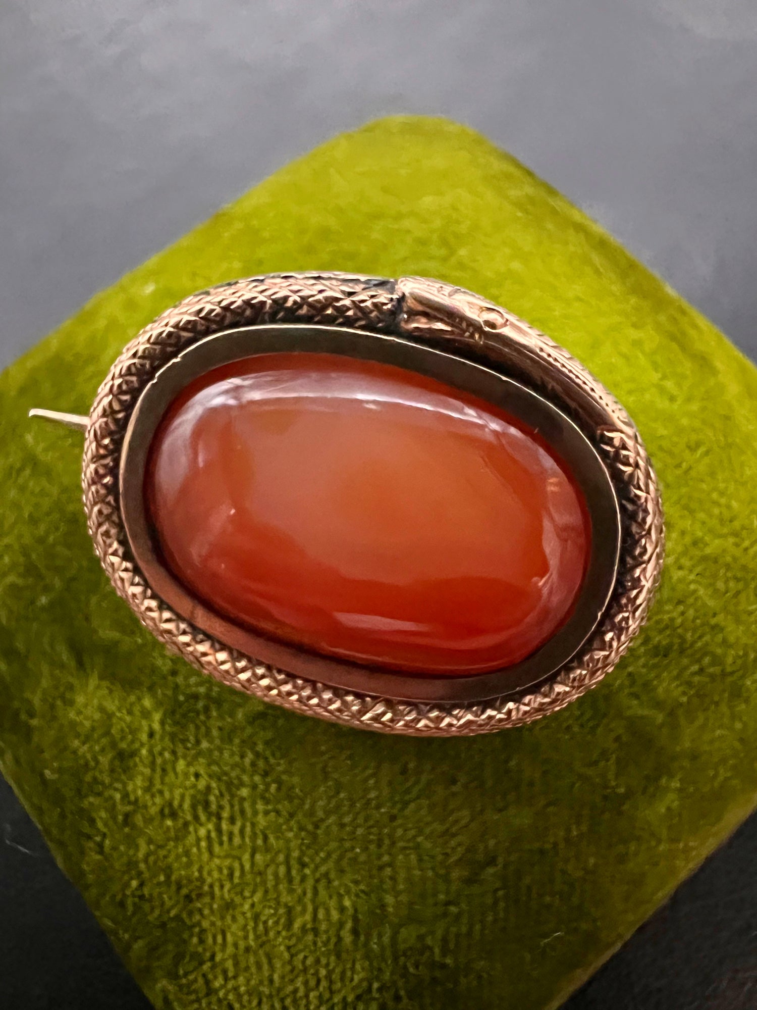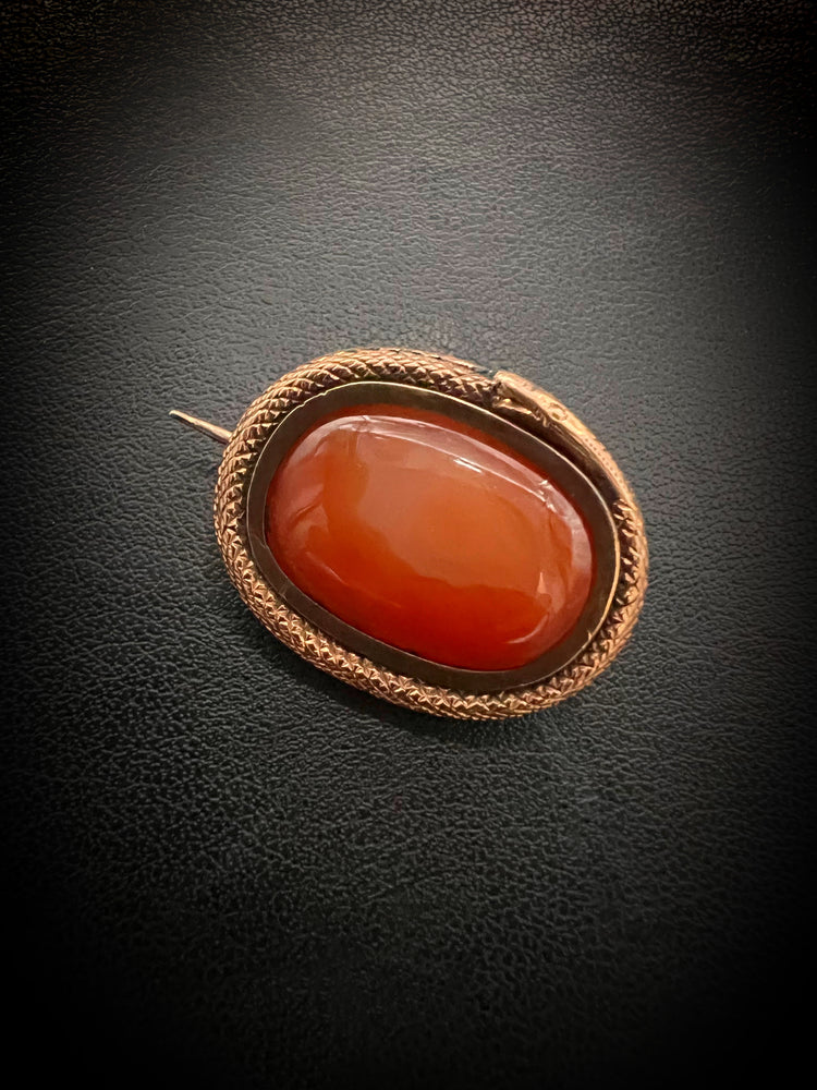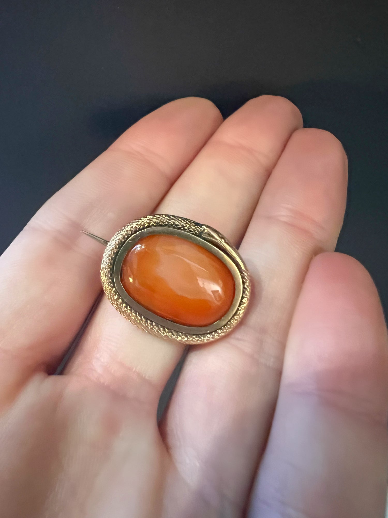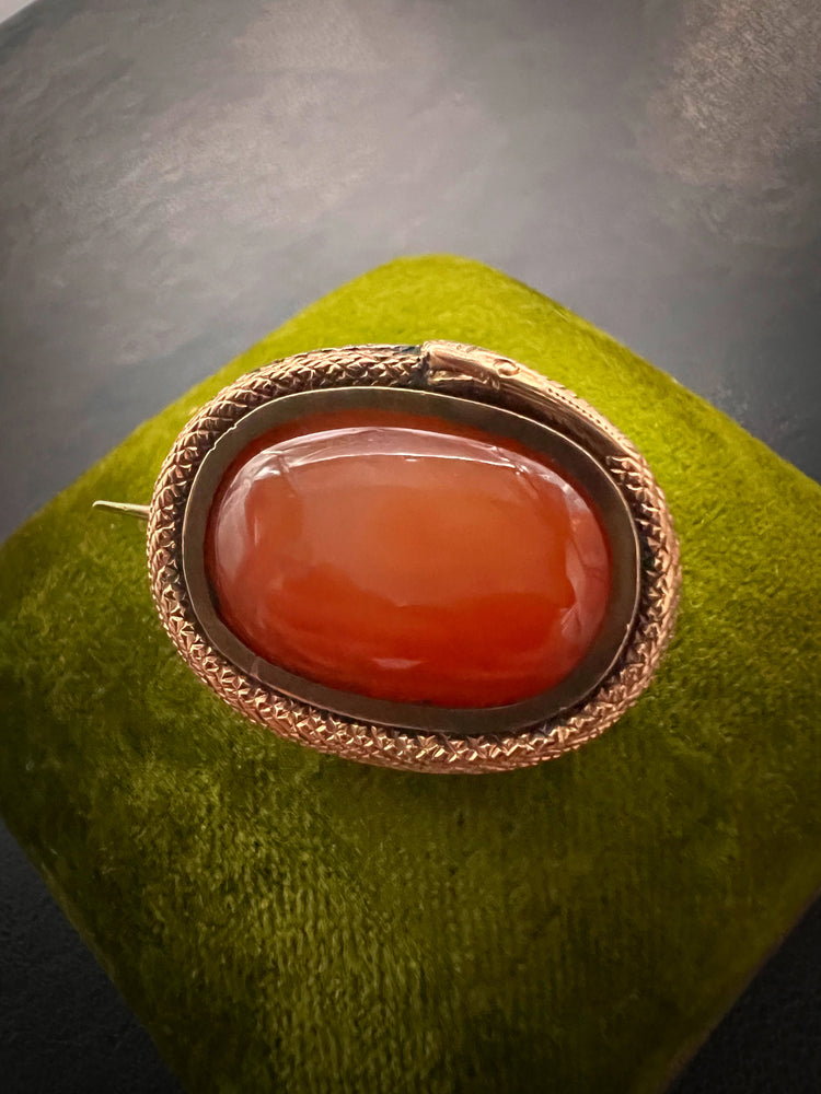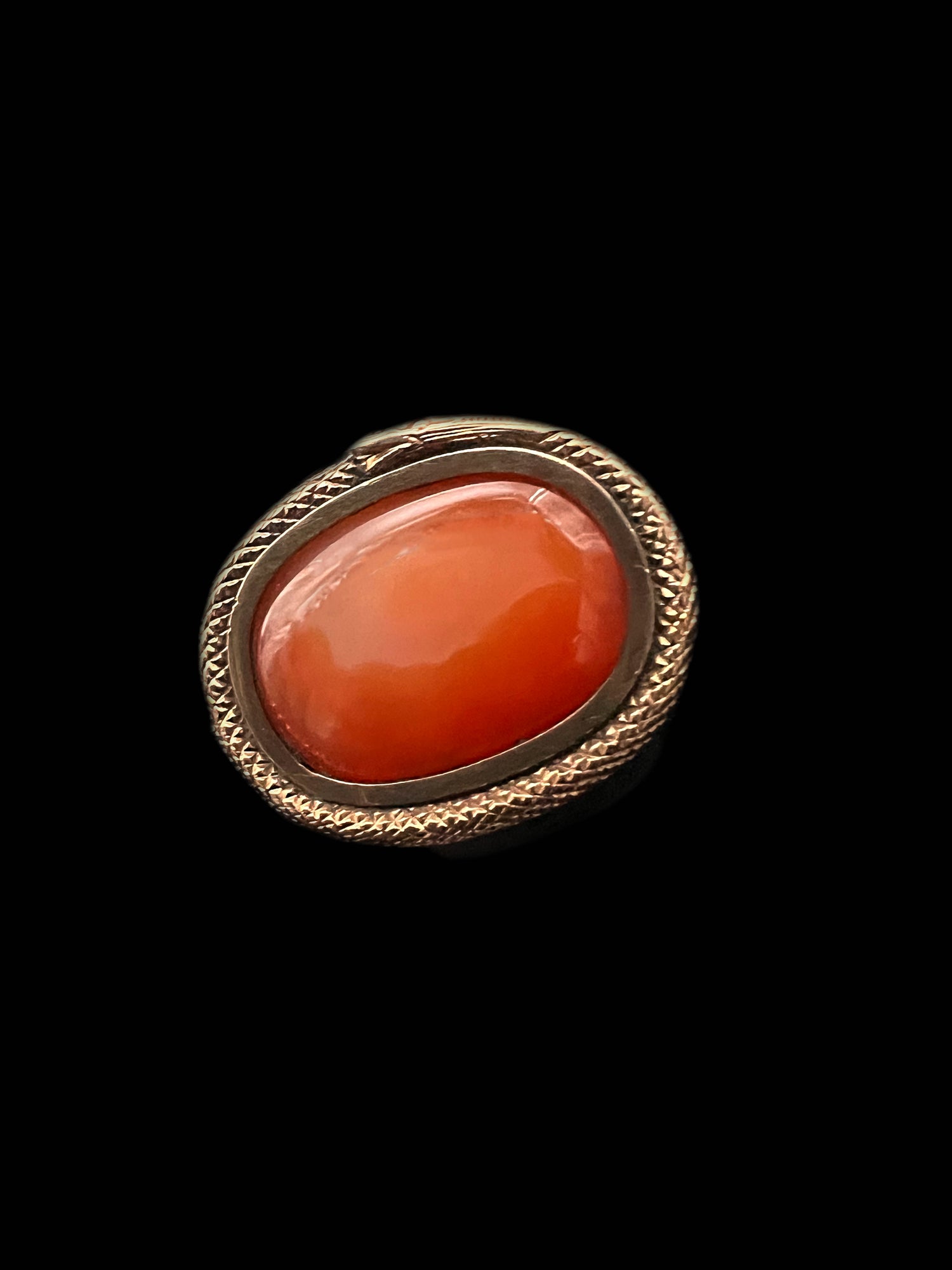 Made with a crosshatch gold snake around the edge of a carnelian stone. With the snake eating his own tail.