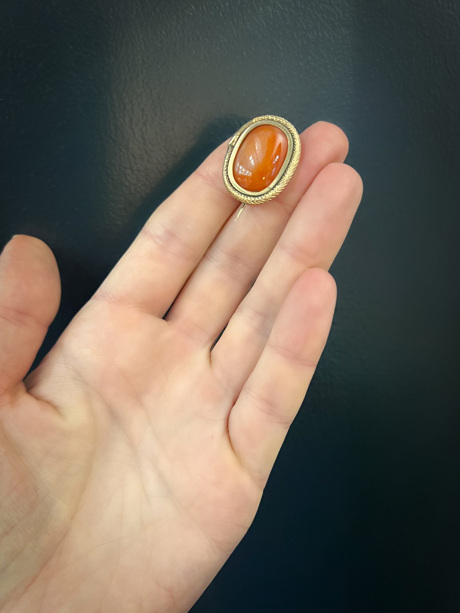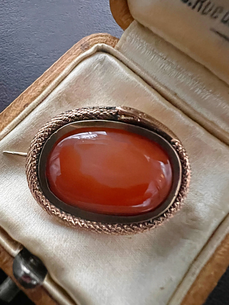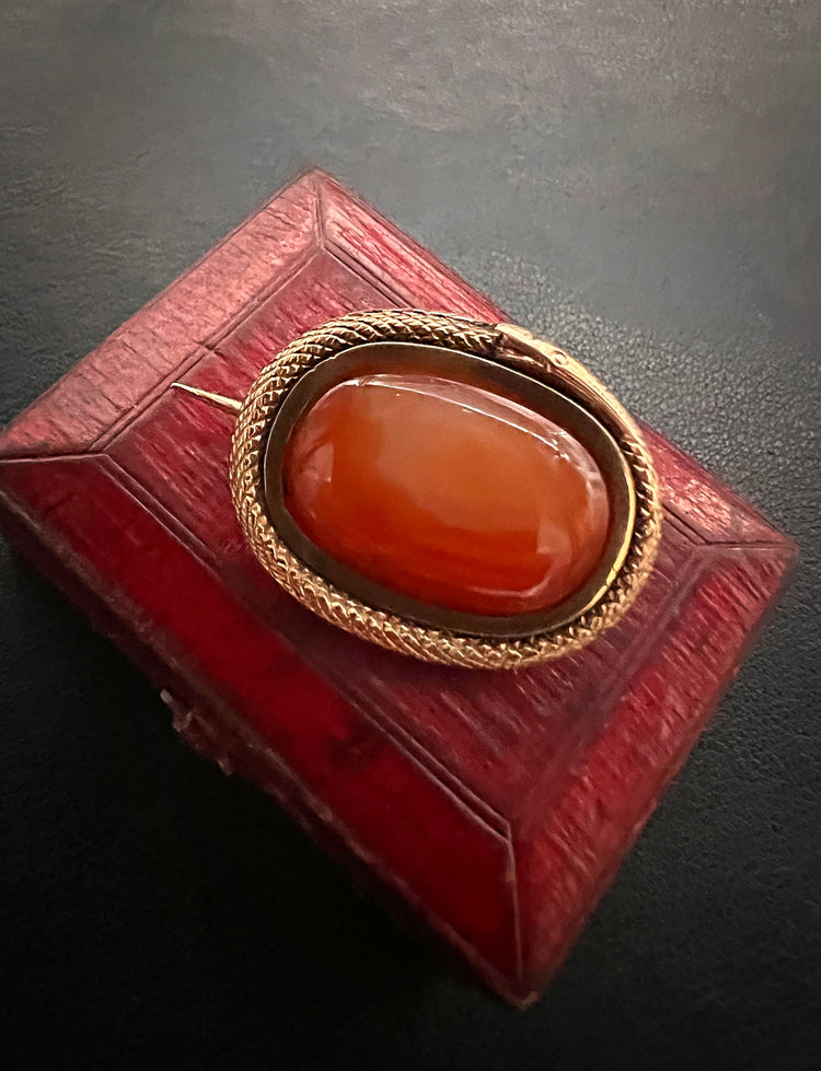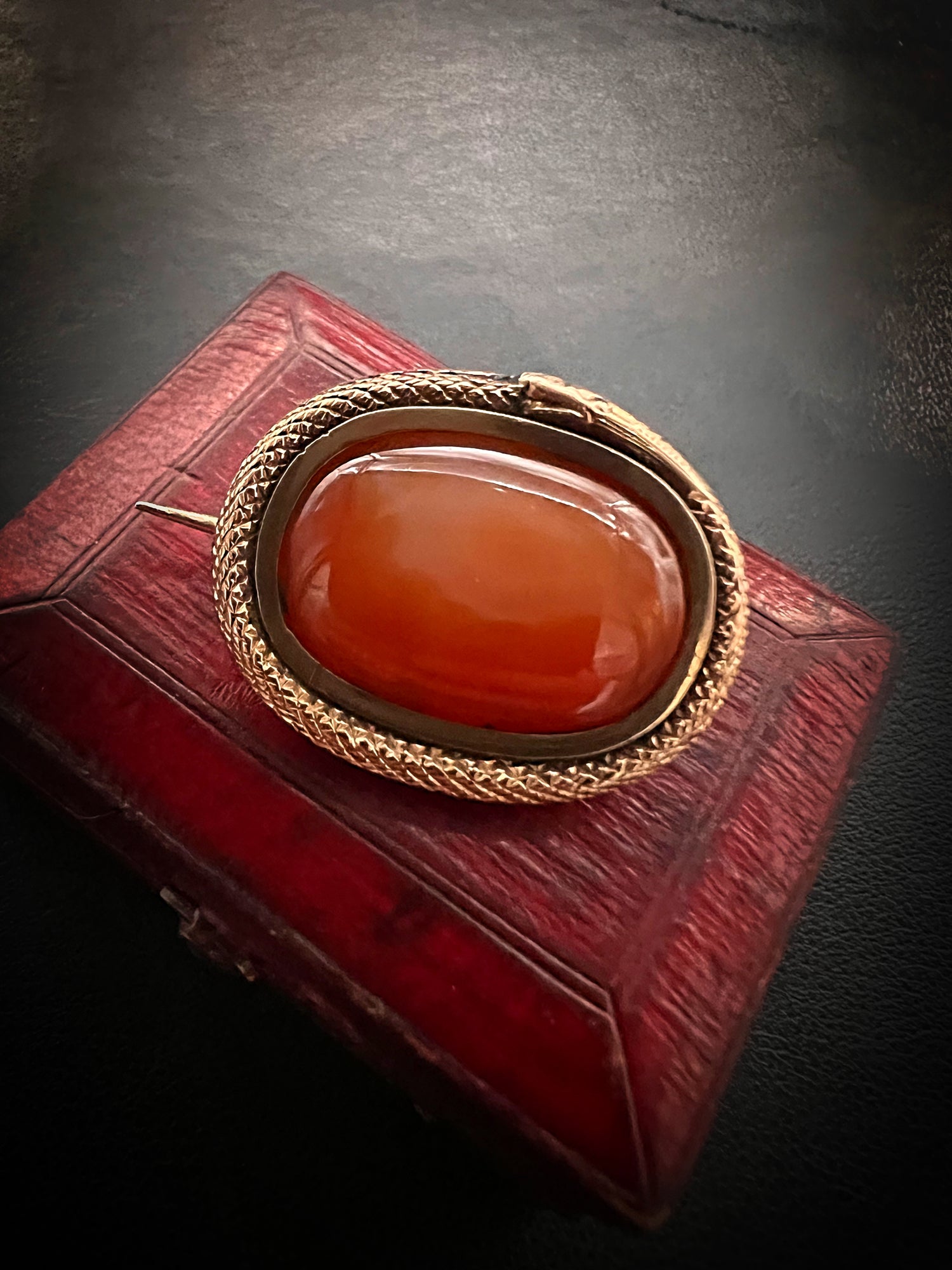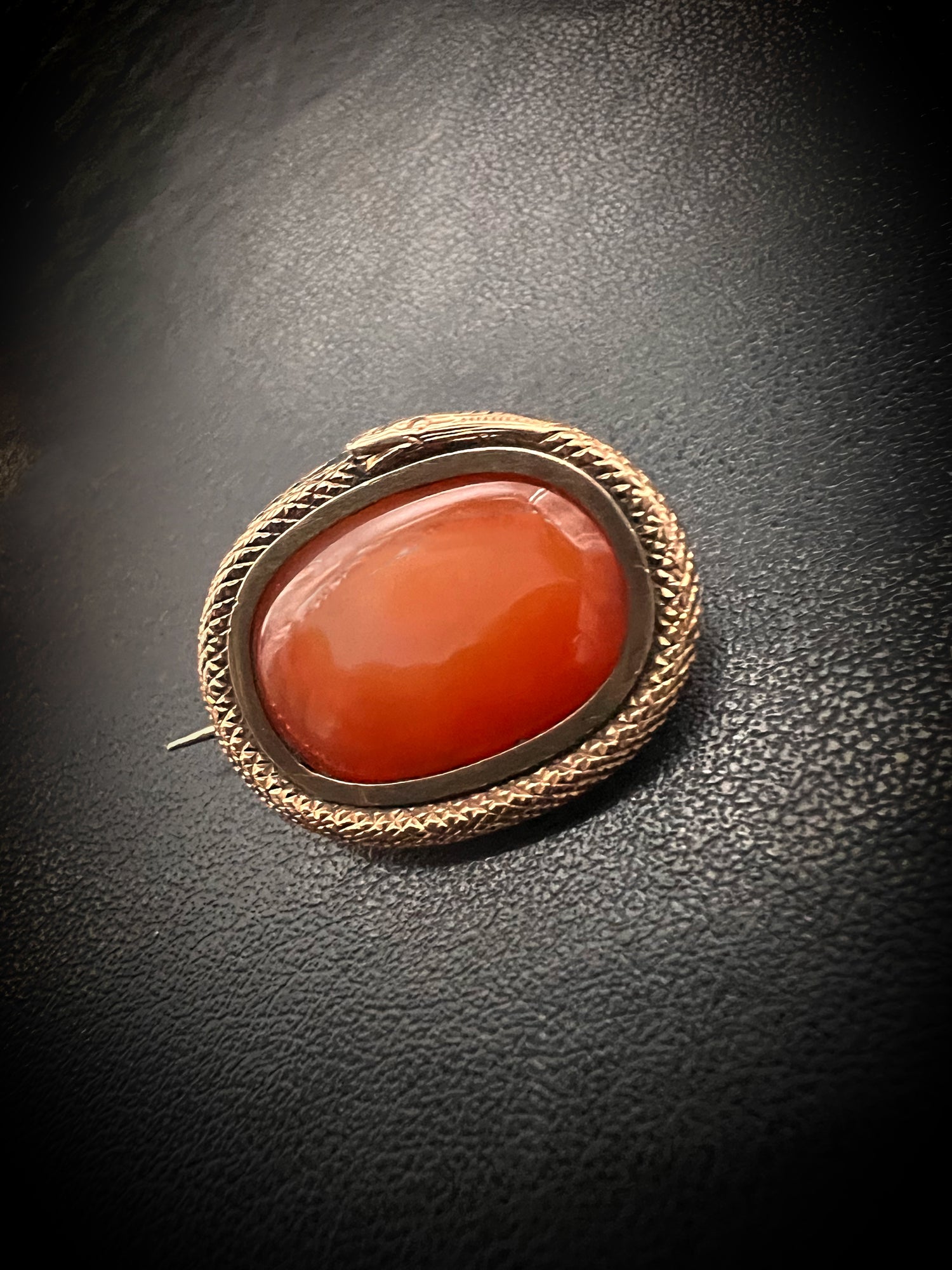 Made with a crosshatch gold snake around the edge of a carnelian stone. With the snake eating his own tail.