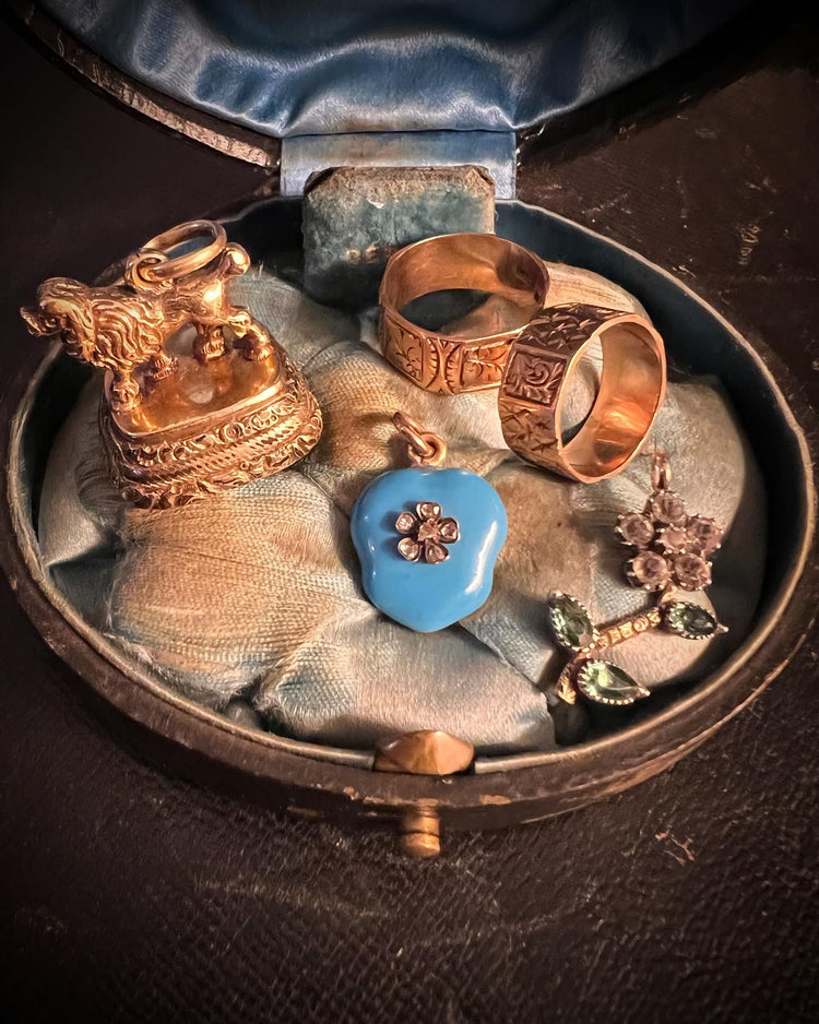 We recommend removing pieces of jewellery before washing hands or showering, as water can damage the antique settings.