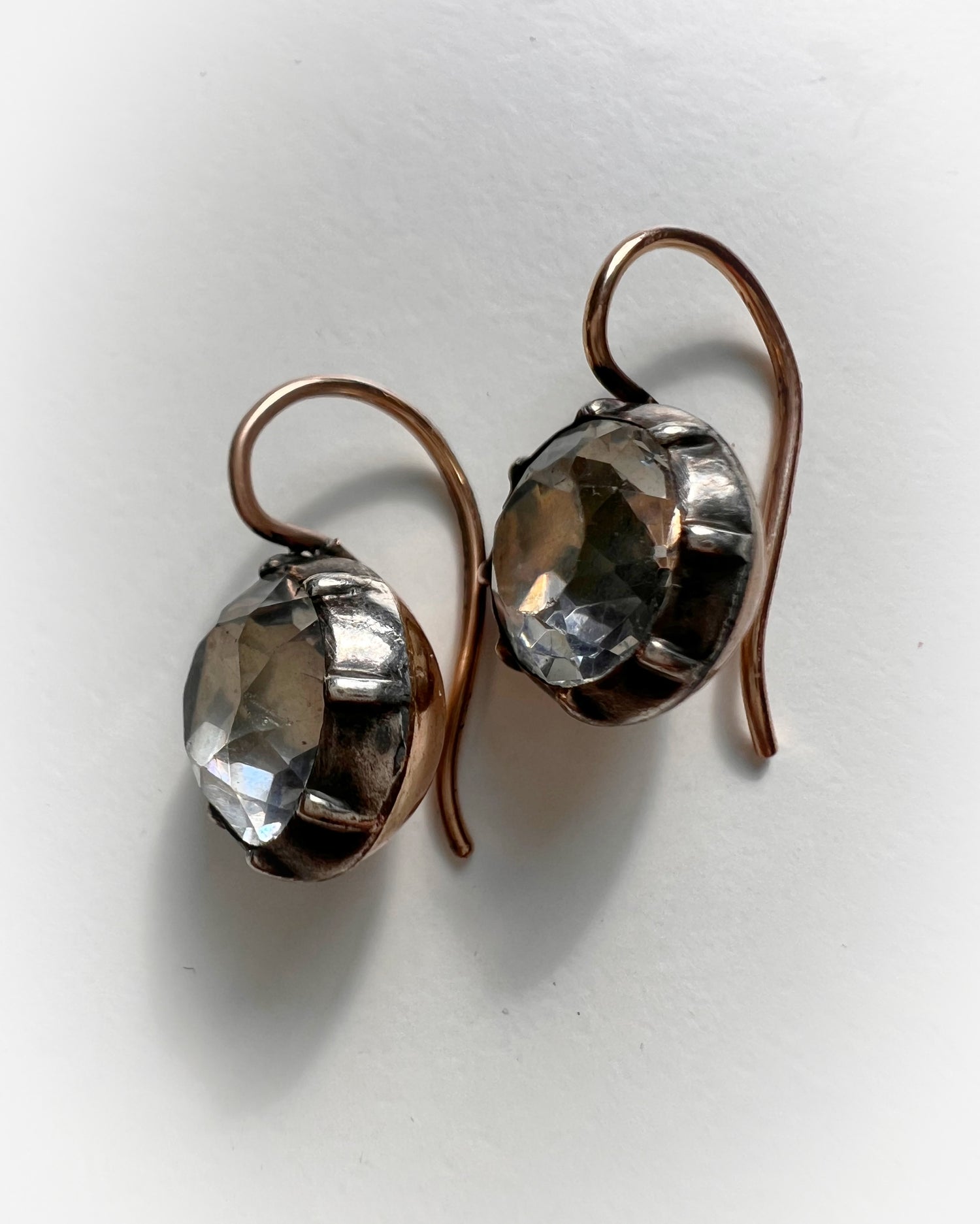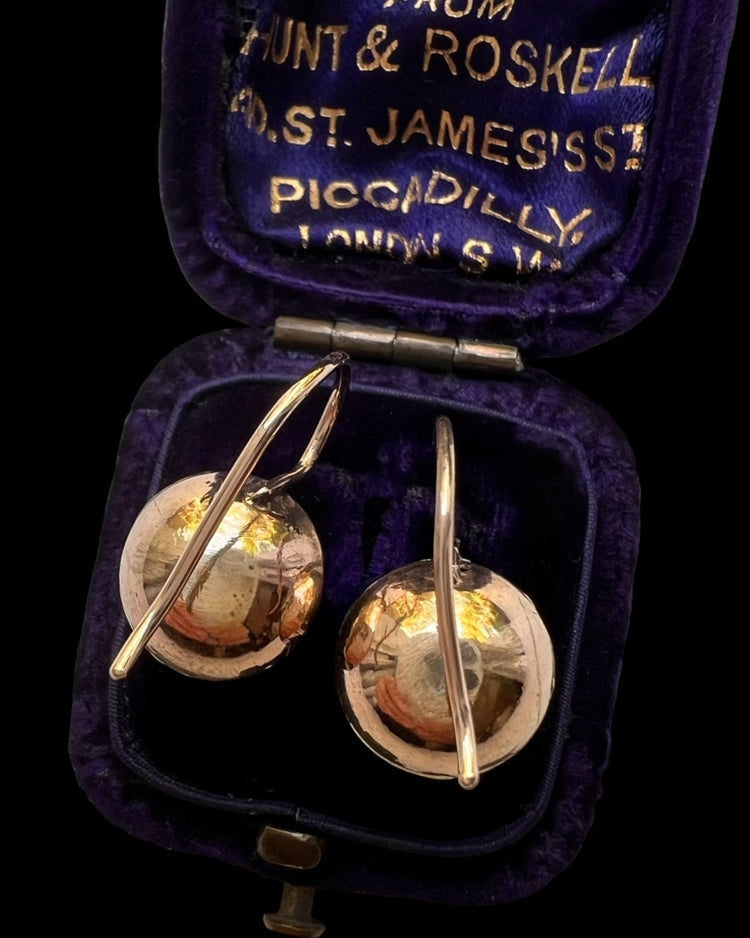 Likely converted from buttons or cufflinks, the earrings have been set with 9ct gold shepherds hook wires.
