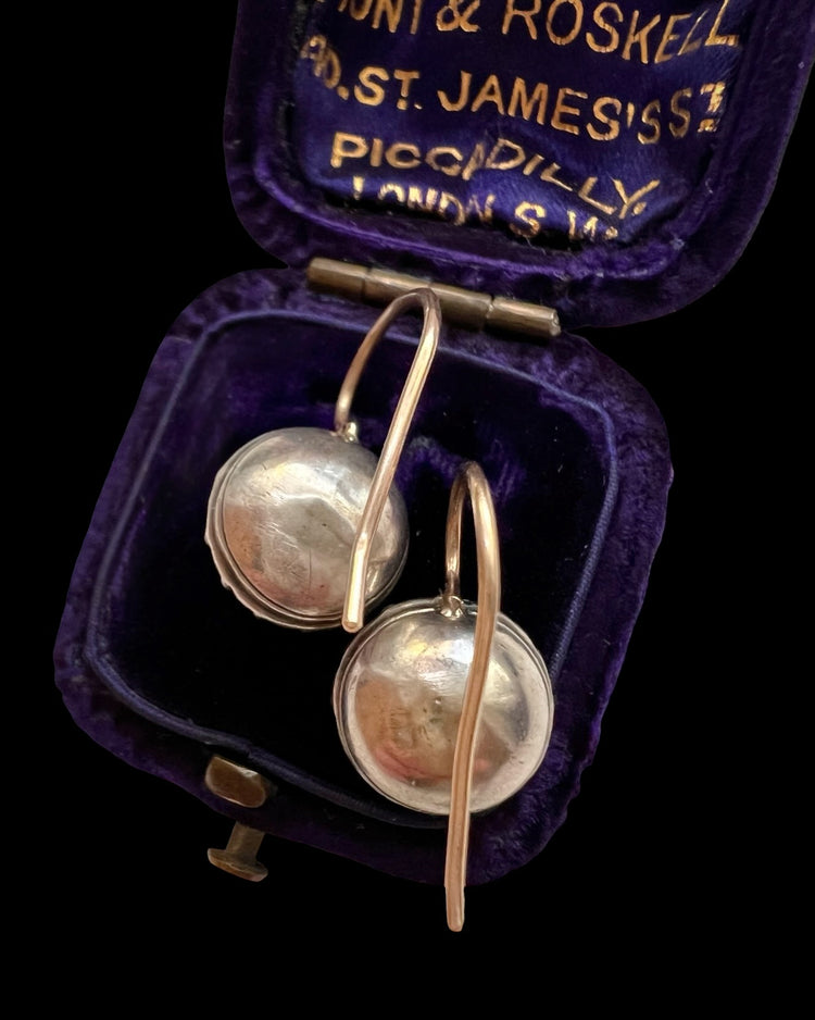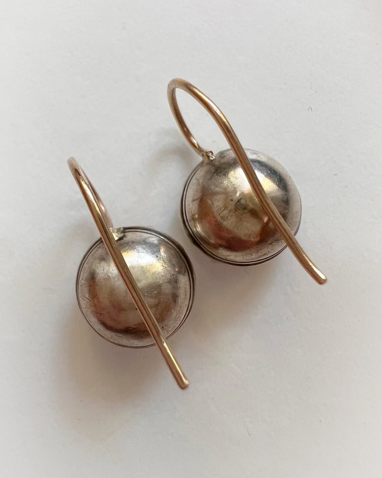 Likely converted from buttons or cufflinks, the earrings have been set with 9ct gold shepherds hook wires.