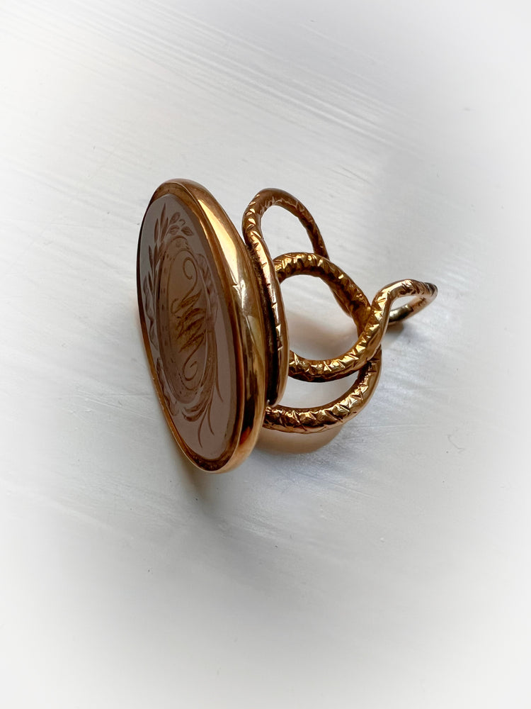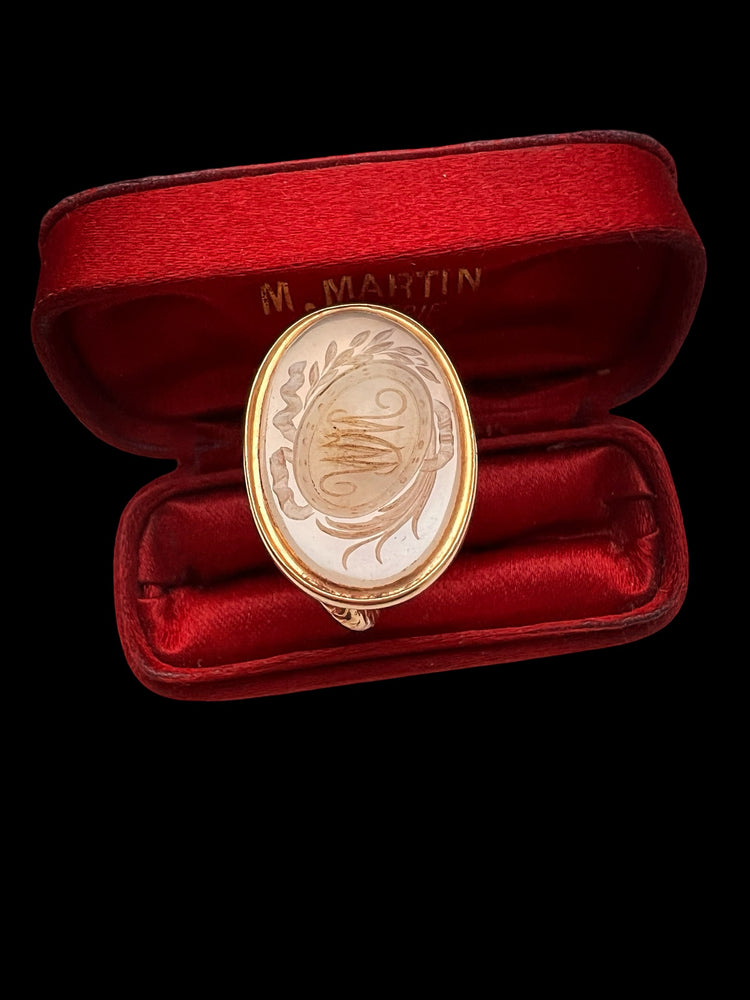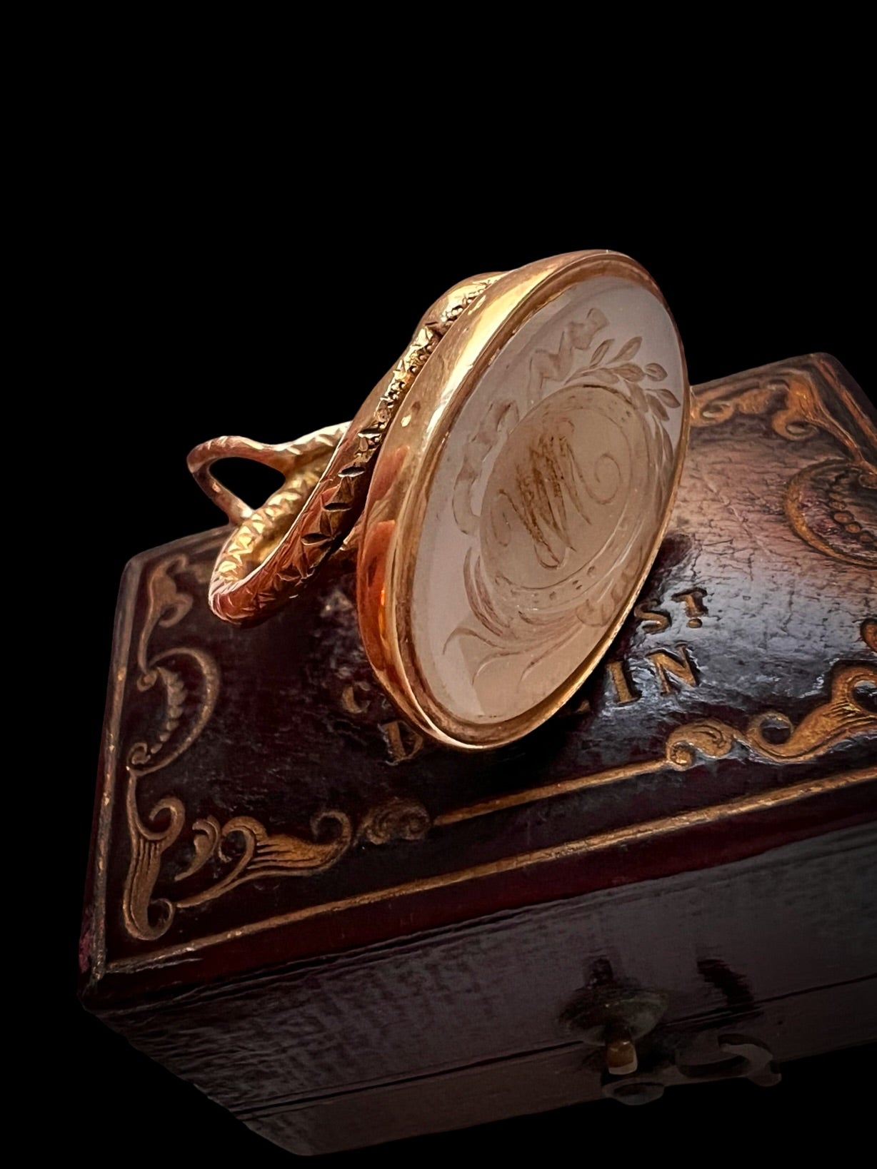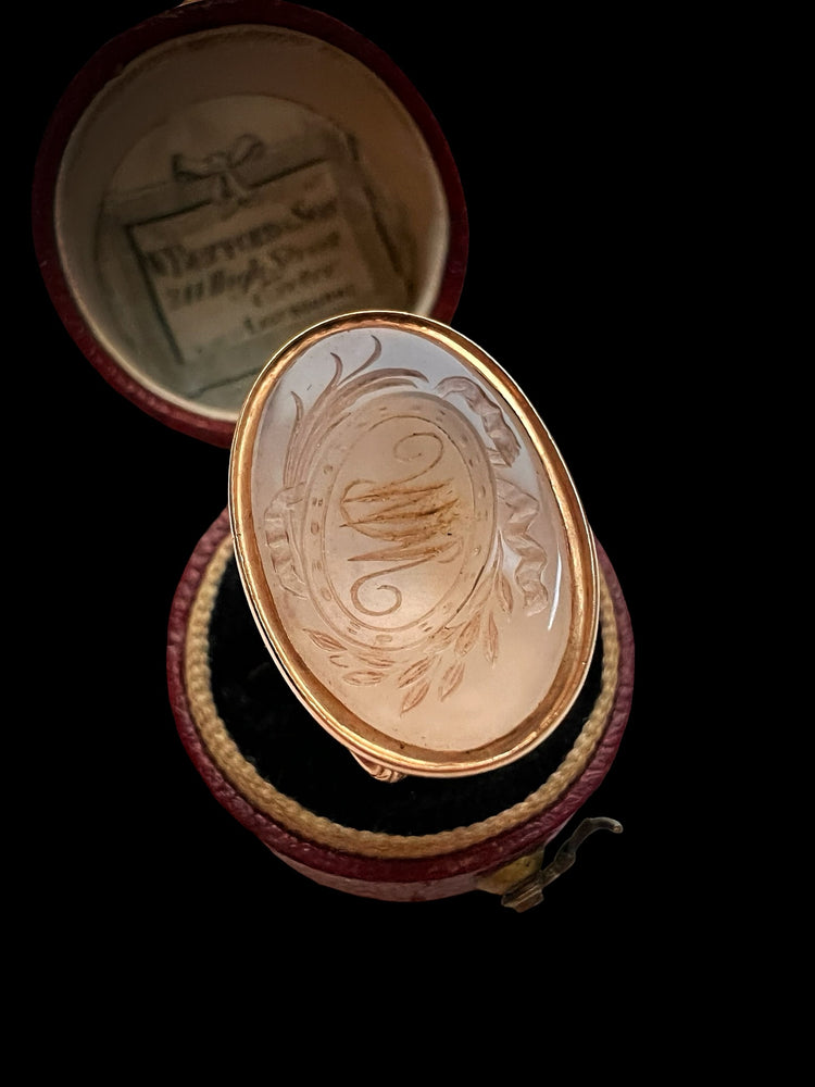 The intaglio, is a chalcedony stone engraved with the initials ‘WM’ or ‘MW’ surrounded by a garter and a foliate design.