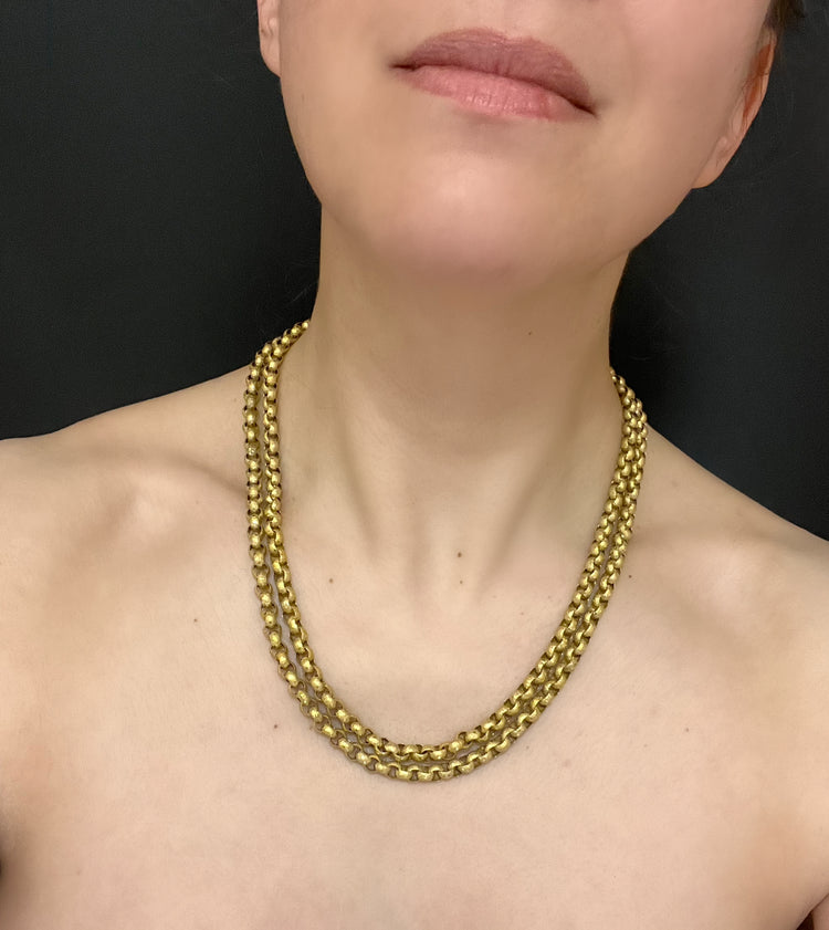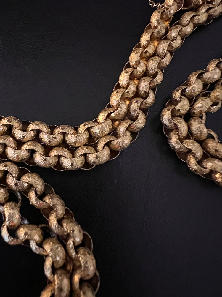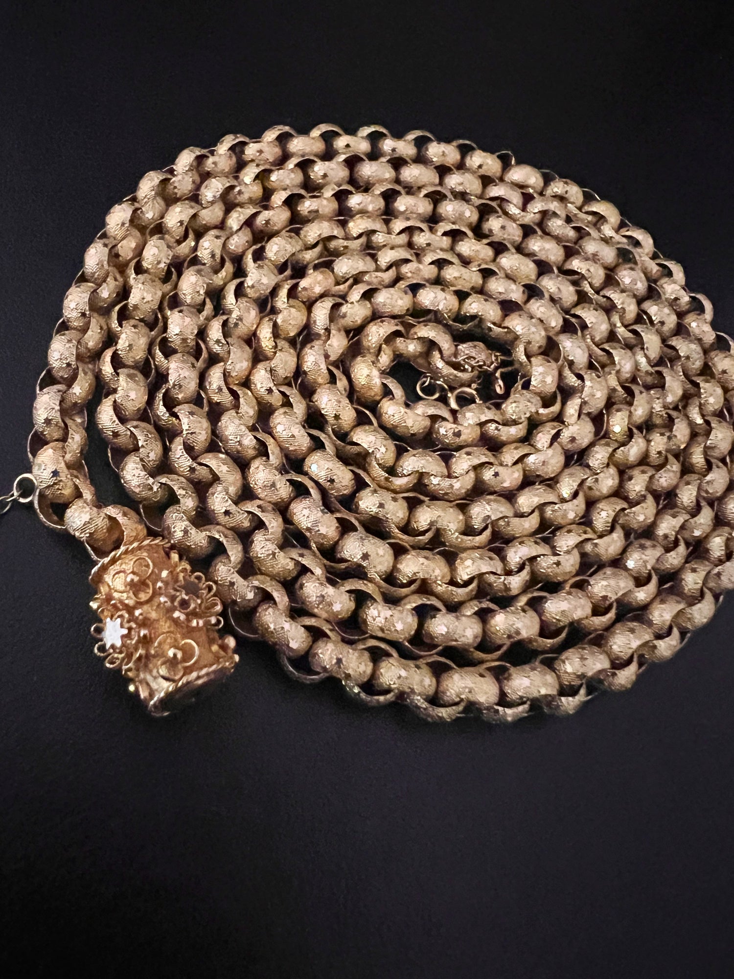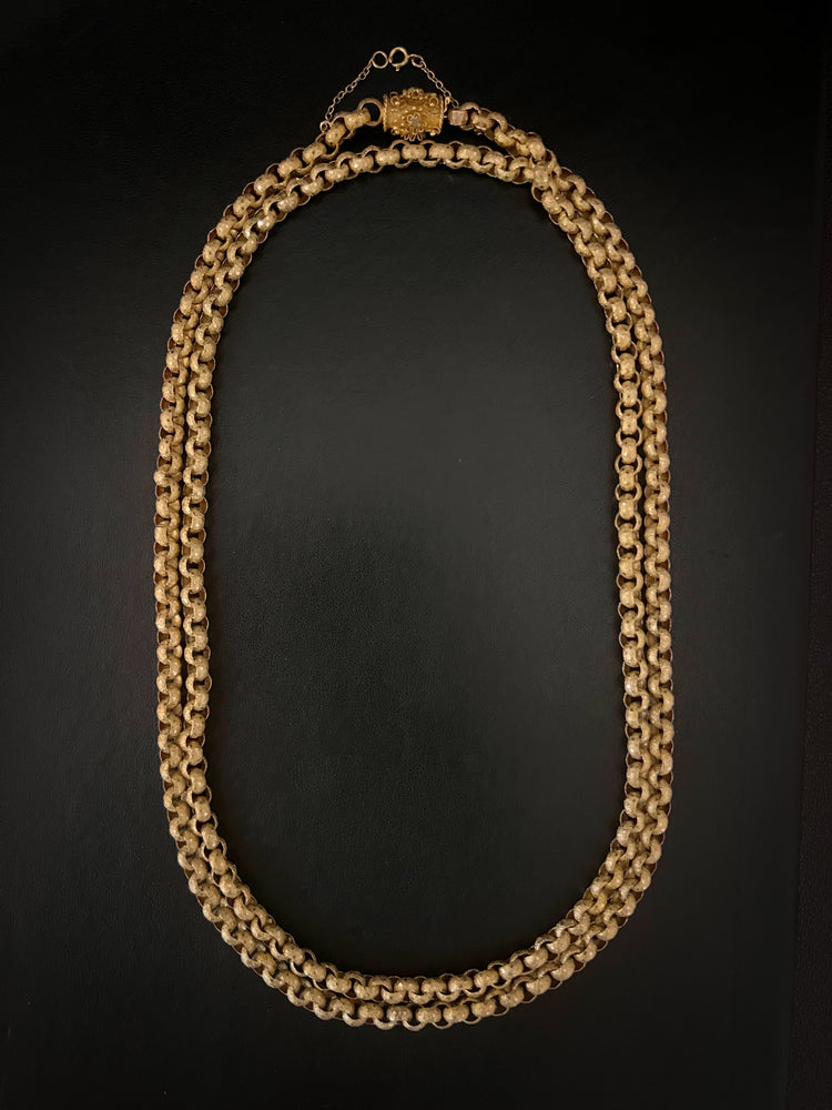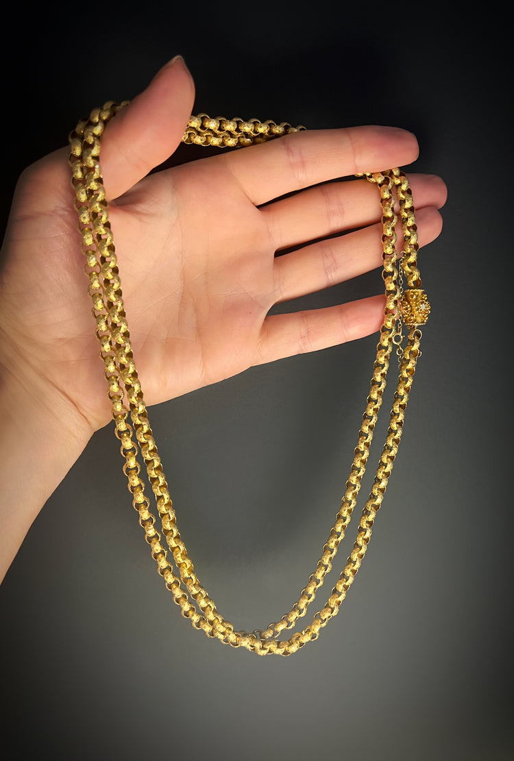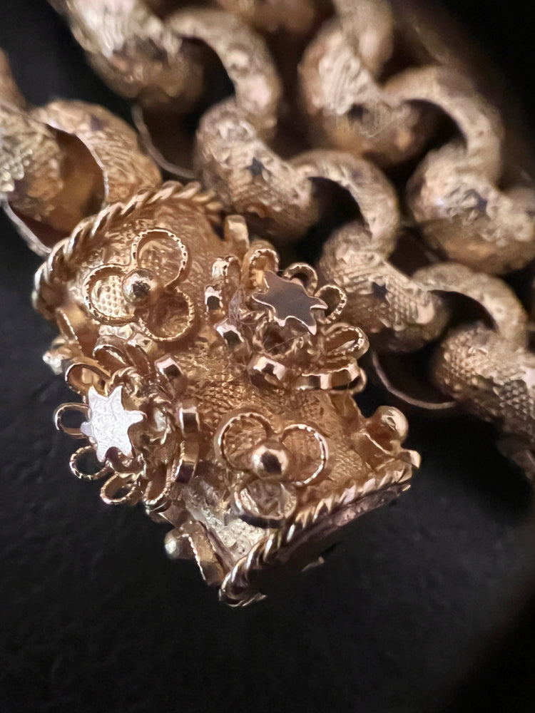 Circa 1820, the chain is made from 15ct gold, each link is textured, and is covered with tiny stars.