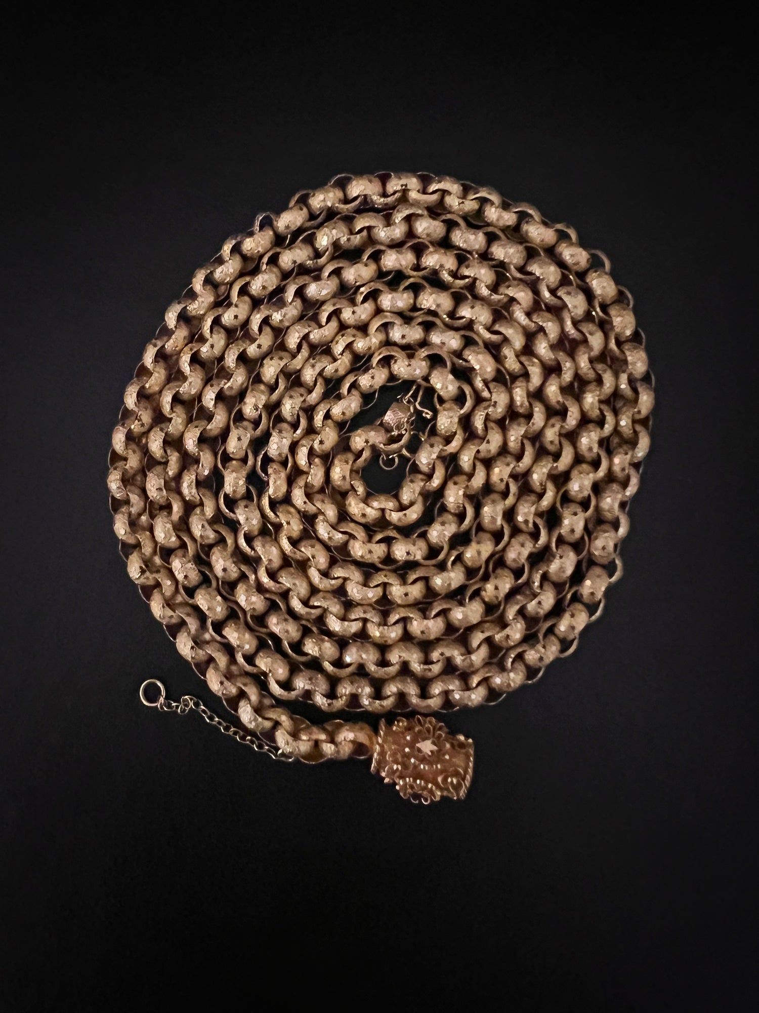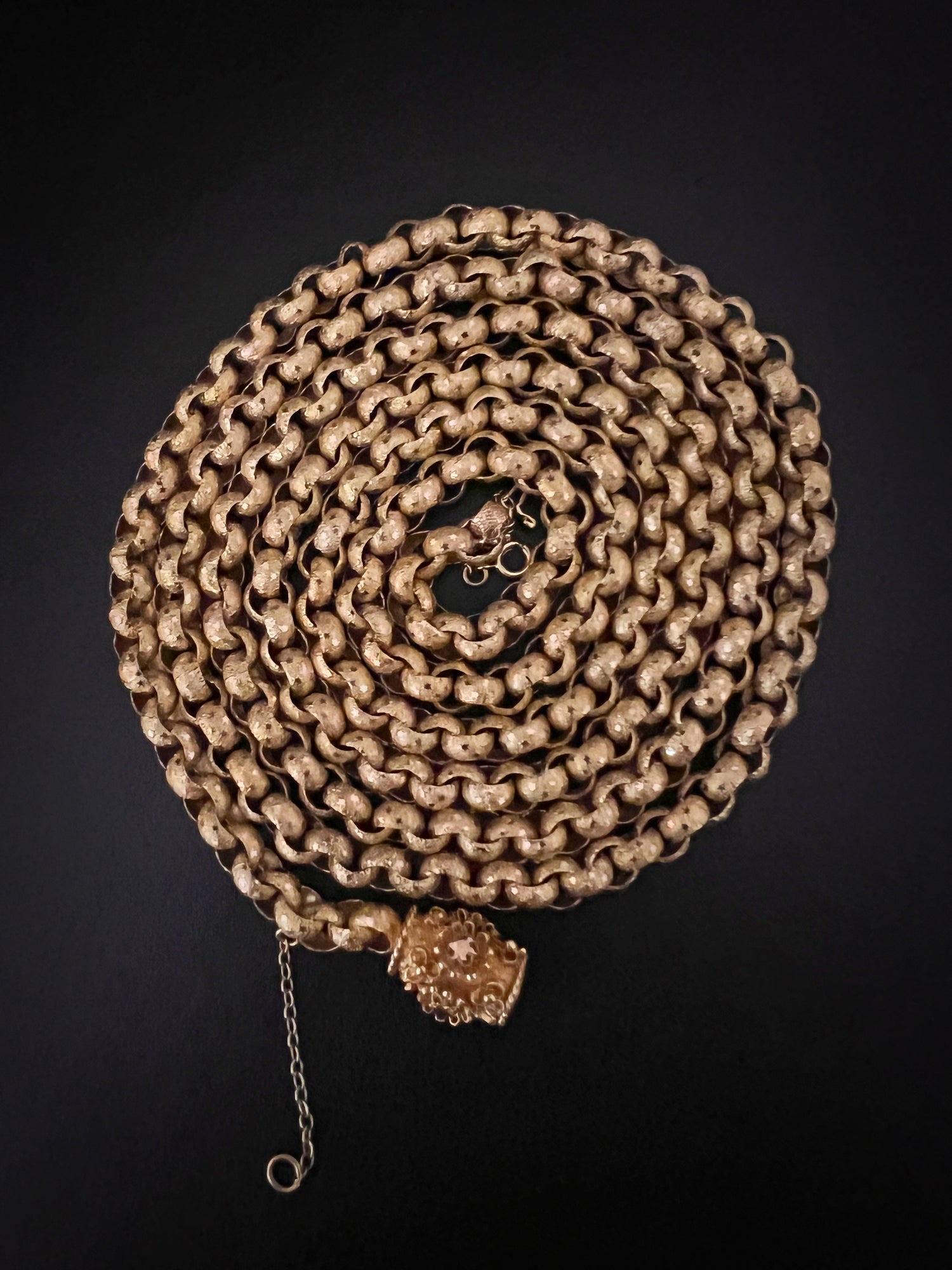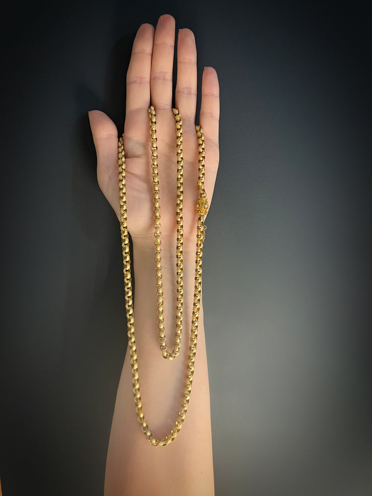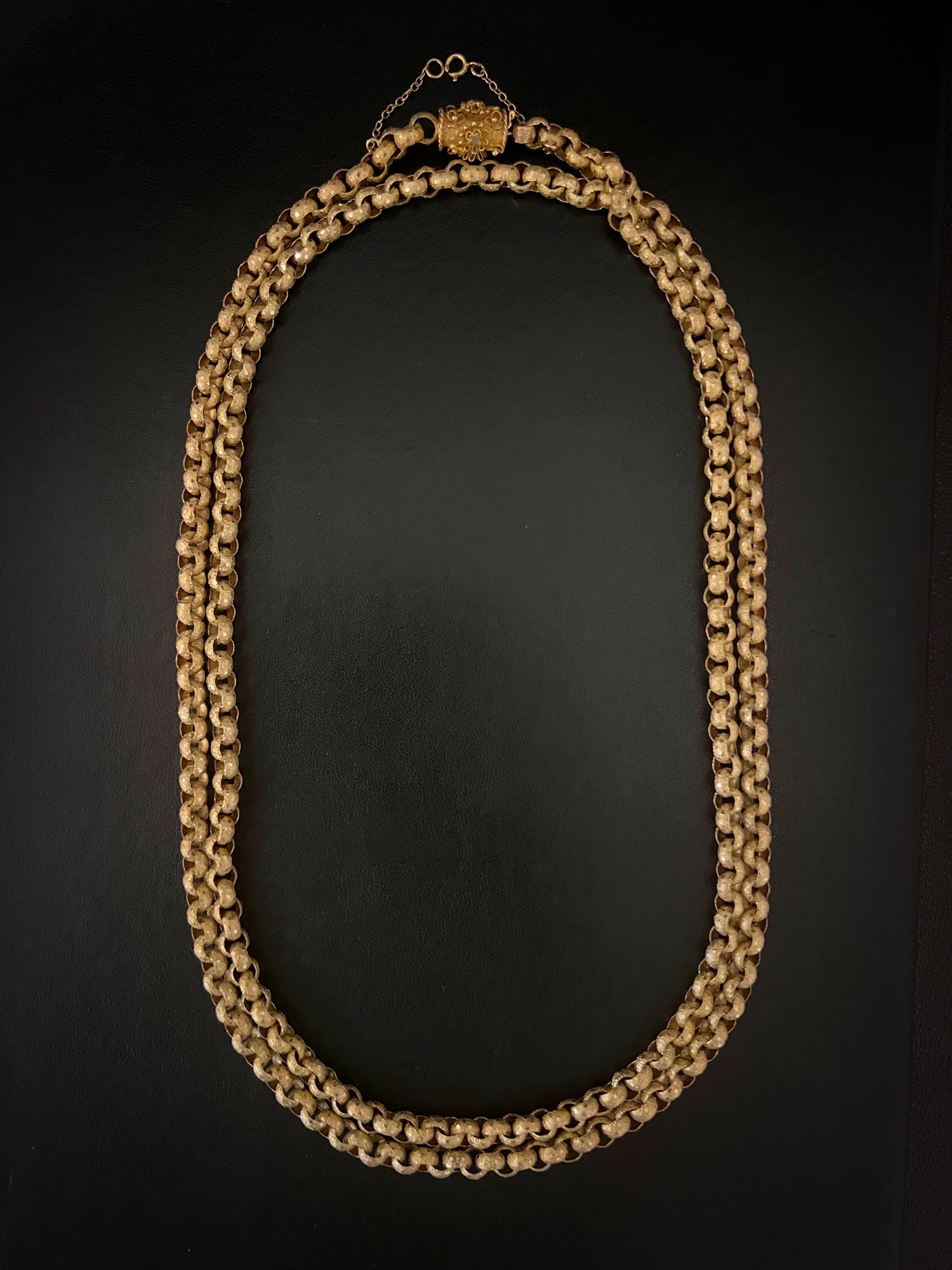 Circa 1820, the chain is made from 15ct gold, each link is textured, and is covered with tiny stars.
