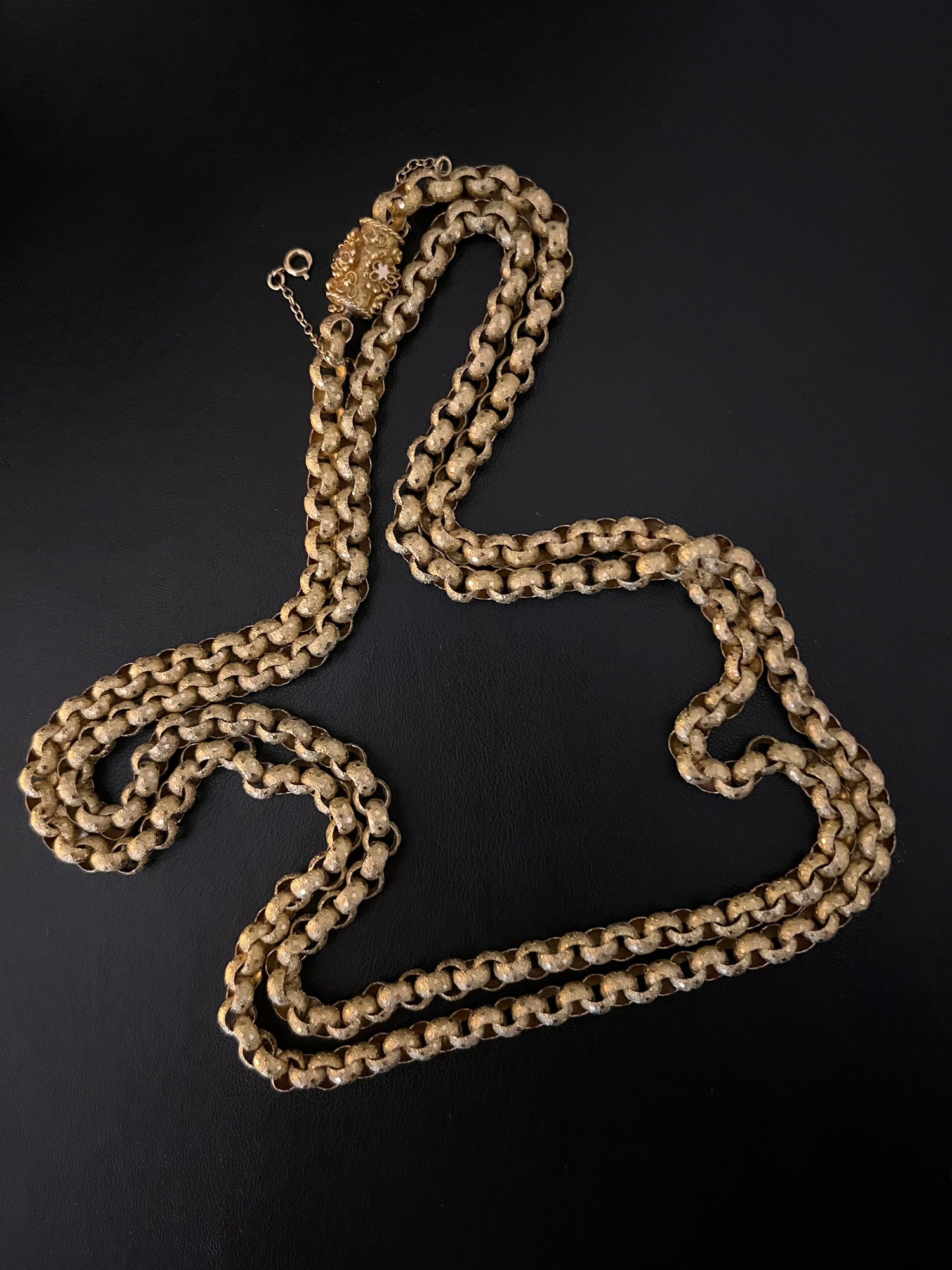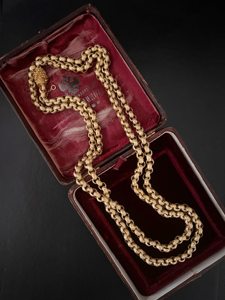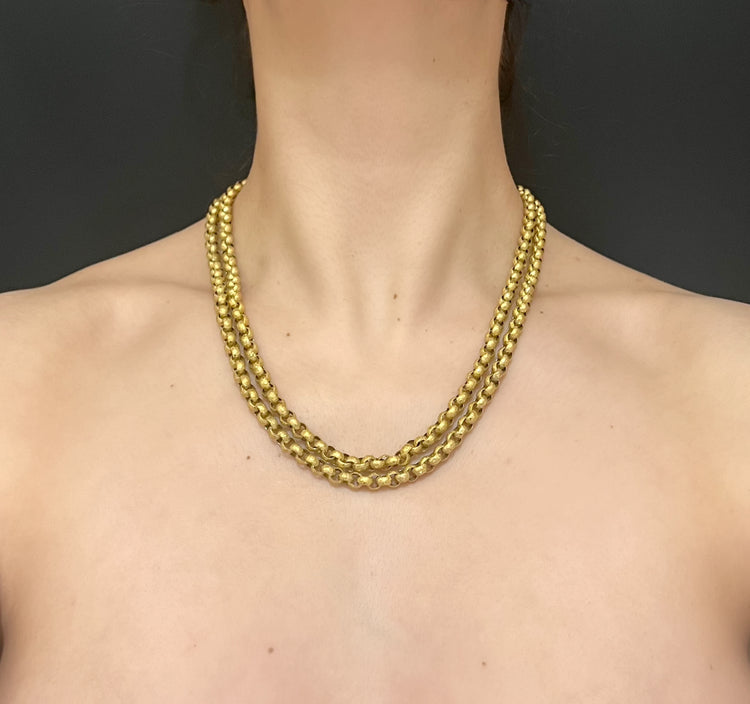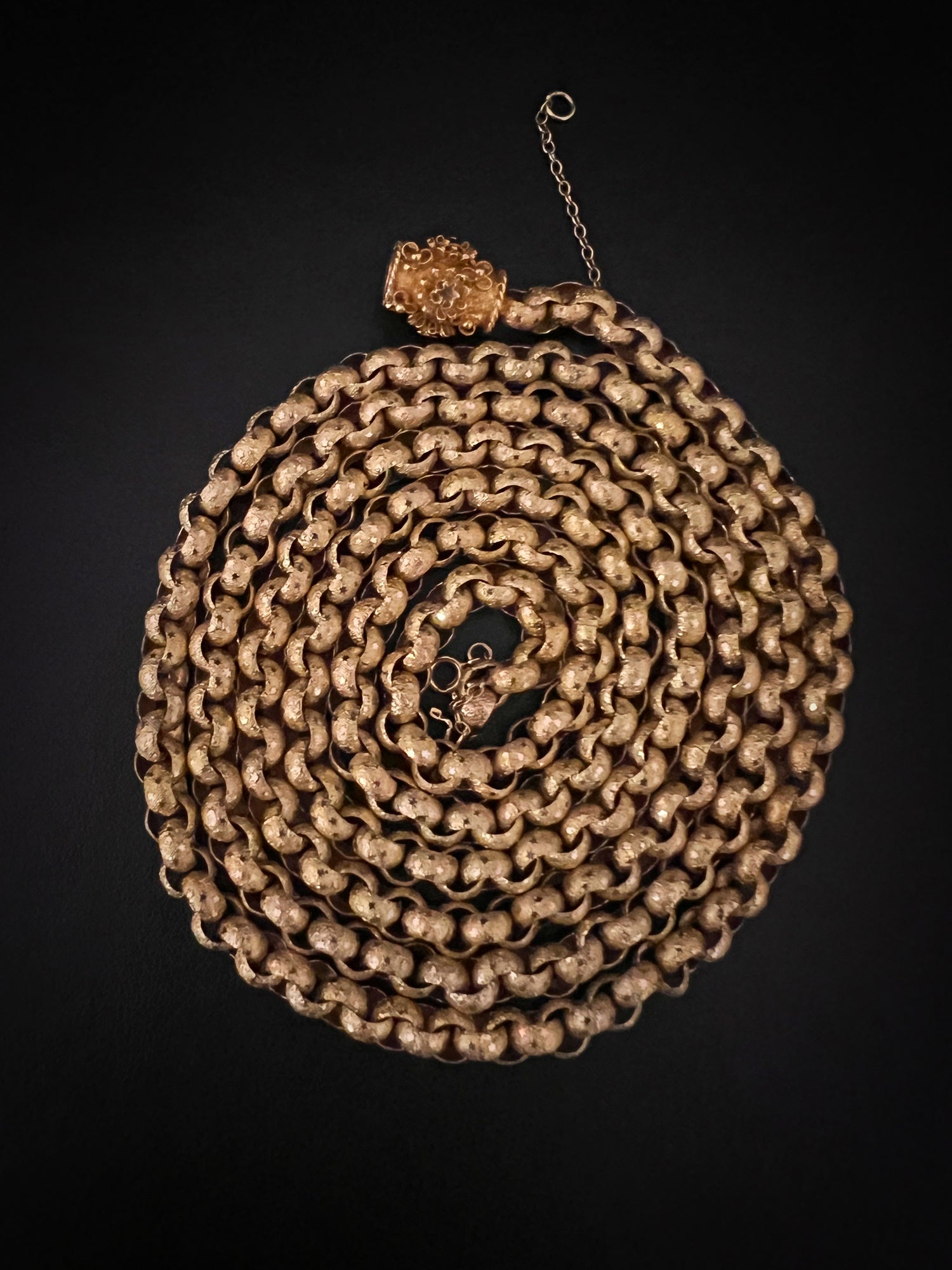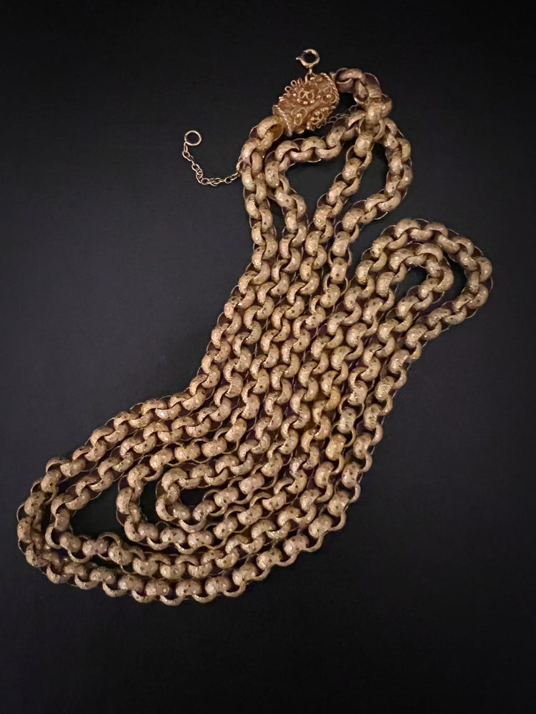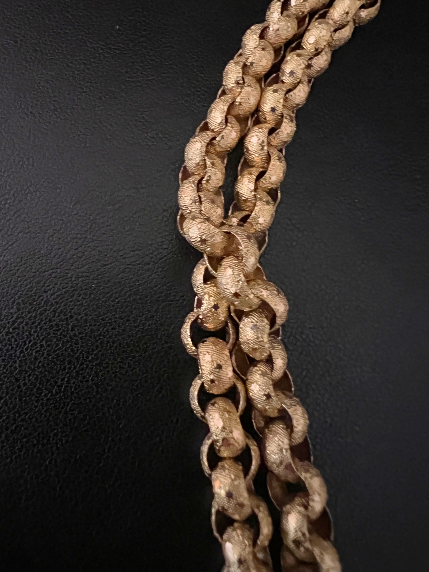 Circa 1820, the chain is made from 15ct gold, each link is textured, and is covered with tiny stars.