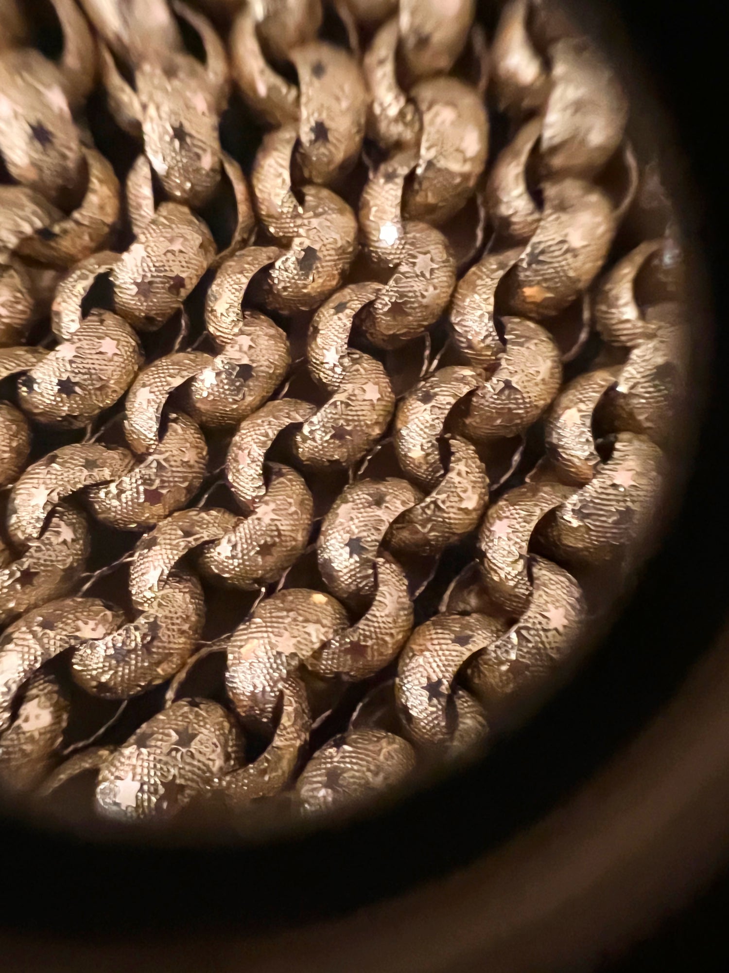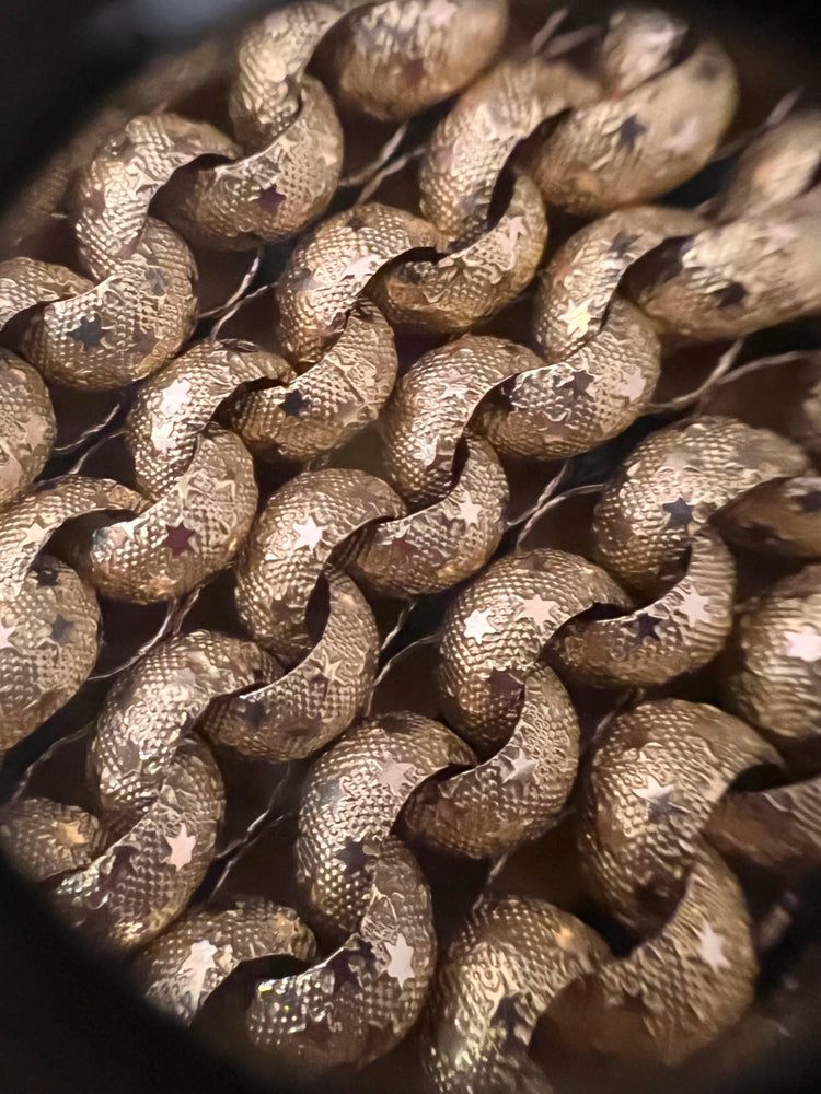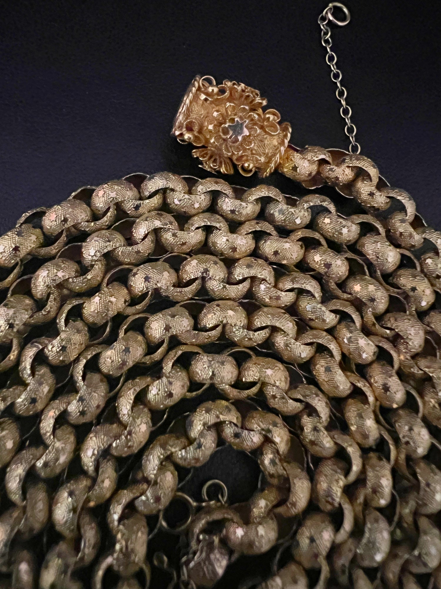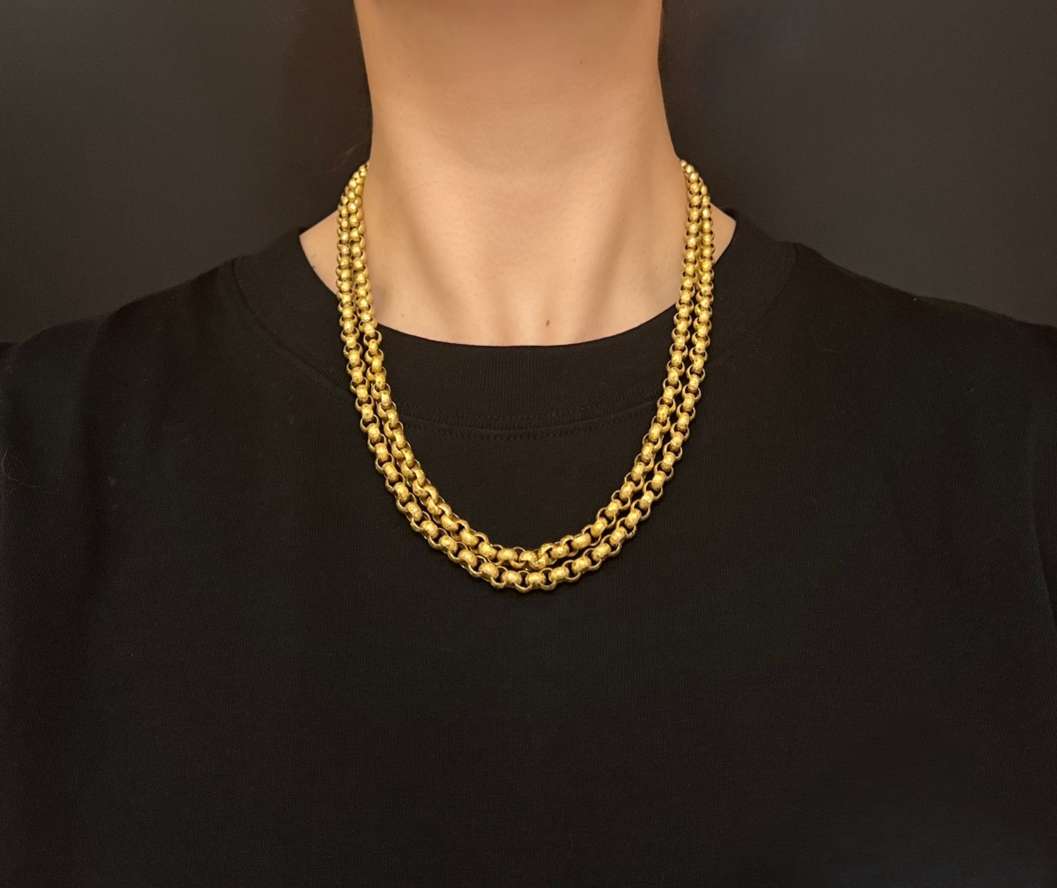 Circa 1820, the chain is made from 15ct gold, each link is textured, and is covered with tiny stars.