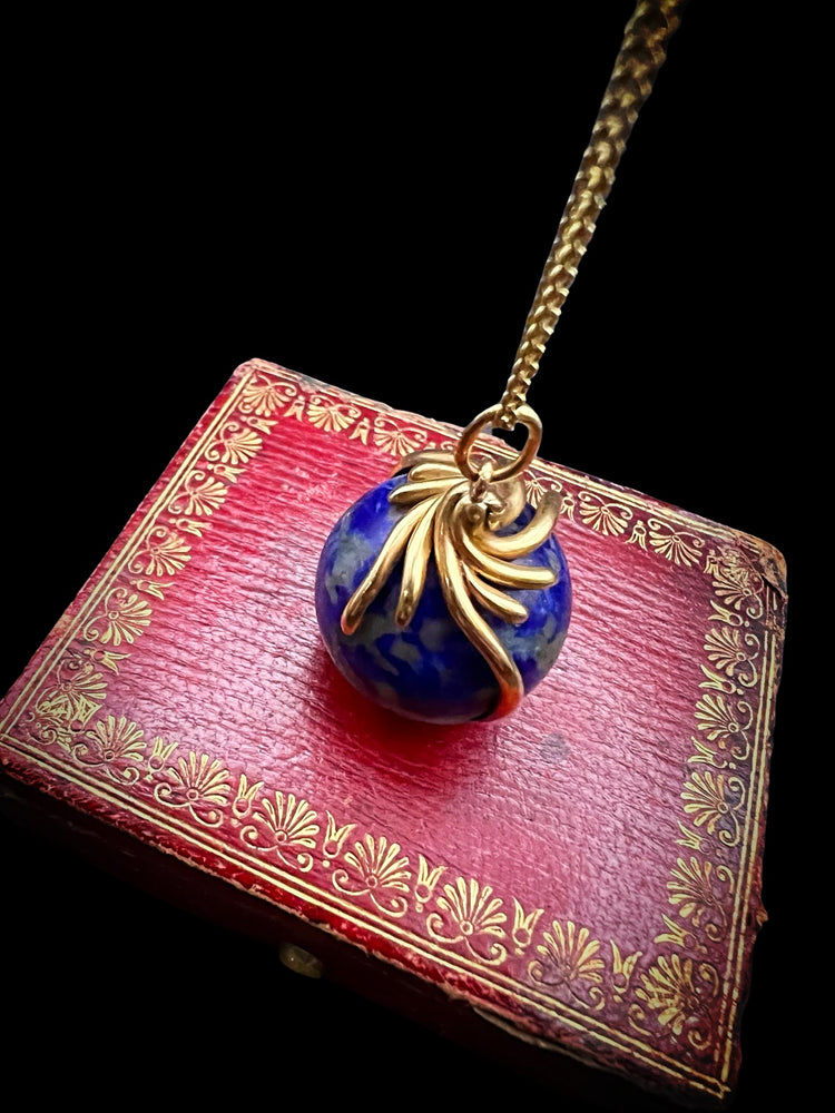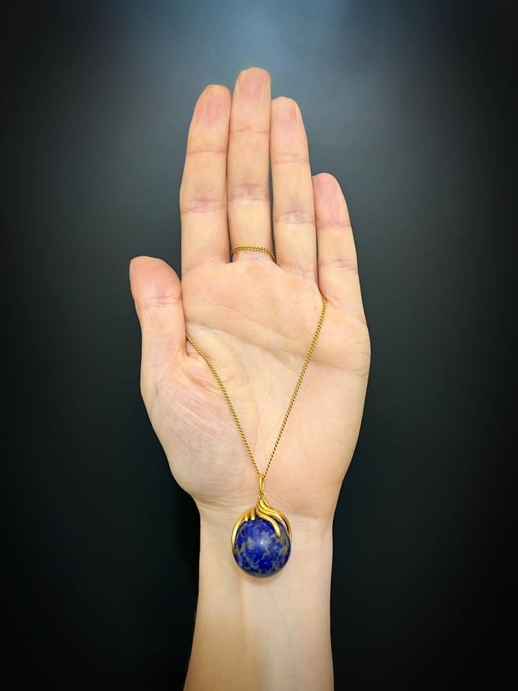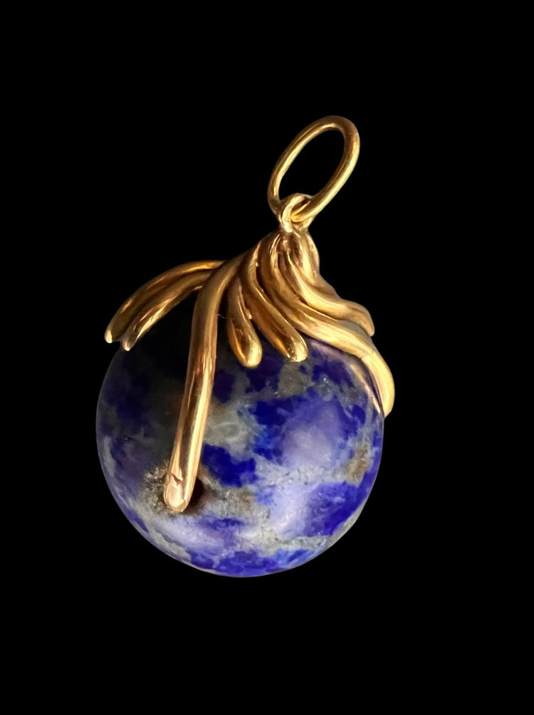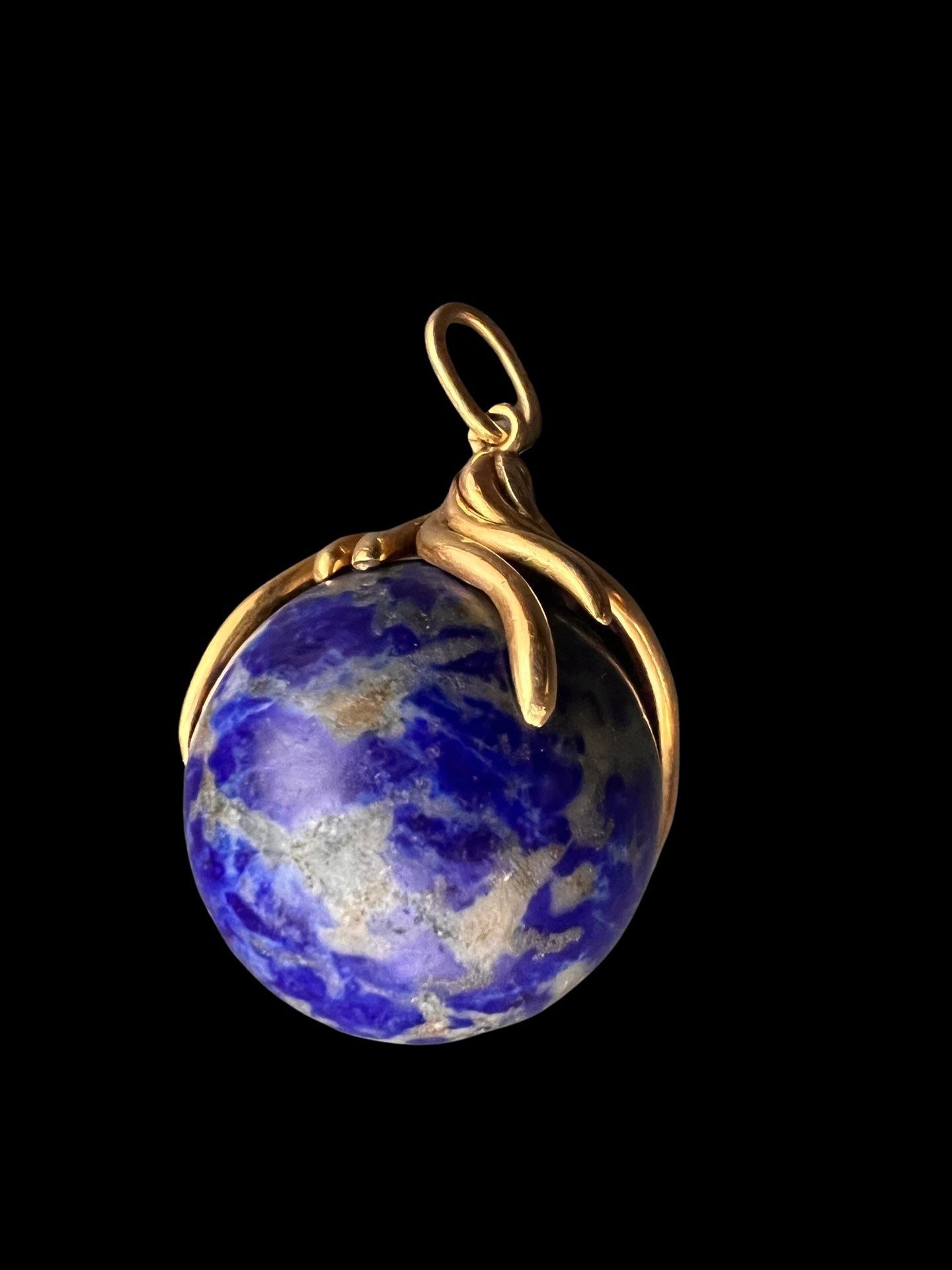 The sphere rotates below the gold swirled bail, which is fixed with a bar through the Lapis.