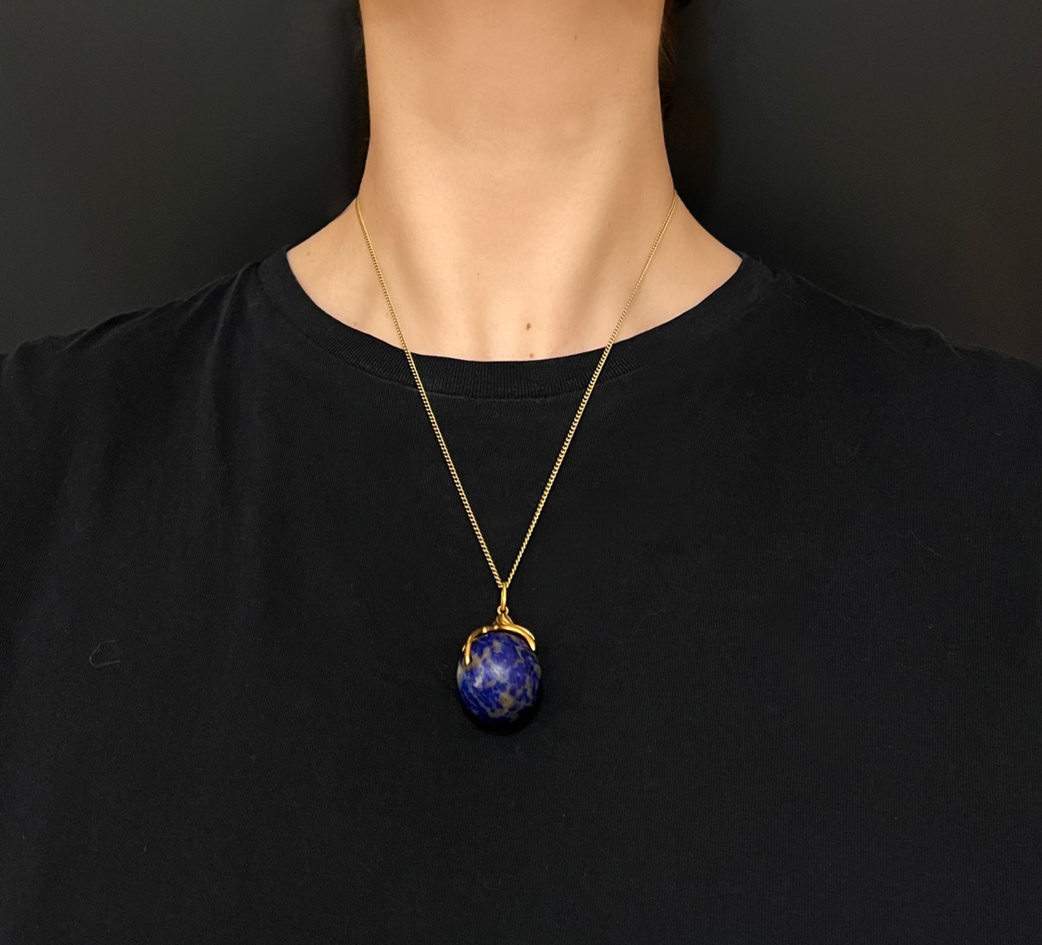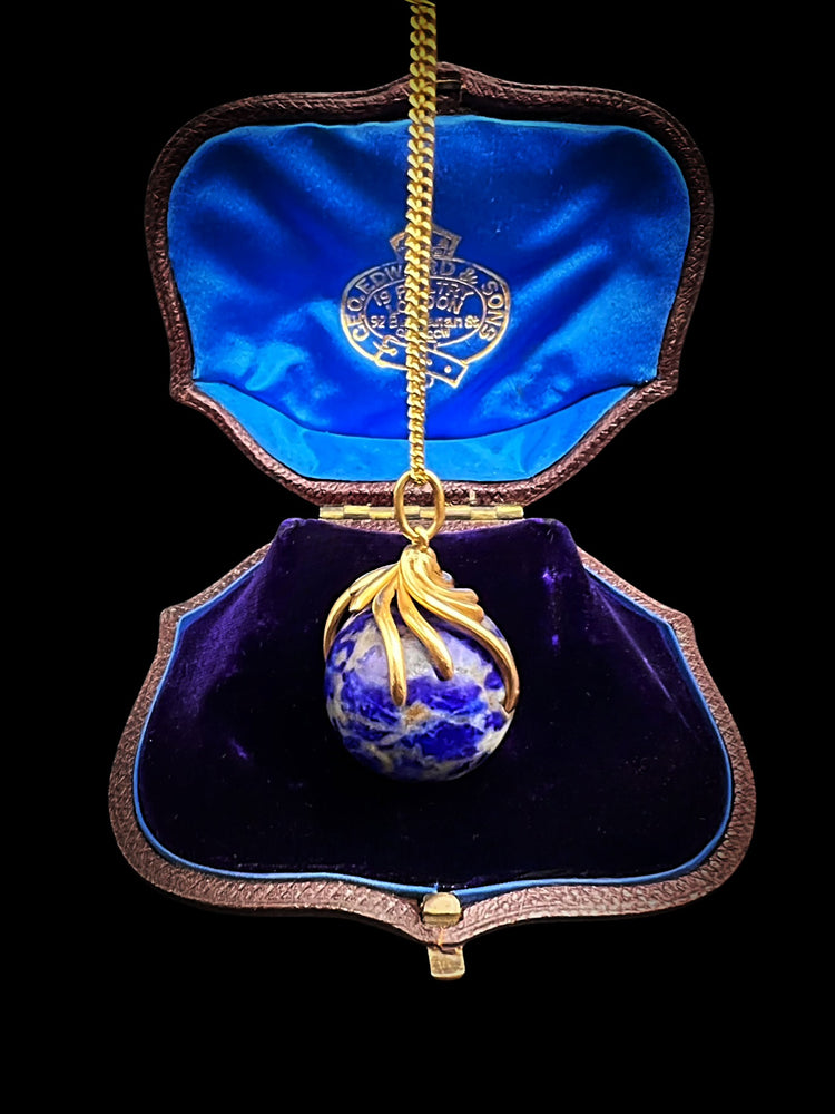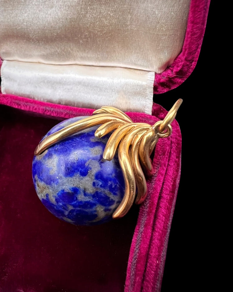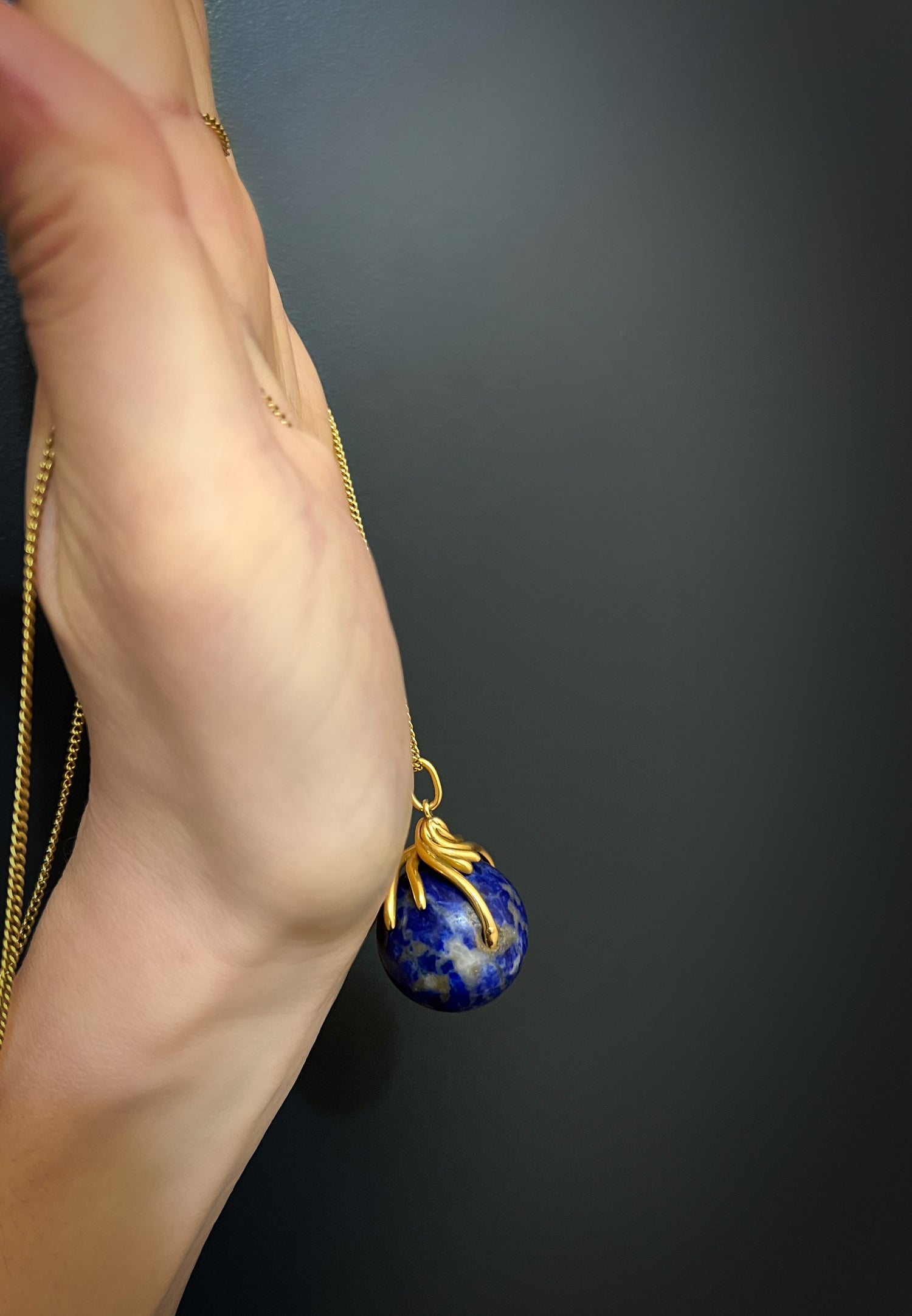 The sphere rotates below the gold swirled bail, which is fixed with a bar through the Lapis.