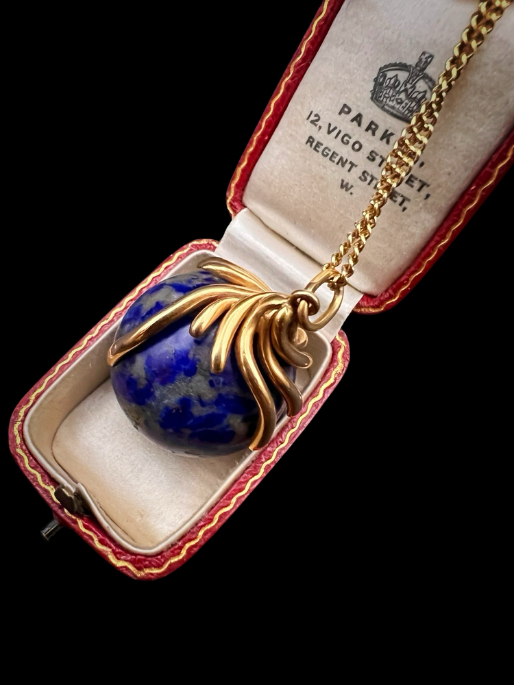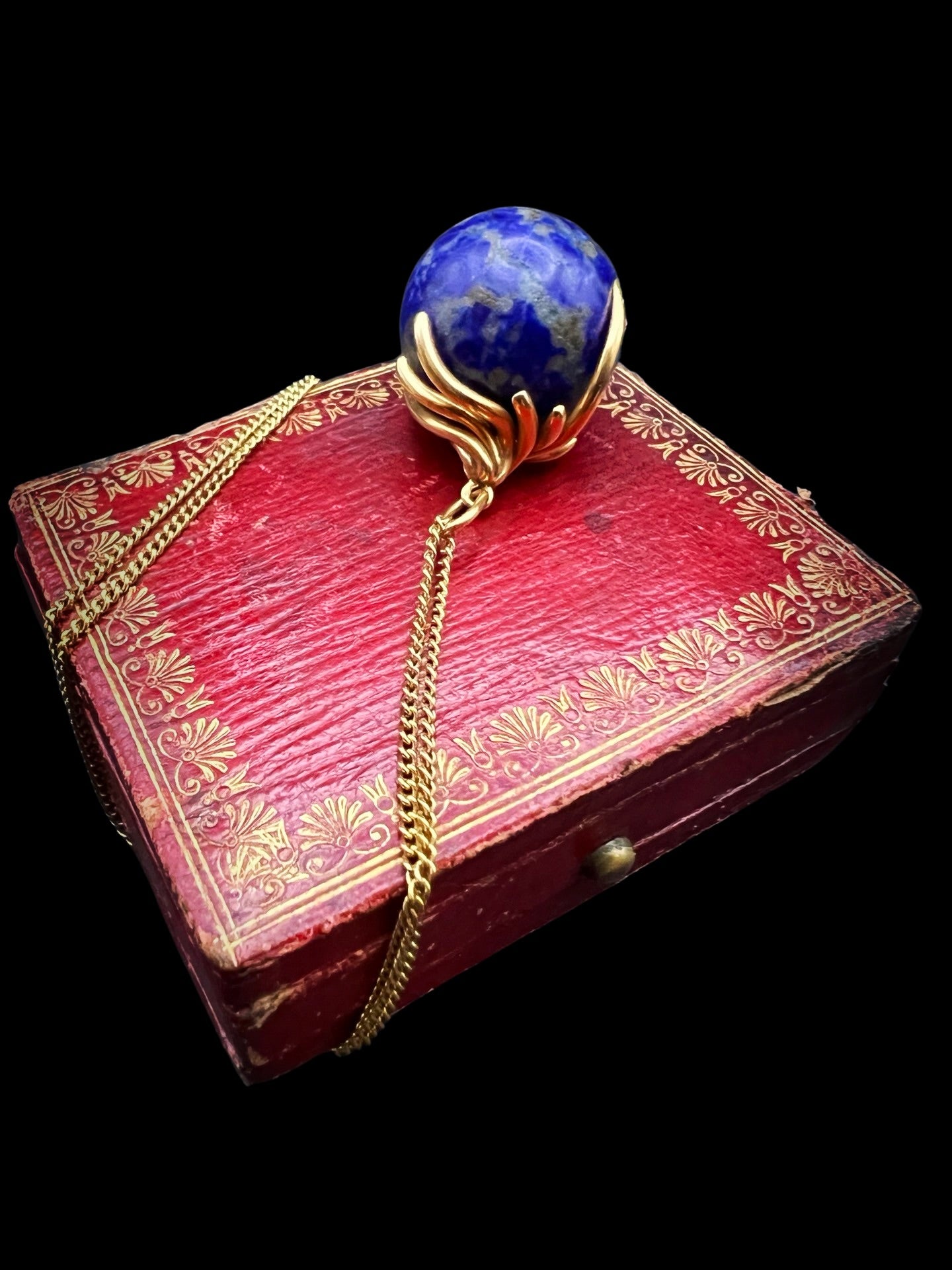 A super stylish pendant made of a sphere of Lapis lazuli surmounted by a gorgeous twisted 18ct gold bail.