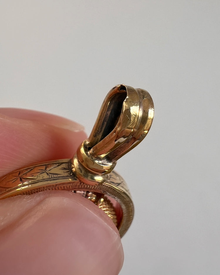 It hangs under a curved gold frame and bail which has star chasing along the outside of the curved frame.