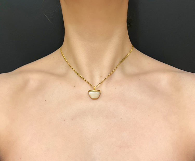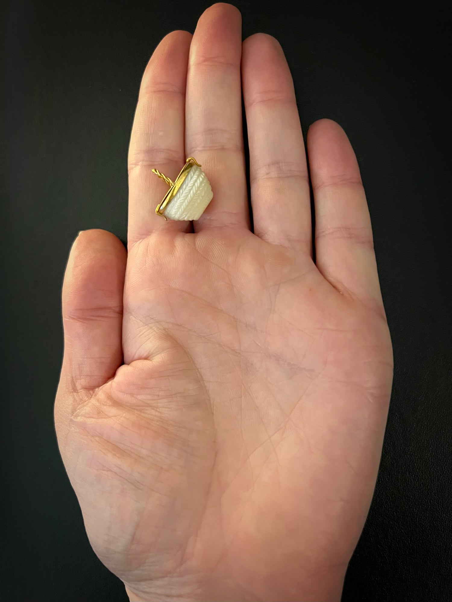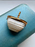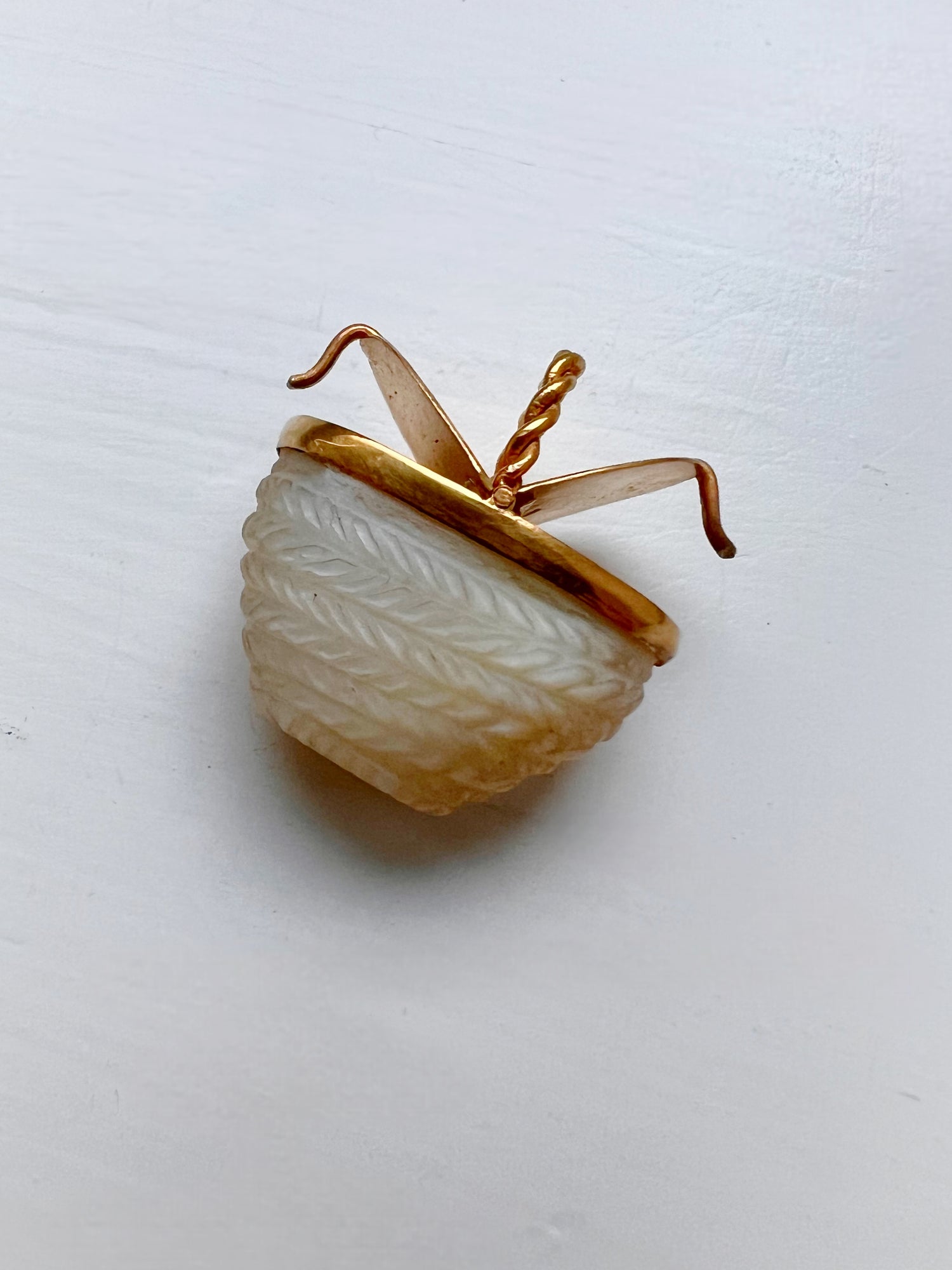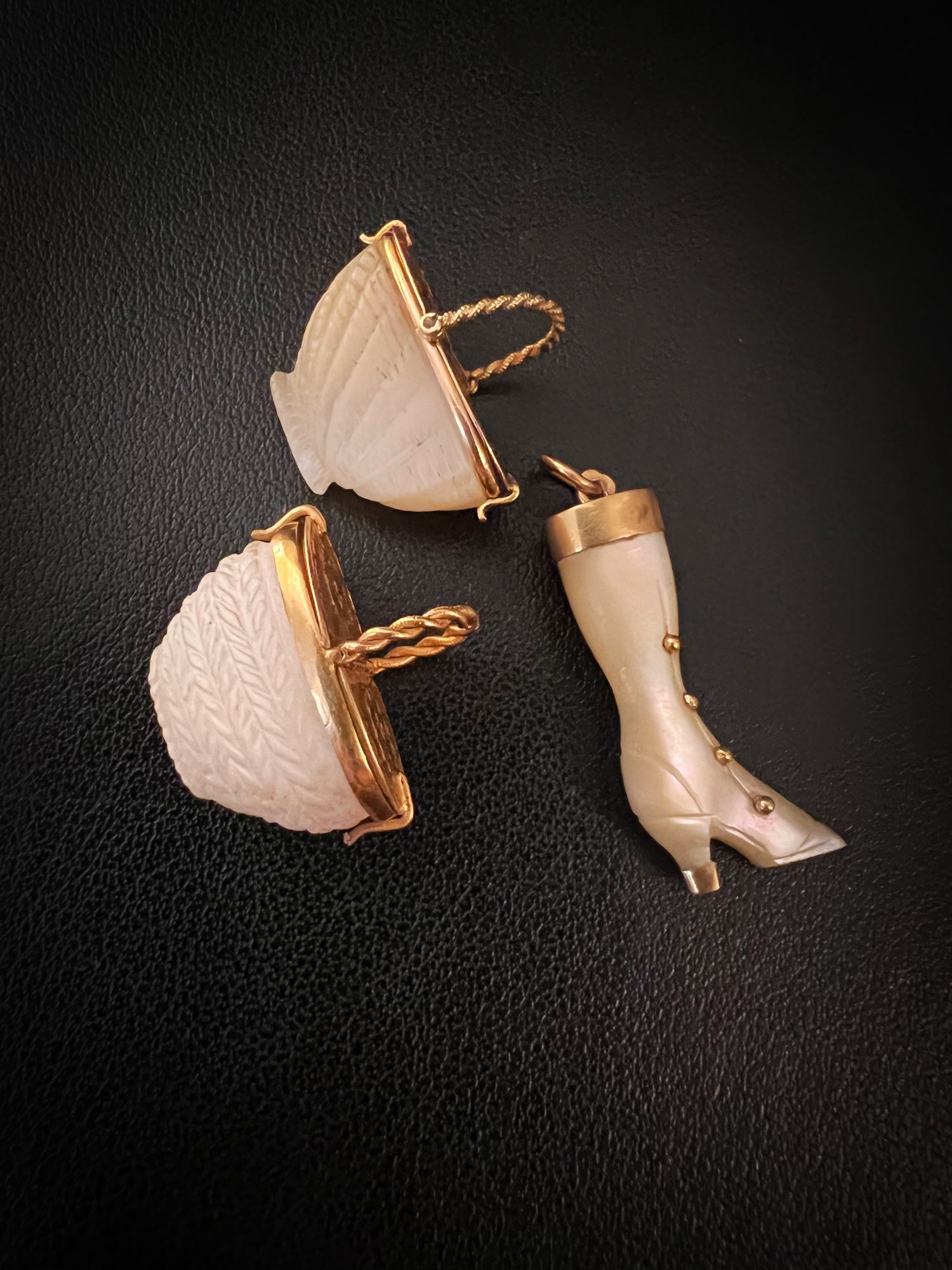 The Mother of Pearl has been beautifully carved to look like wicker, and catches the light perfectly to  show all the lovely hues of the Mother of Pearl.