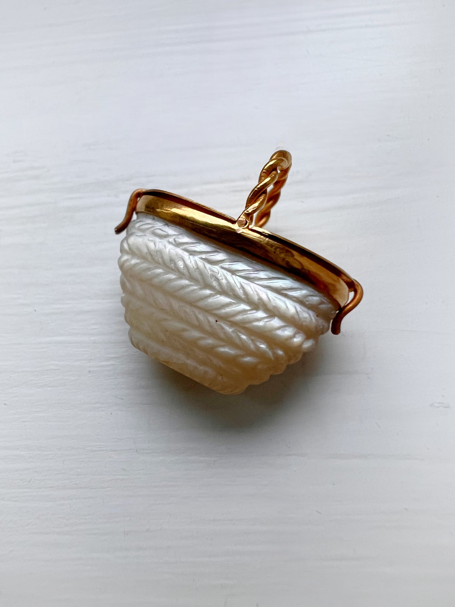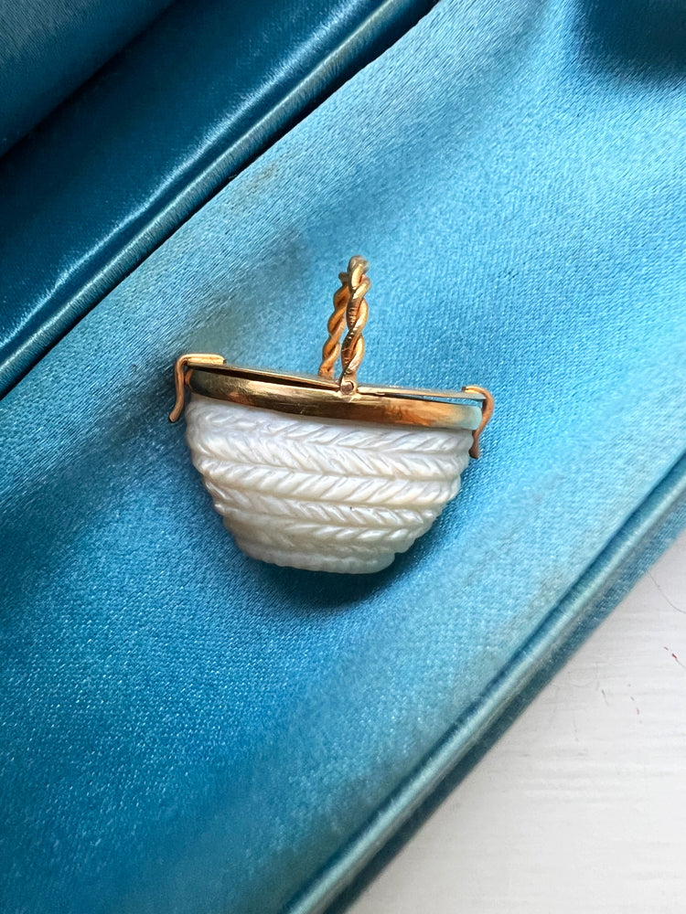 A 19th century, Mother of Pearl basket pendant, with a 15ct gold top and handle. Circa 1830/40