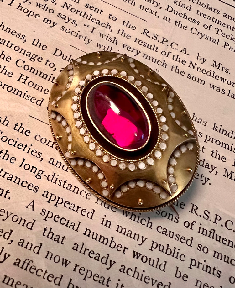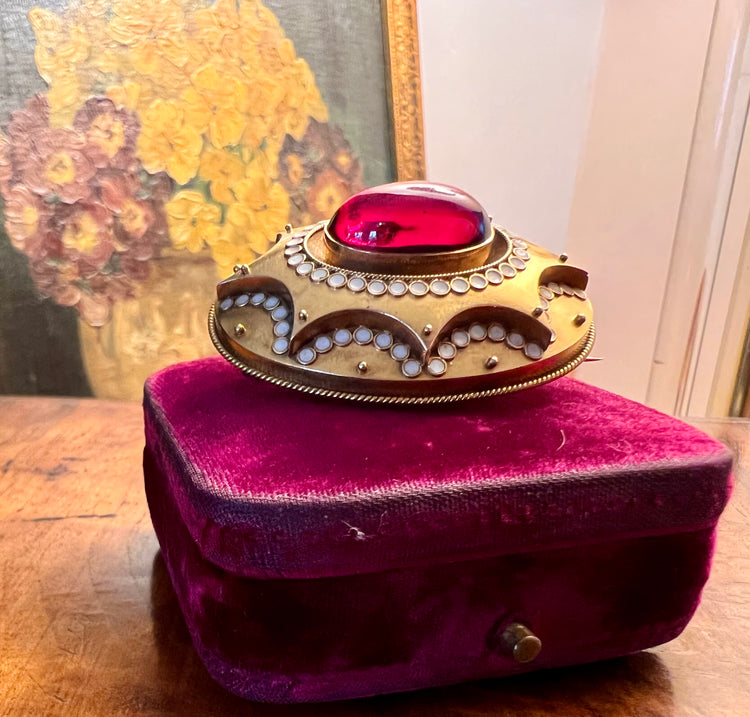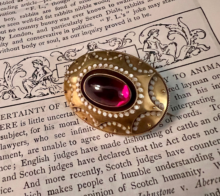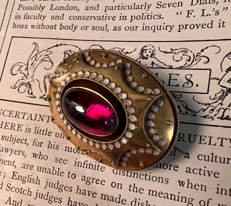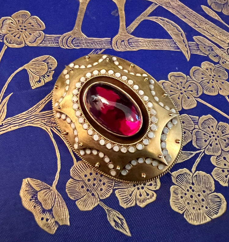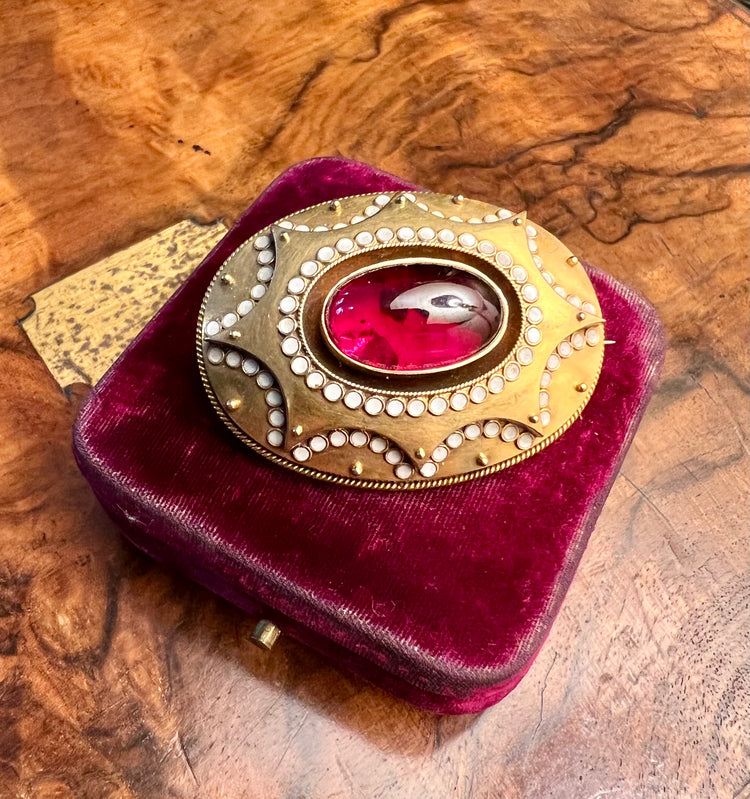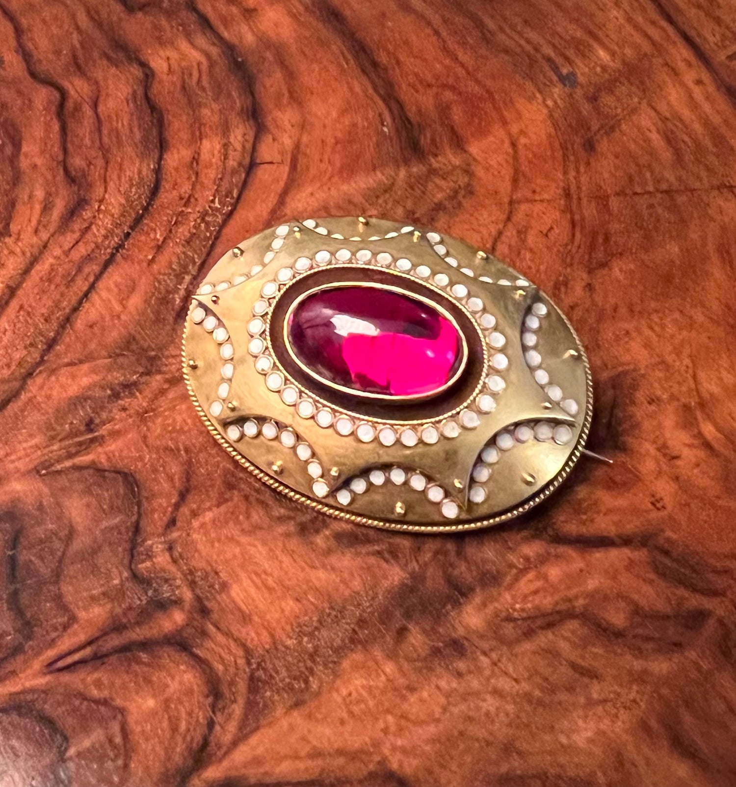 LARGE VICTORIAN 15CT GOLD, GARNET & ENAMEL BROOCH