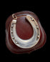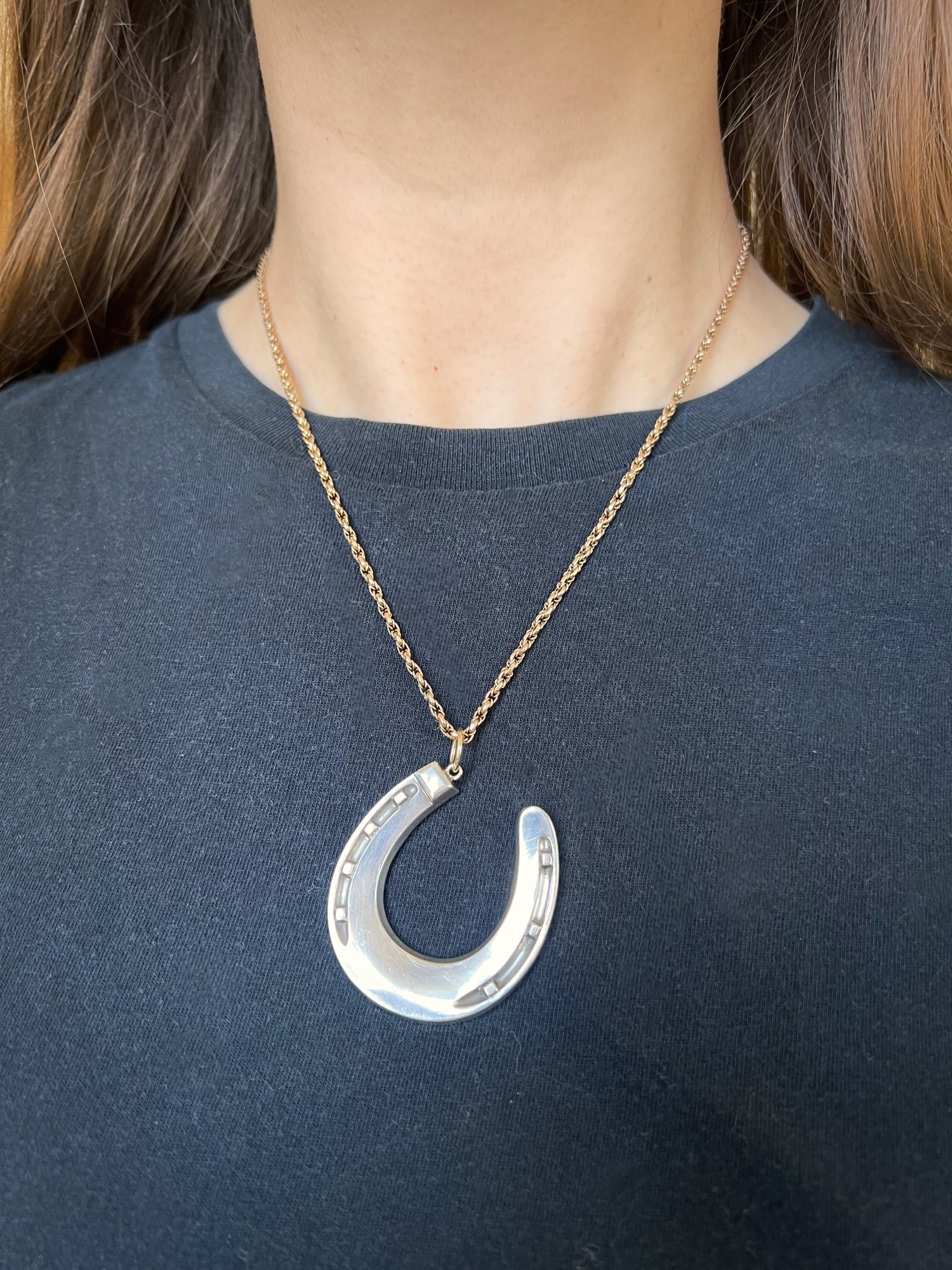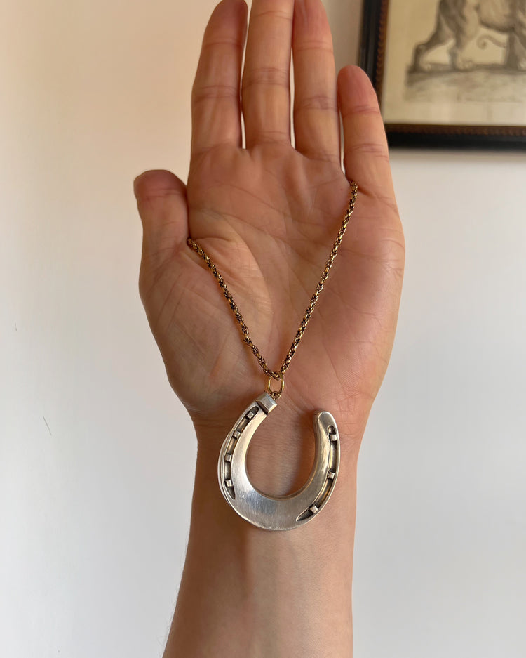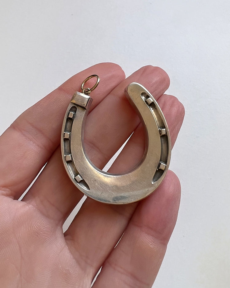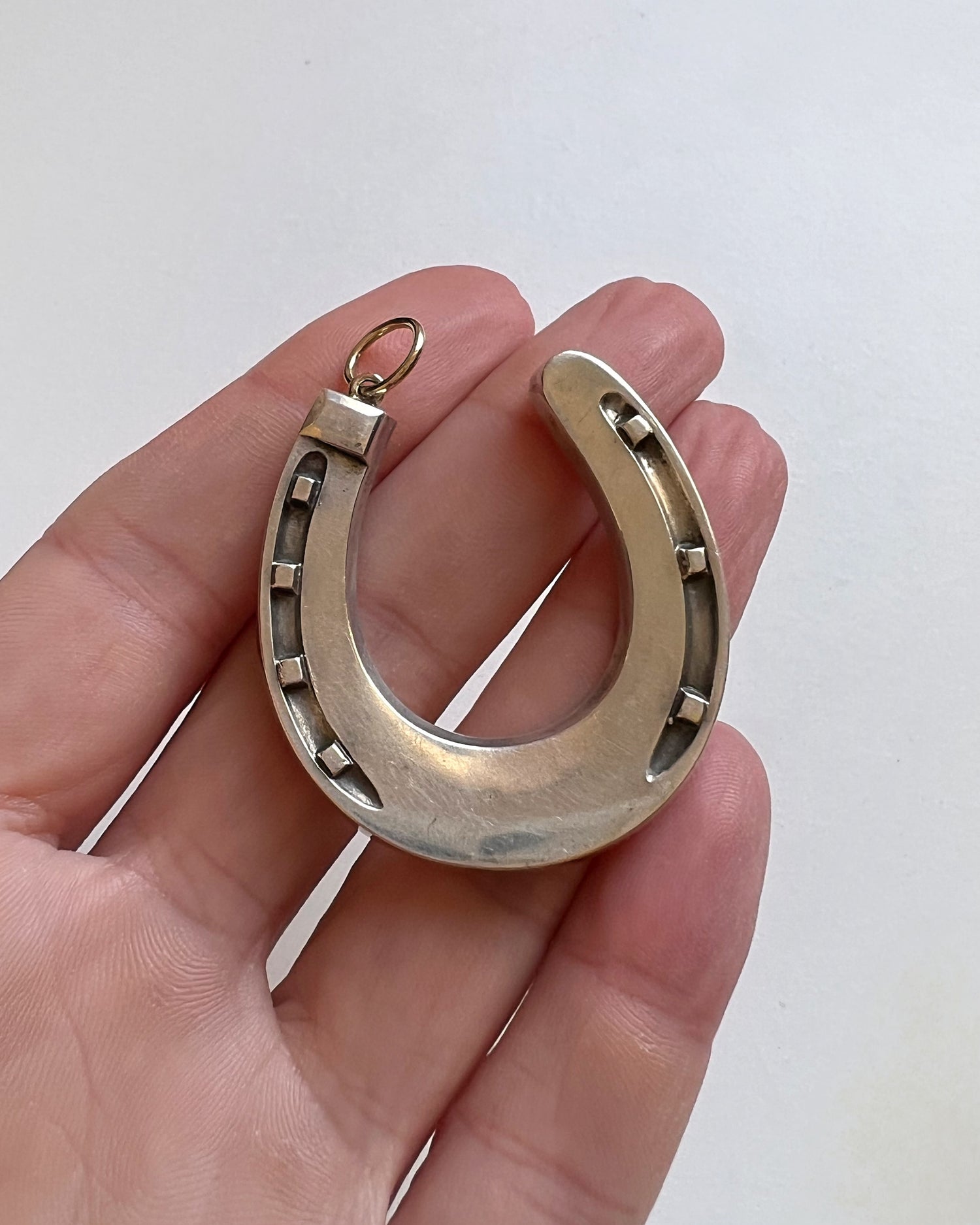 The hollow chunky horseshoe is made of silver, with a 15ct gold large jump ring.