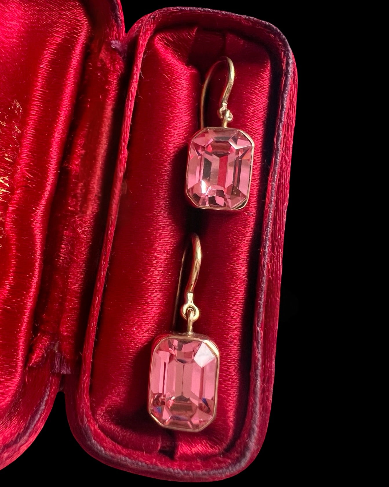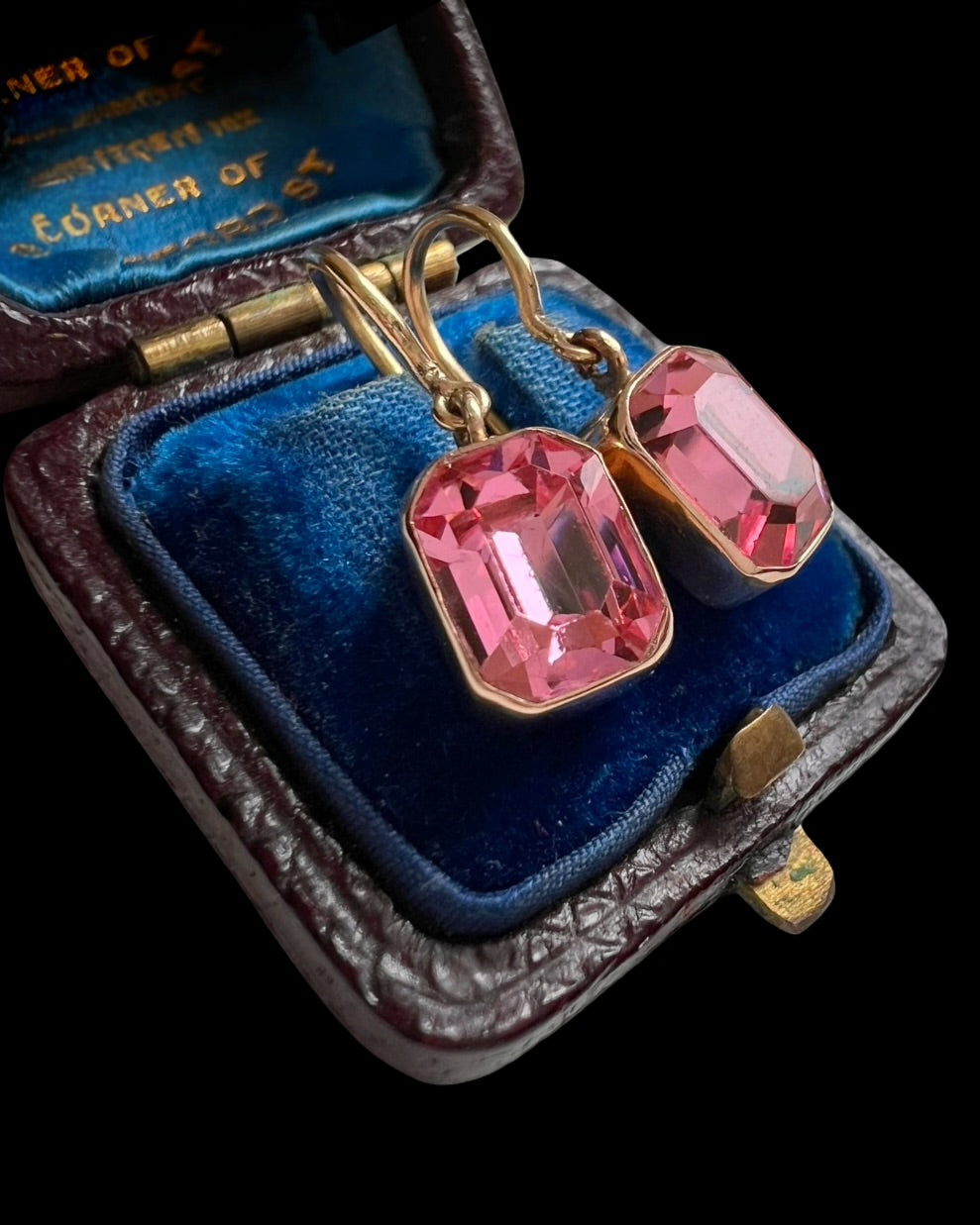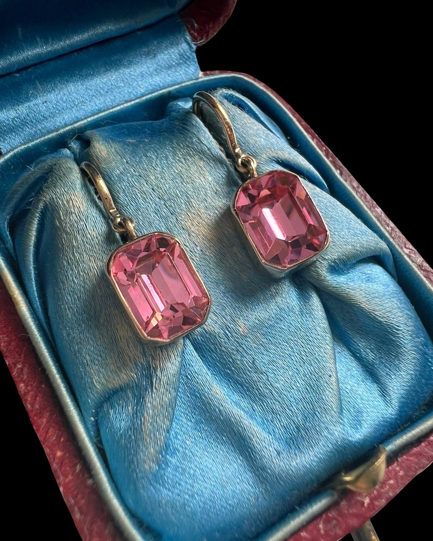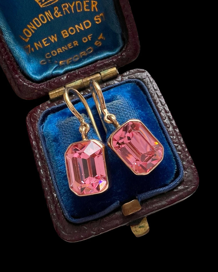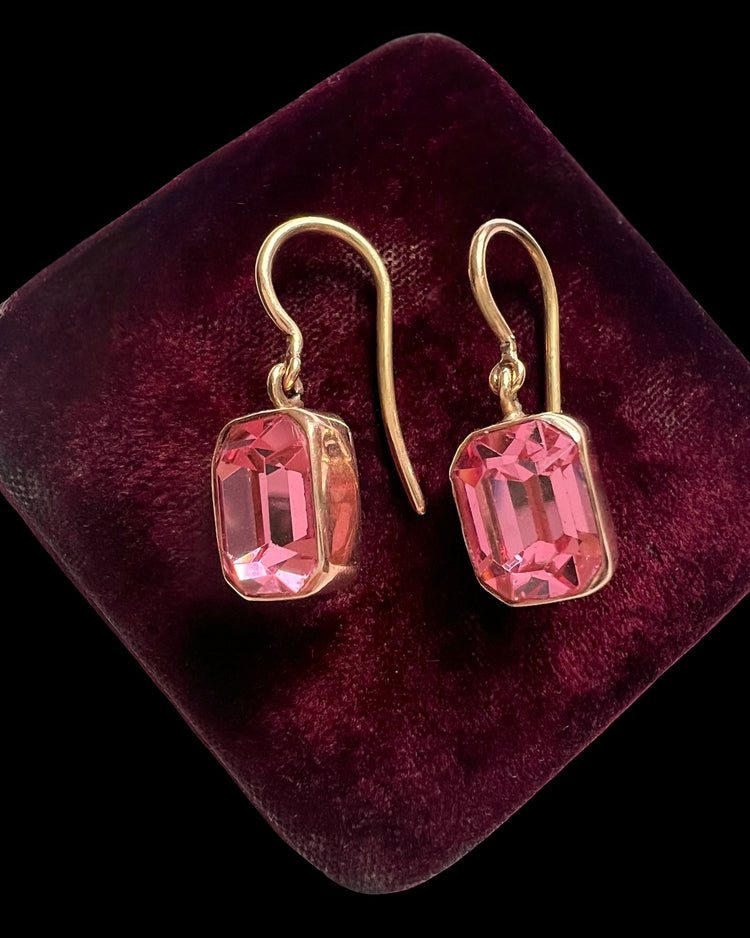 The pink paste stones are an octagonal cut with large tables, allowing plenty of light into the stones.