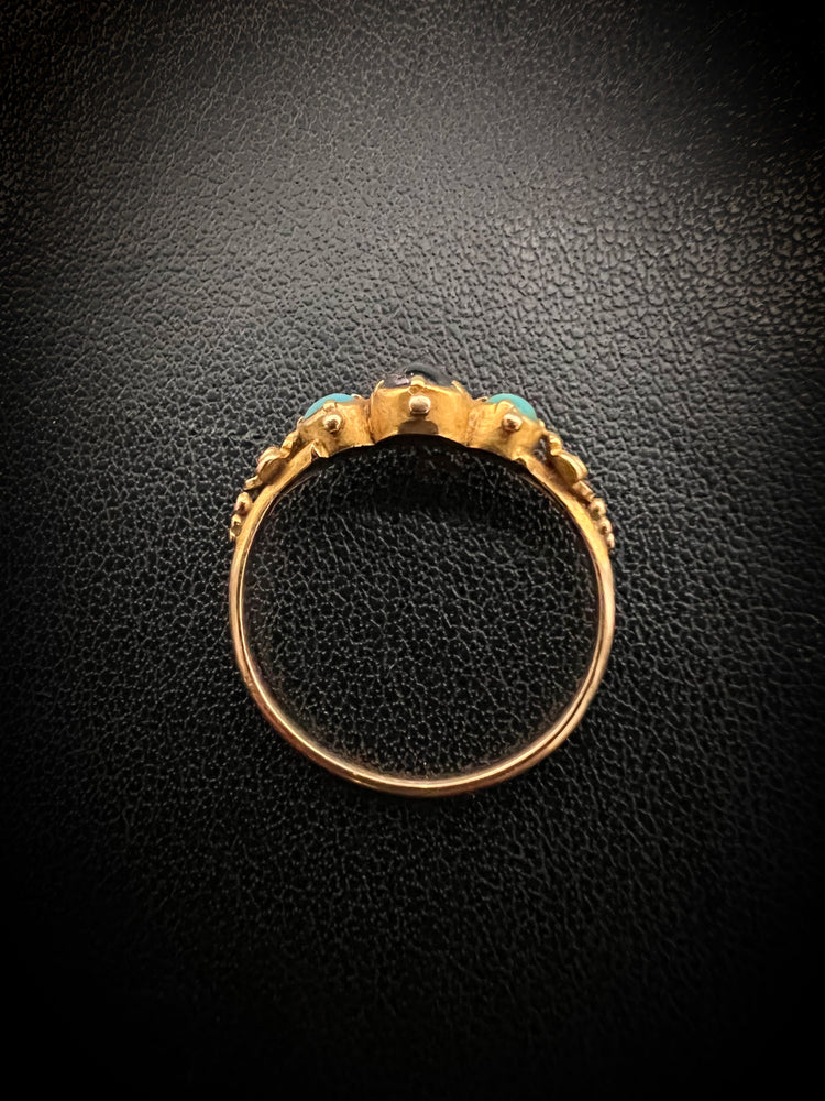A late Georgian 15ct gold ring with a cabochon garnet and two cabochon turquoise.