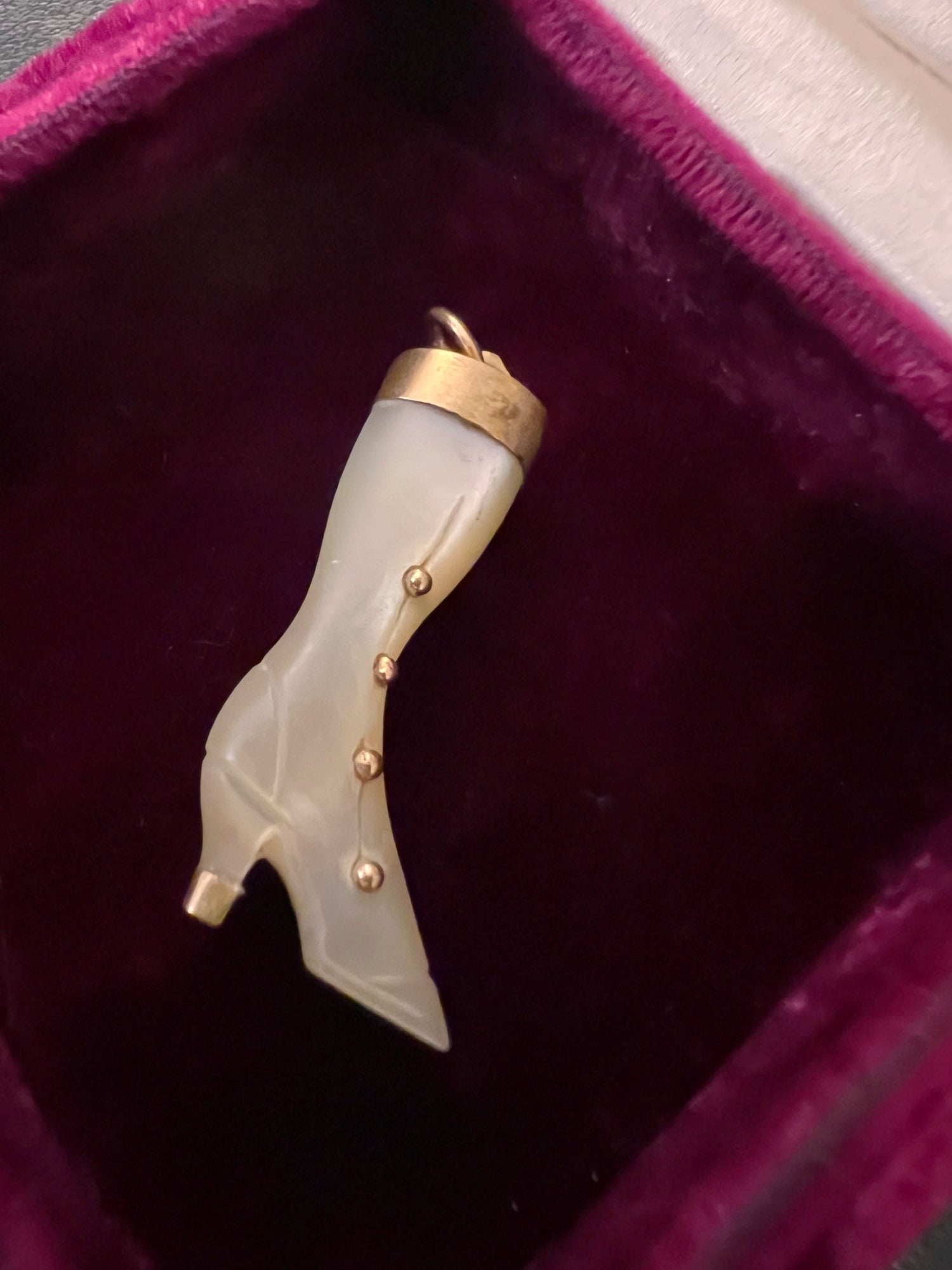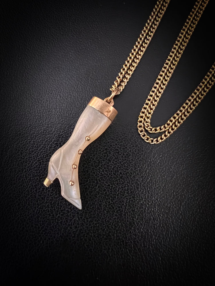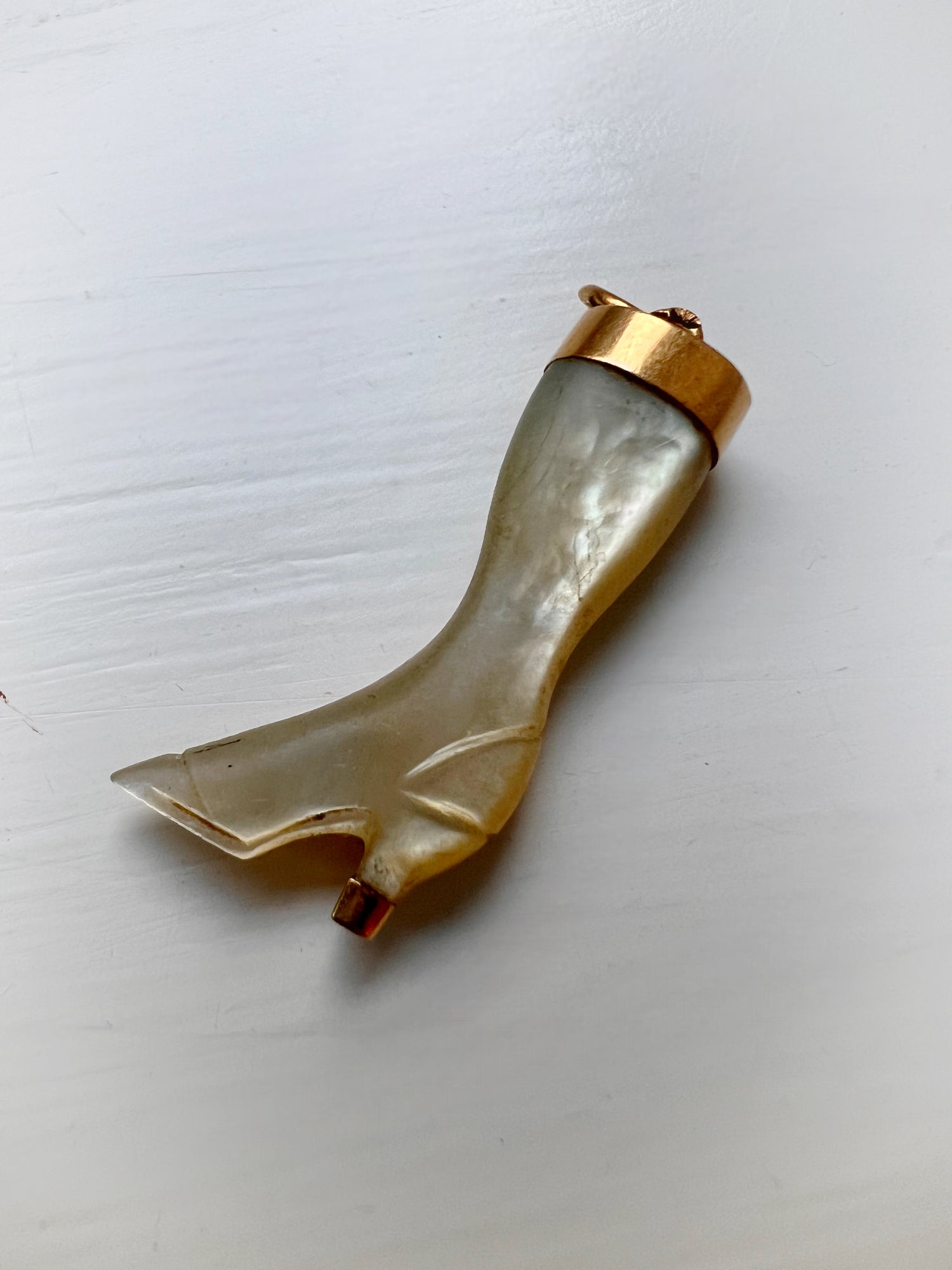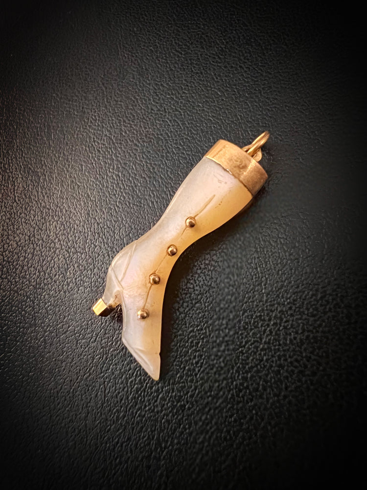 A super cool Victorian Mother of Pearl boot pendant, with high carat gold details.