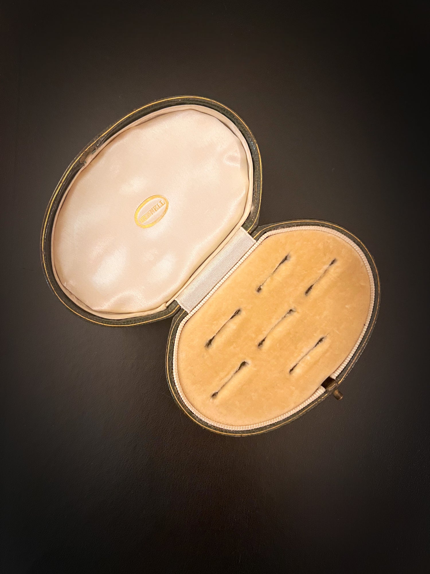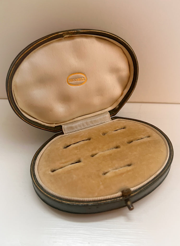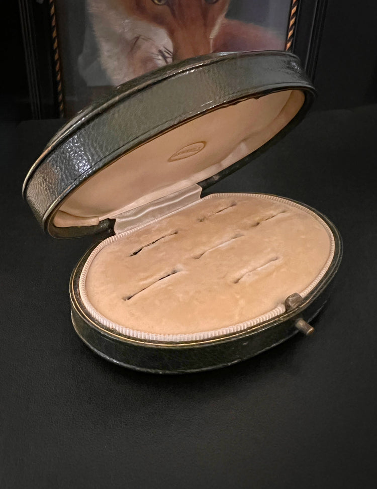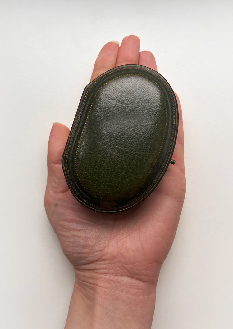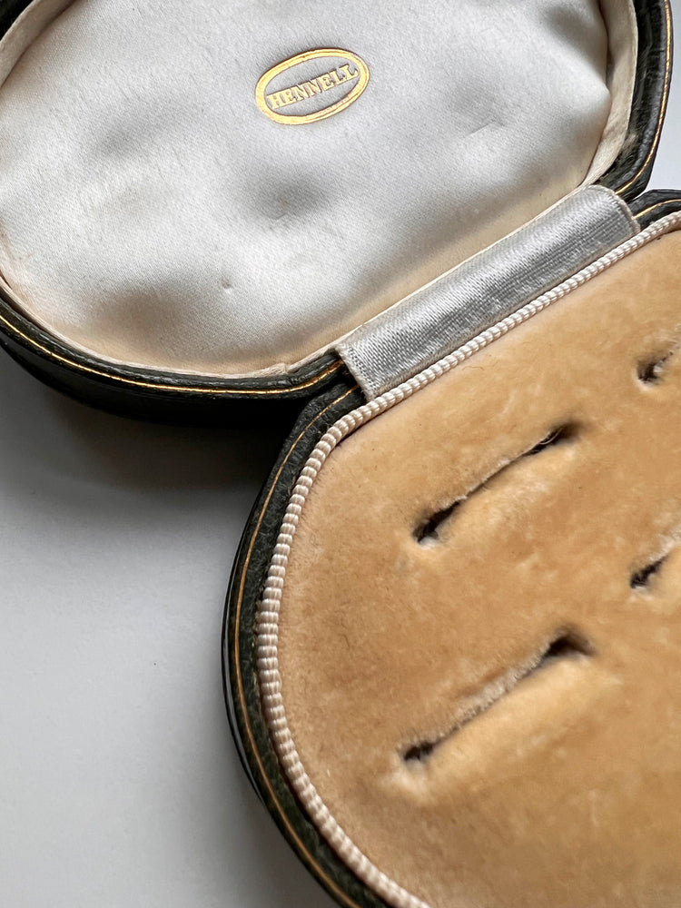 The oval moulded leather box is from the renowned silversmith and jeweller HENNELL.