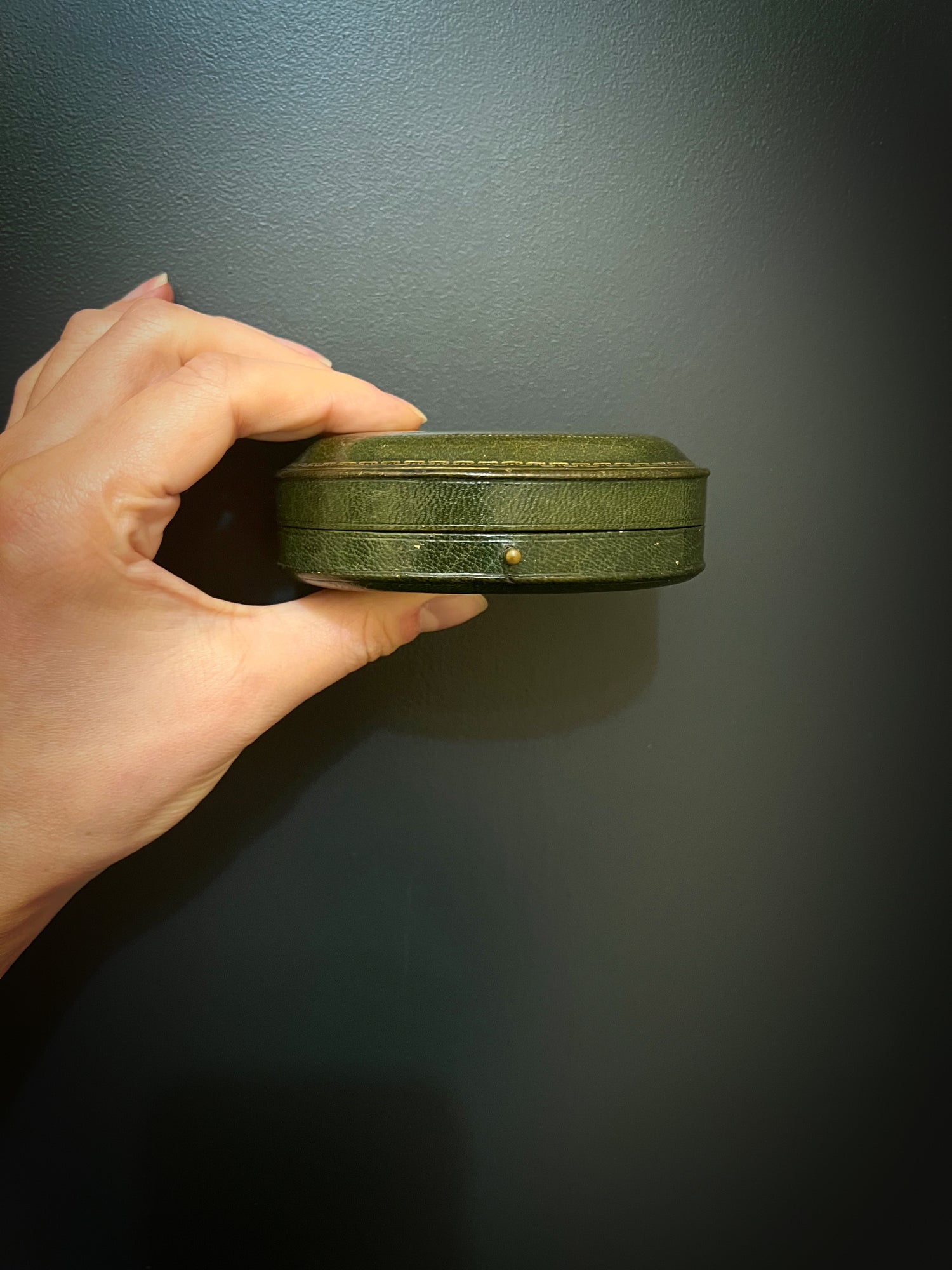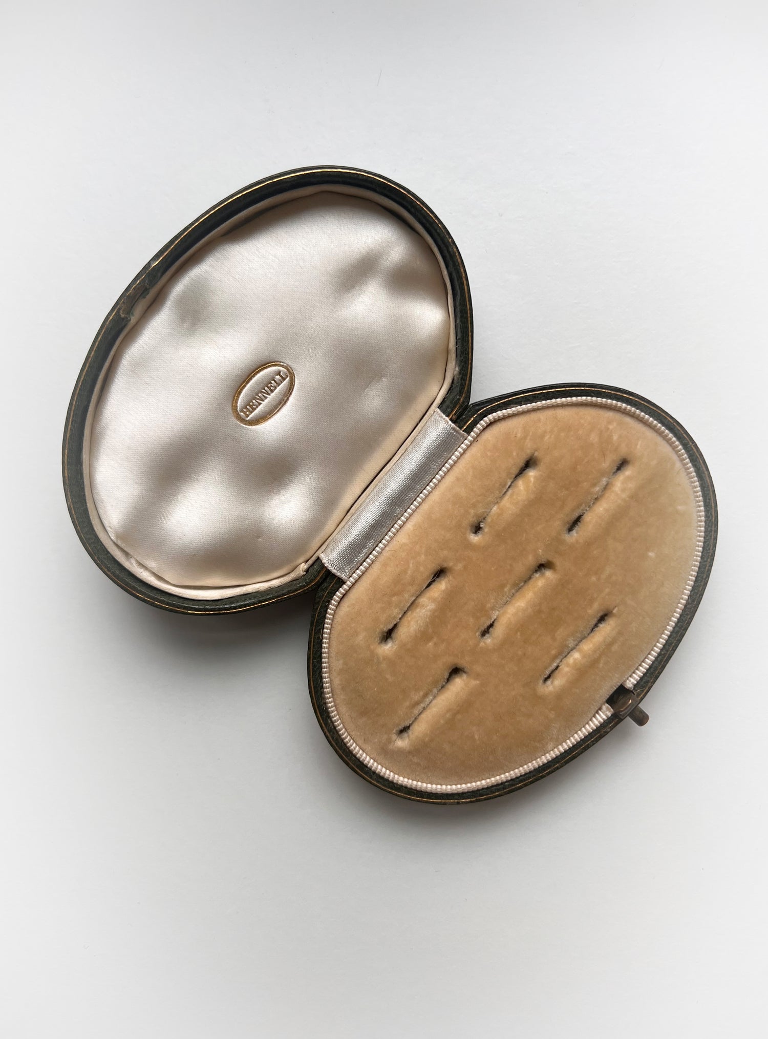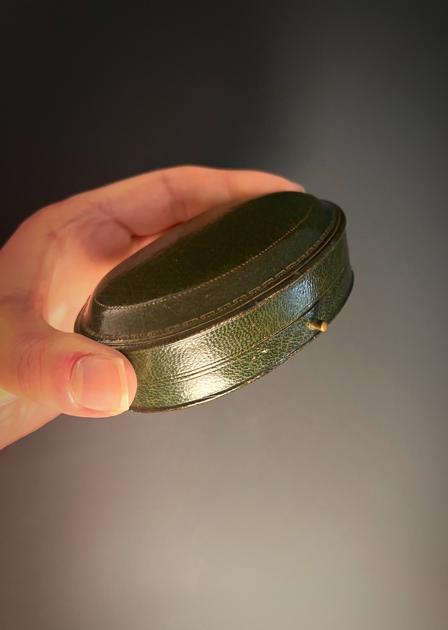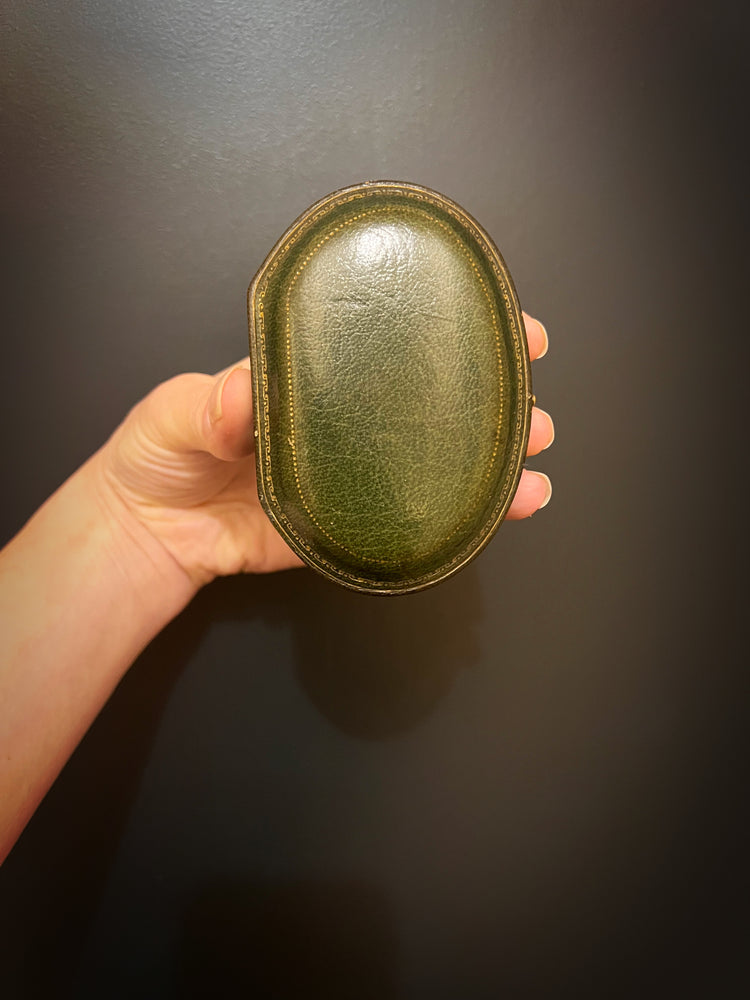 The oval moulded leather box is from the renowned silversmith and jeweller HENNELL.