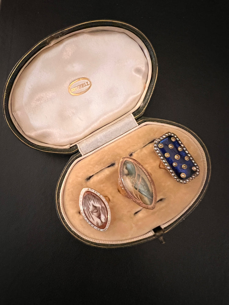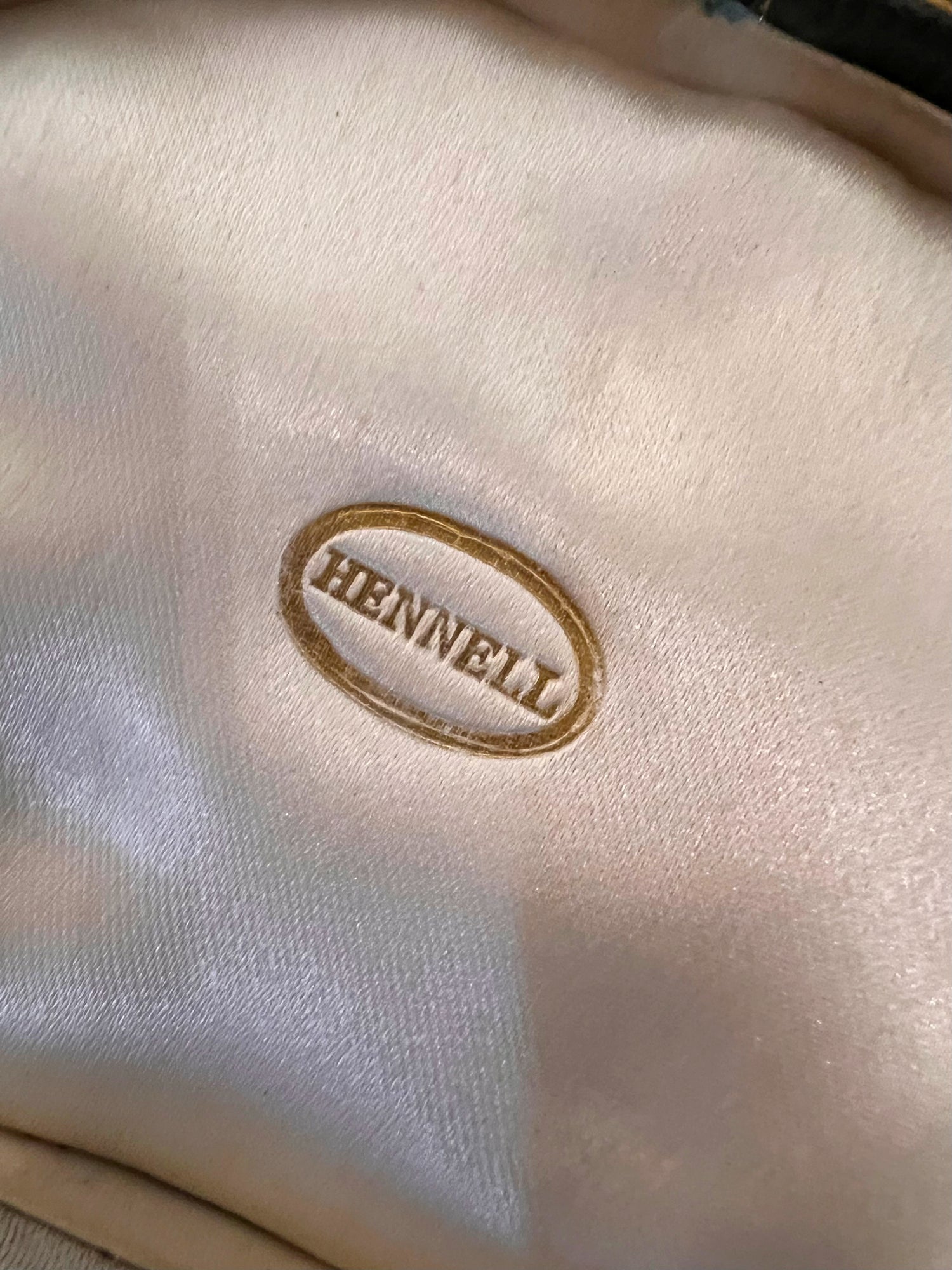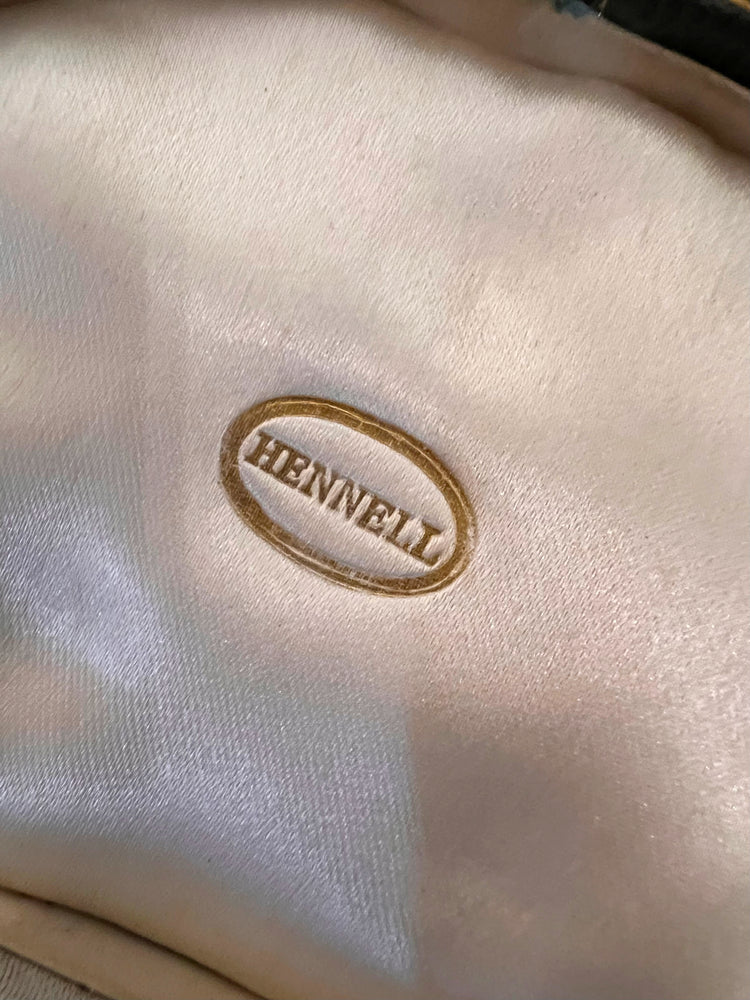 Inside the ring pad is made of cream velvet and a silk lid with a gold Hennell logo.