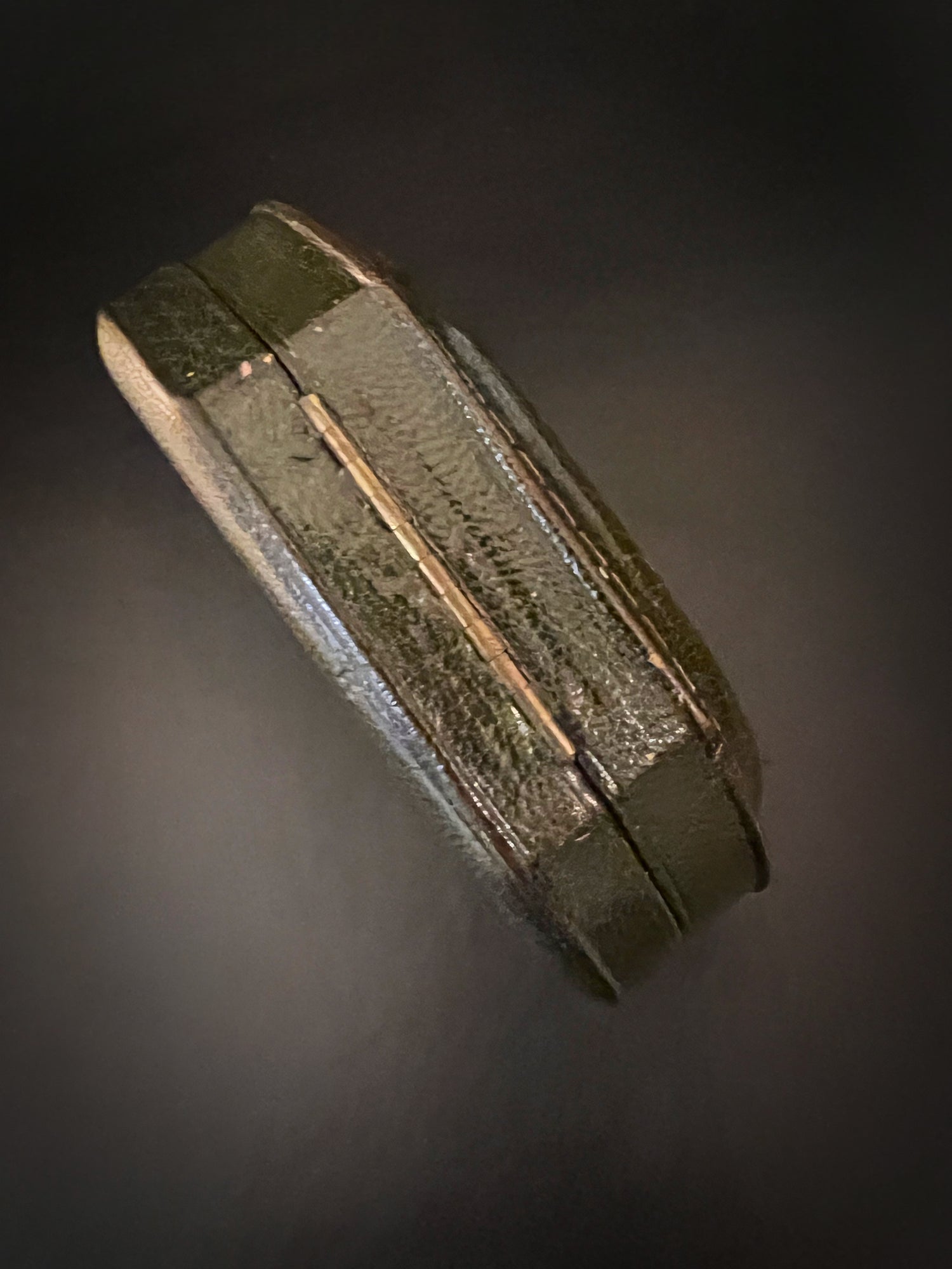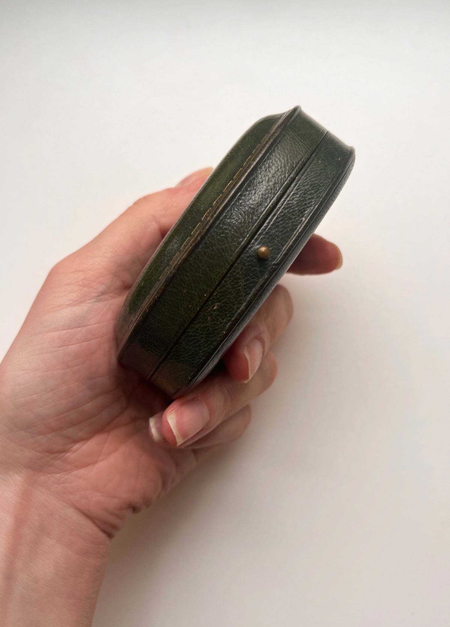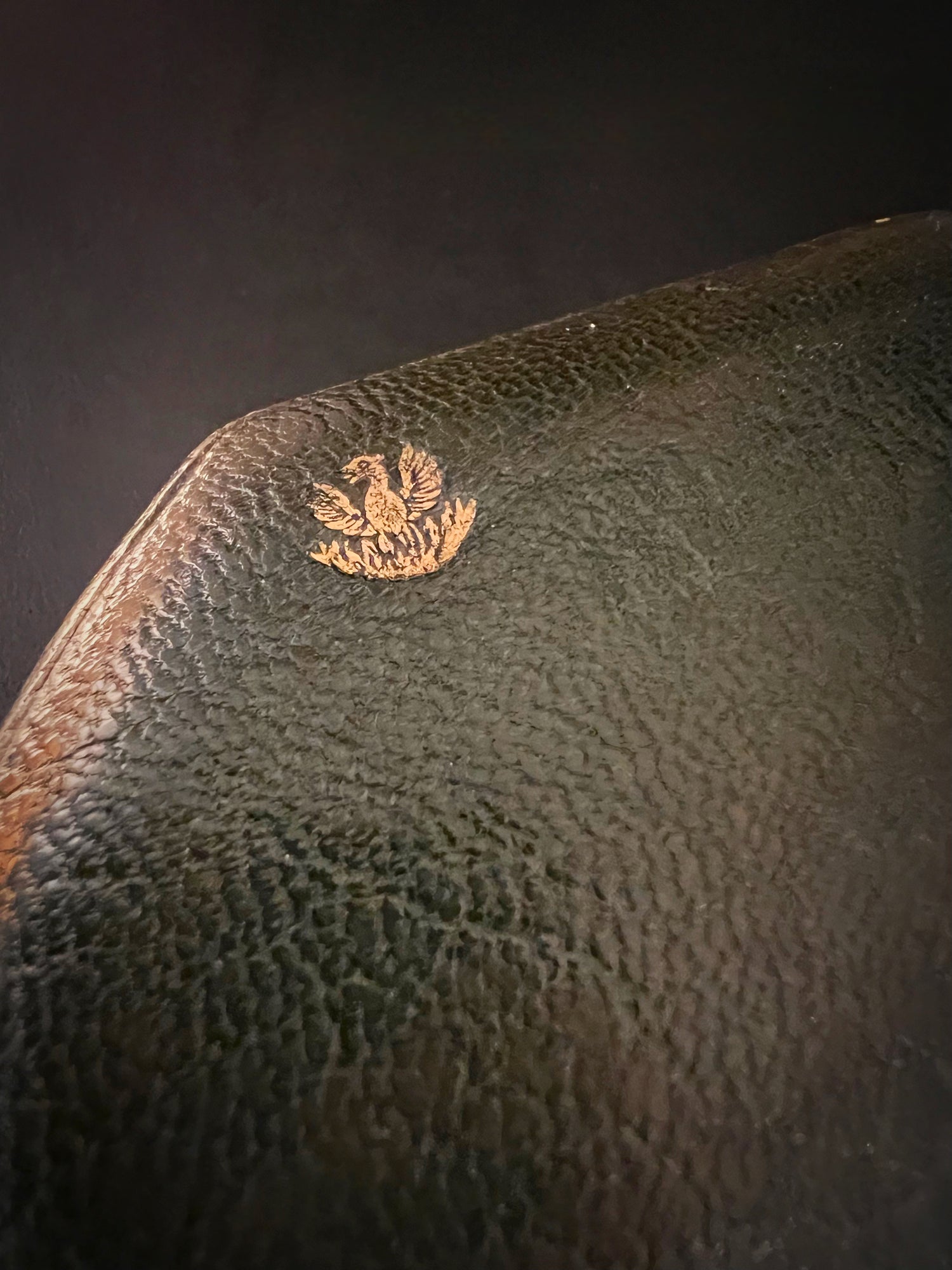 The external of the box is in excellent condition with gold tooling around the lid. The base of the box bears a tiny gold winged Griffin.