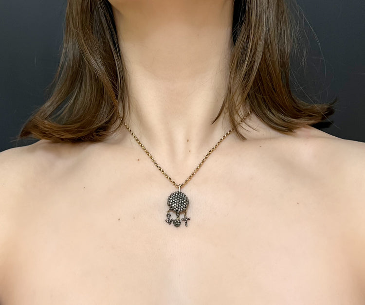 The pendant has a trilogy of tiny cut steel charms - A cross, an anchor and a heart.